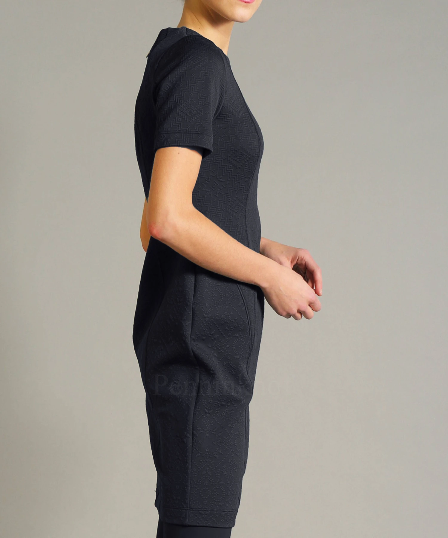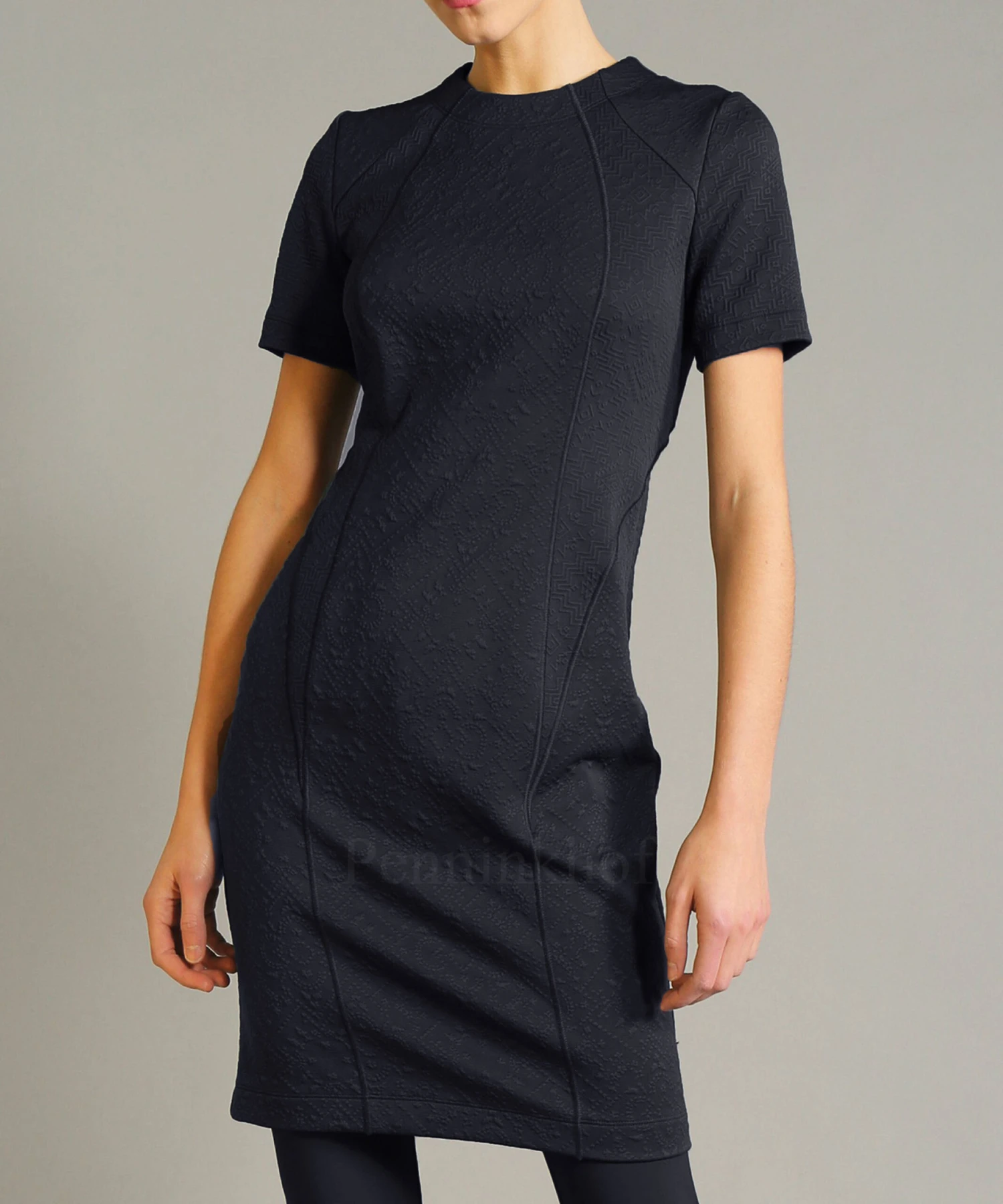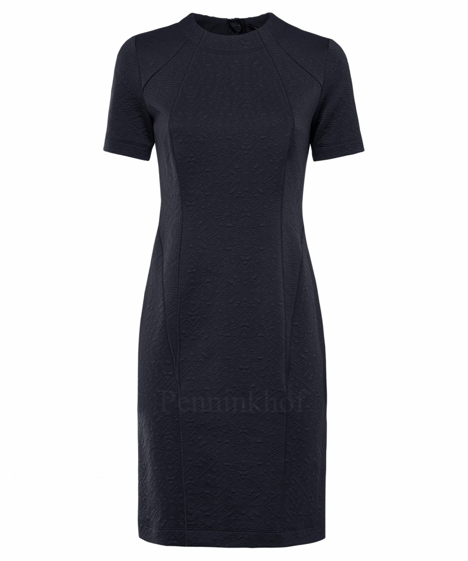 Een jurk van High in de kleur marineblauw. De stof heeft 2 gesmokte patronen waarvan één in een mozaïek patroon. Aan de achterzijde is een rits tot onder de taille. De jurk heeft meerdere stiknaden en korte mouwen. deze jurk mag op de hand worden gewassen.