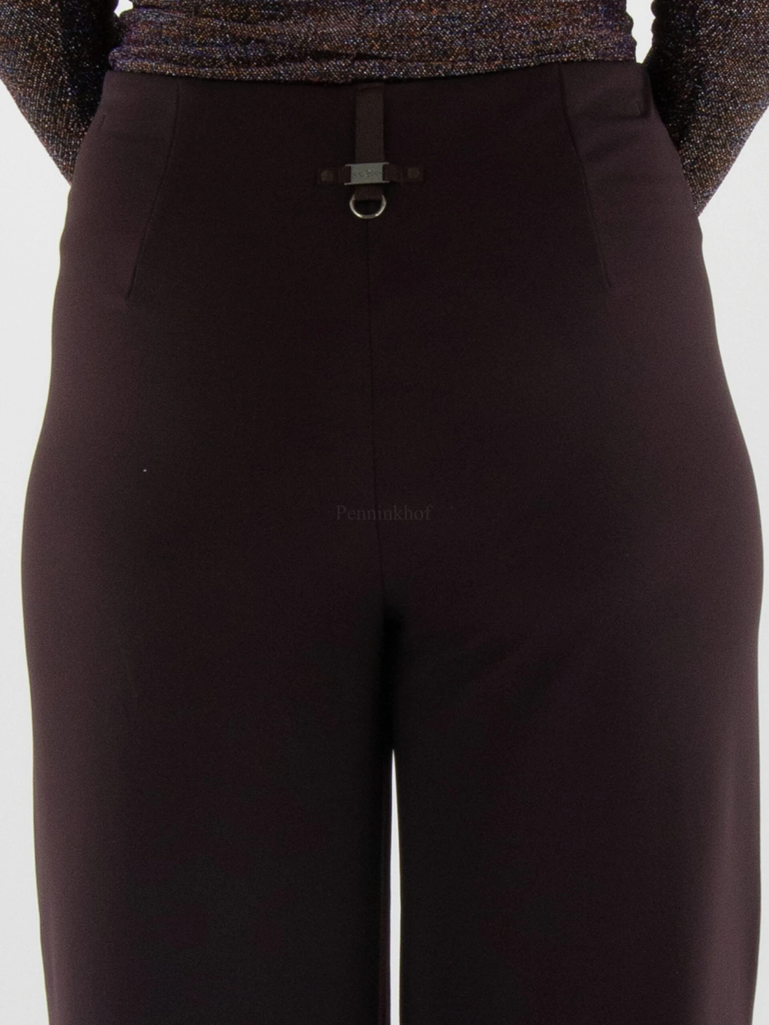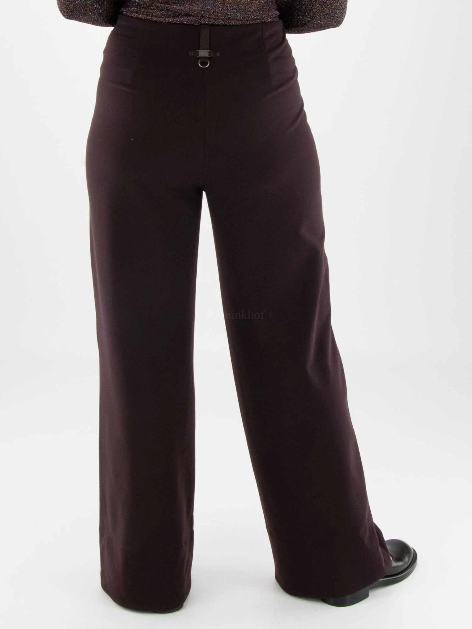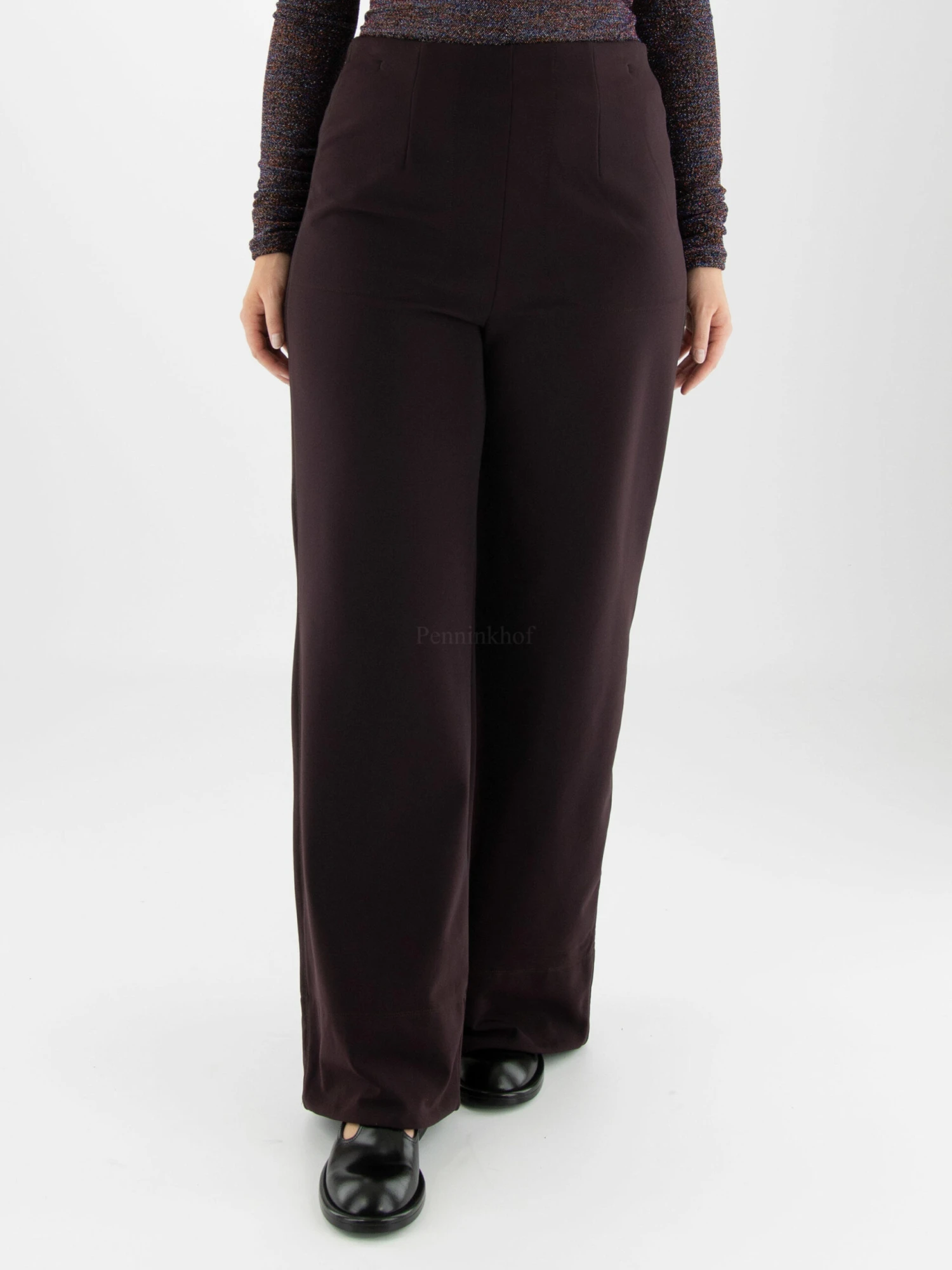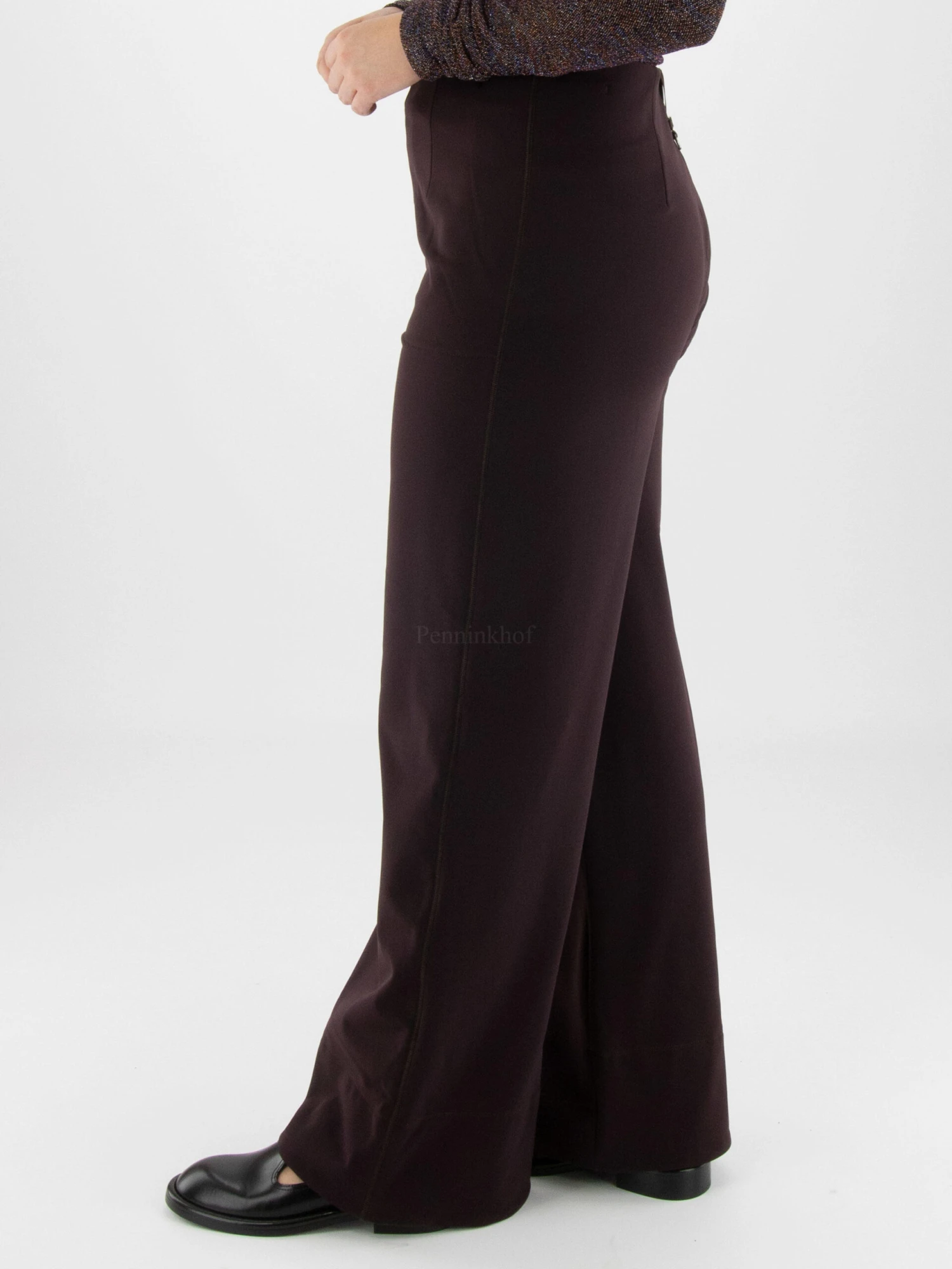 Een gewatteerde wijde broek van High in de kleur aubergine. Deze broek mag op 30 graden worden gewassen.