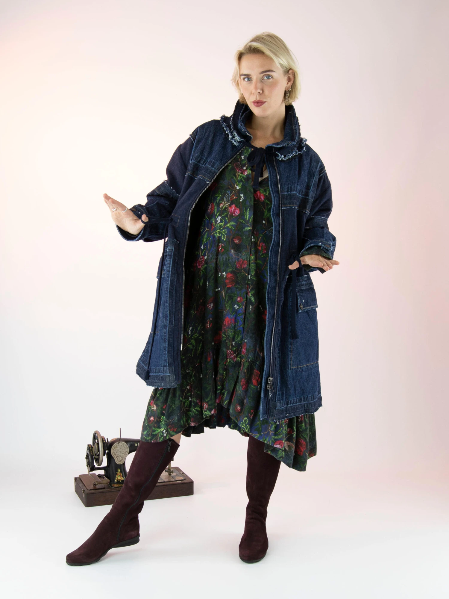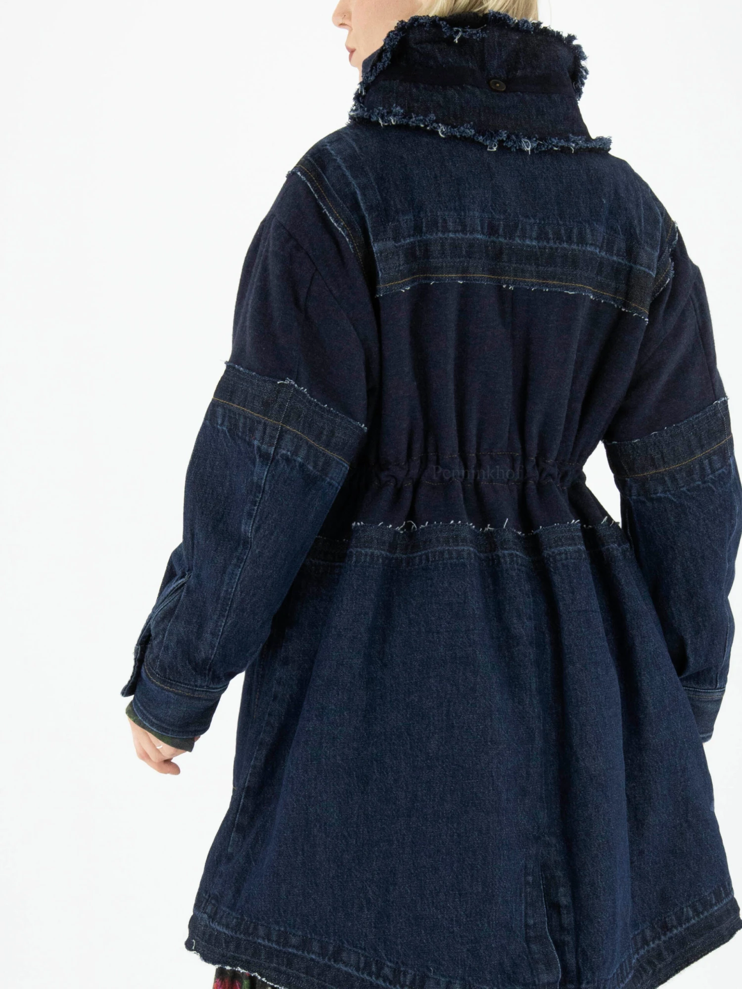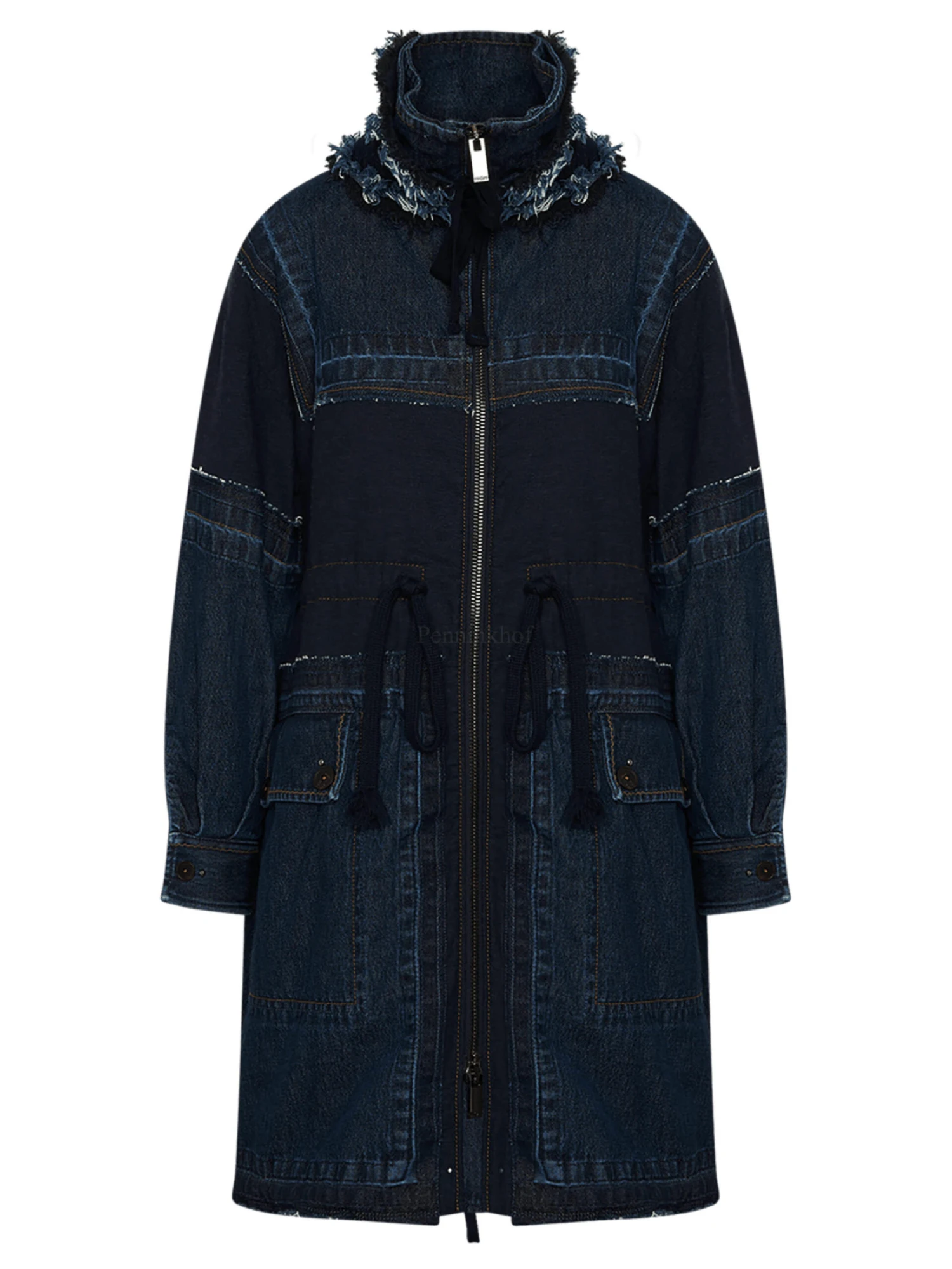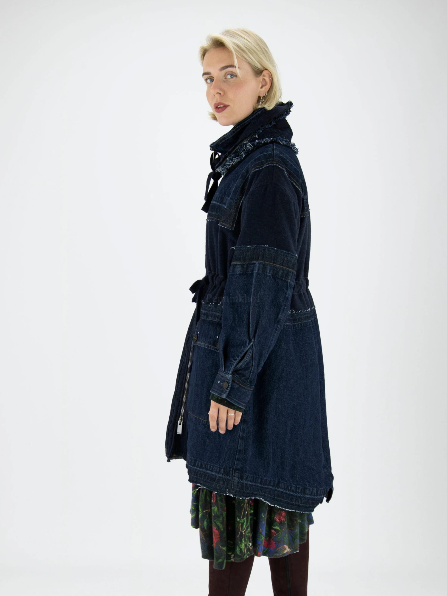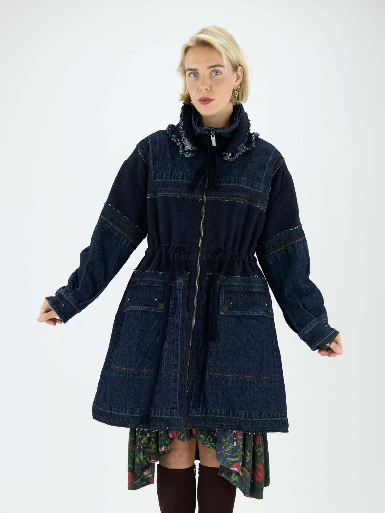 Een coat van High in meerdere kwaliteiten jeans in de kleur dark denim. De coat heeft een zilver kleurige ritssluiting. In de kraag is een extra losse dubbele kraag met gerafelde randen en een koord aan beide uiteinden. De coat is gevoerd en mag niet worden gewassen.