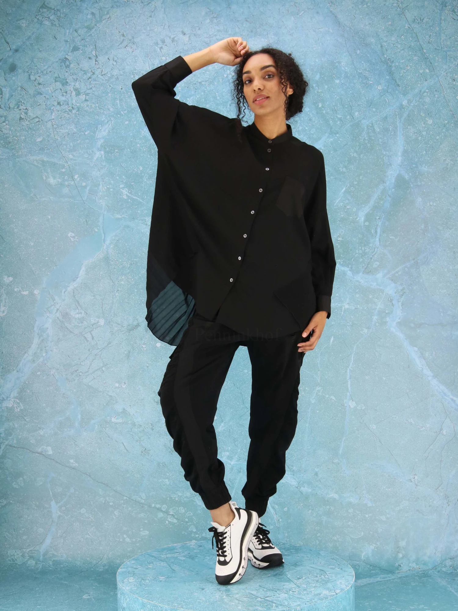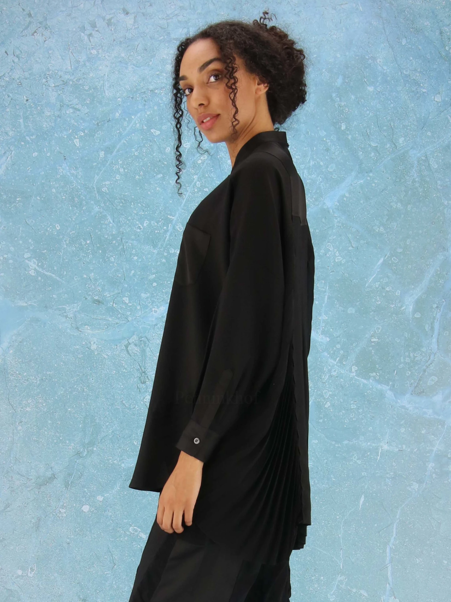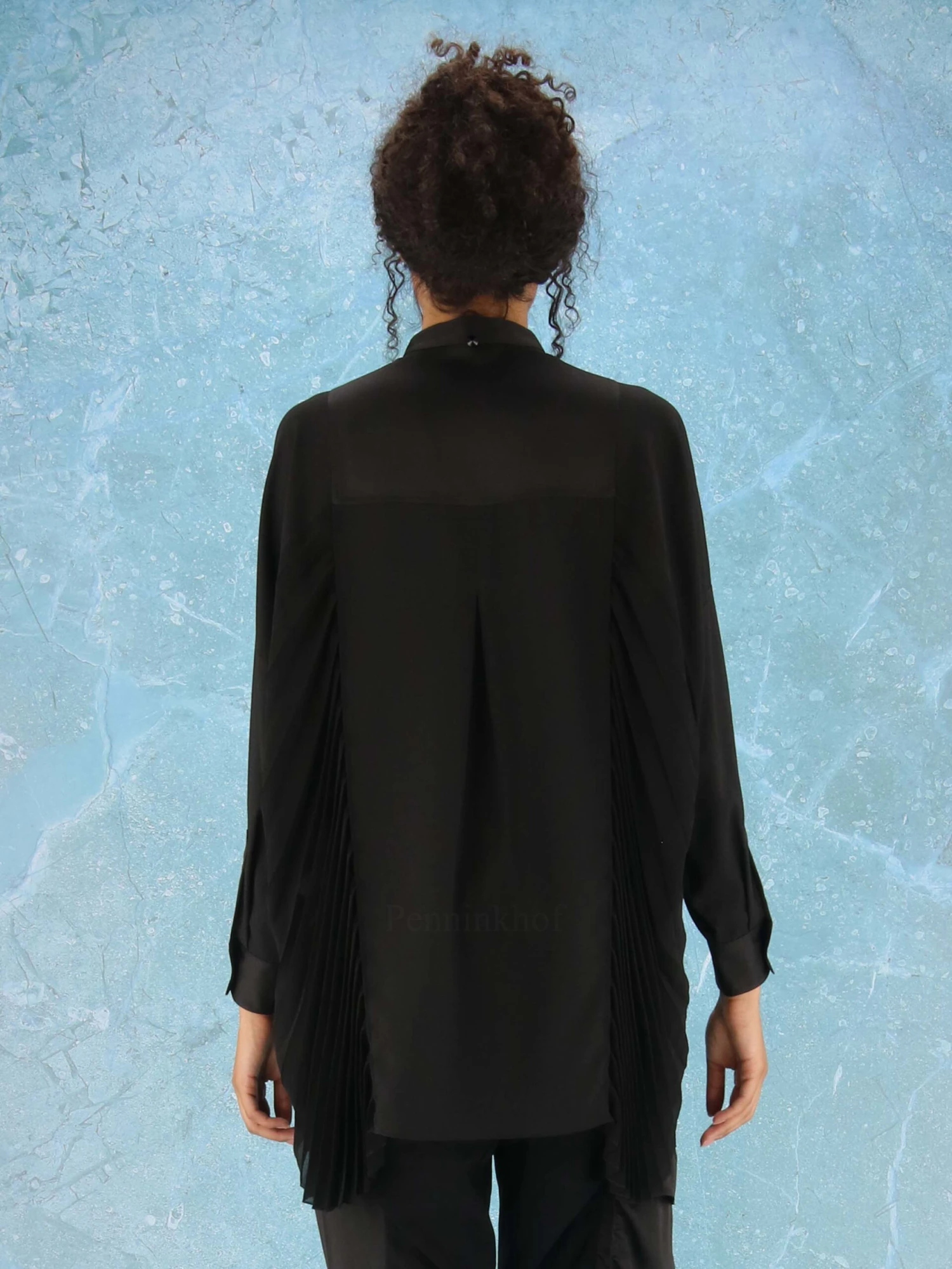 Een blouse van High in de kleur zwart. Aan de achterkant is vanuit de hals tot aan de schouders een mat satijnen stof. Vanaf de onderkant van de mouwen is de stof aan beide zijkanten geplisseerd. Deze blouse mag op de hand worden gewassen.