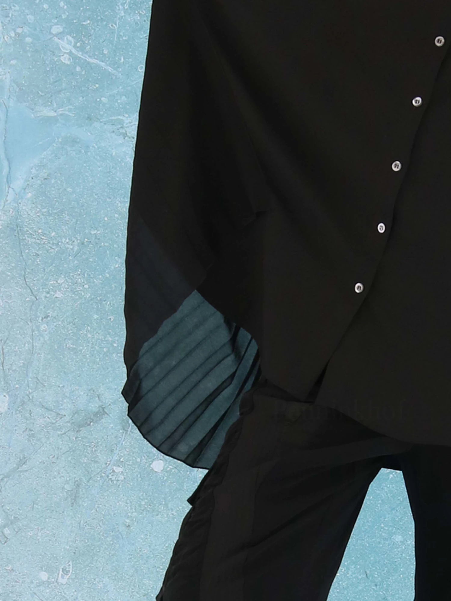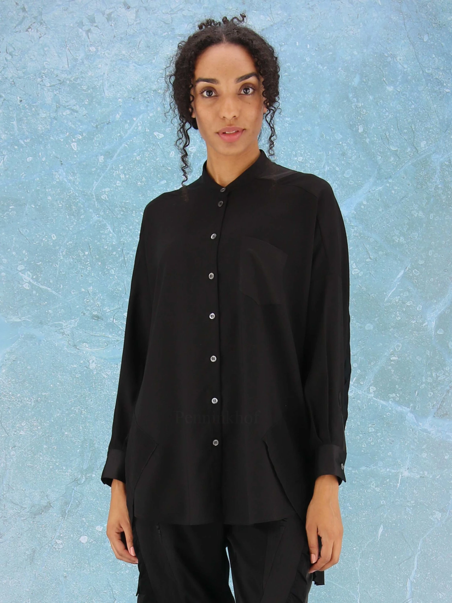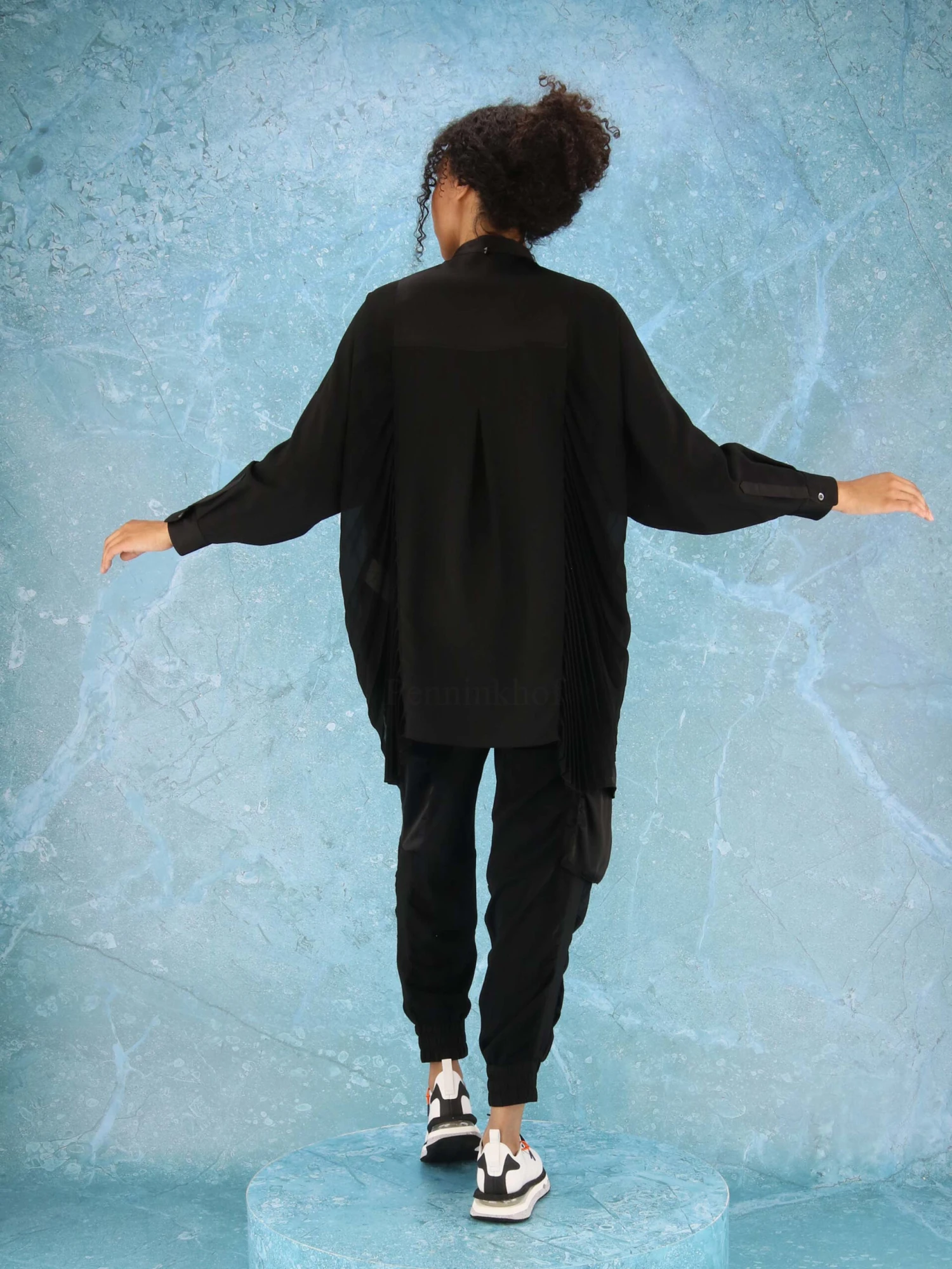 Een blouse van High in de kleur zwart. Aan de achterkant is vanuit de hals tot aan de schouders een mat satijnen stof. Vanaf de onderkant van de mouwen is de stof aan beide zijkanten geplisseerd. Deze blouse mag op de hand worden gewassen.