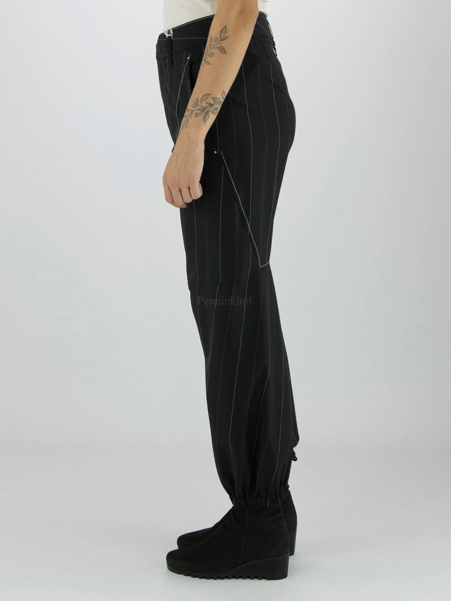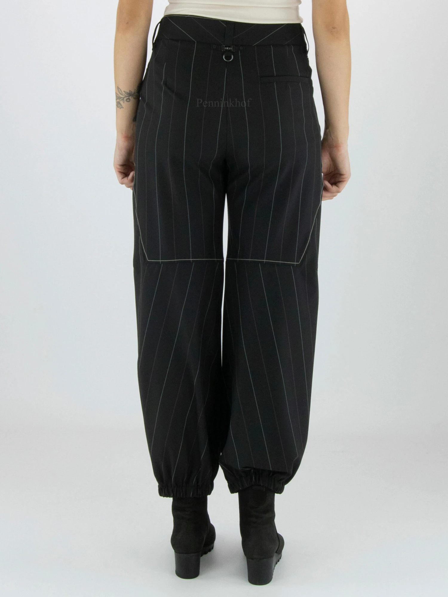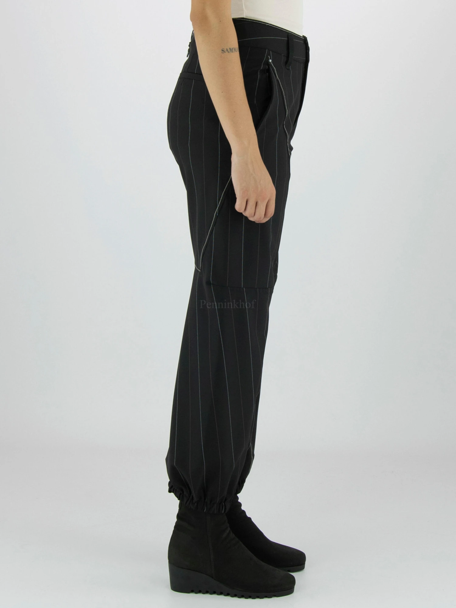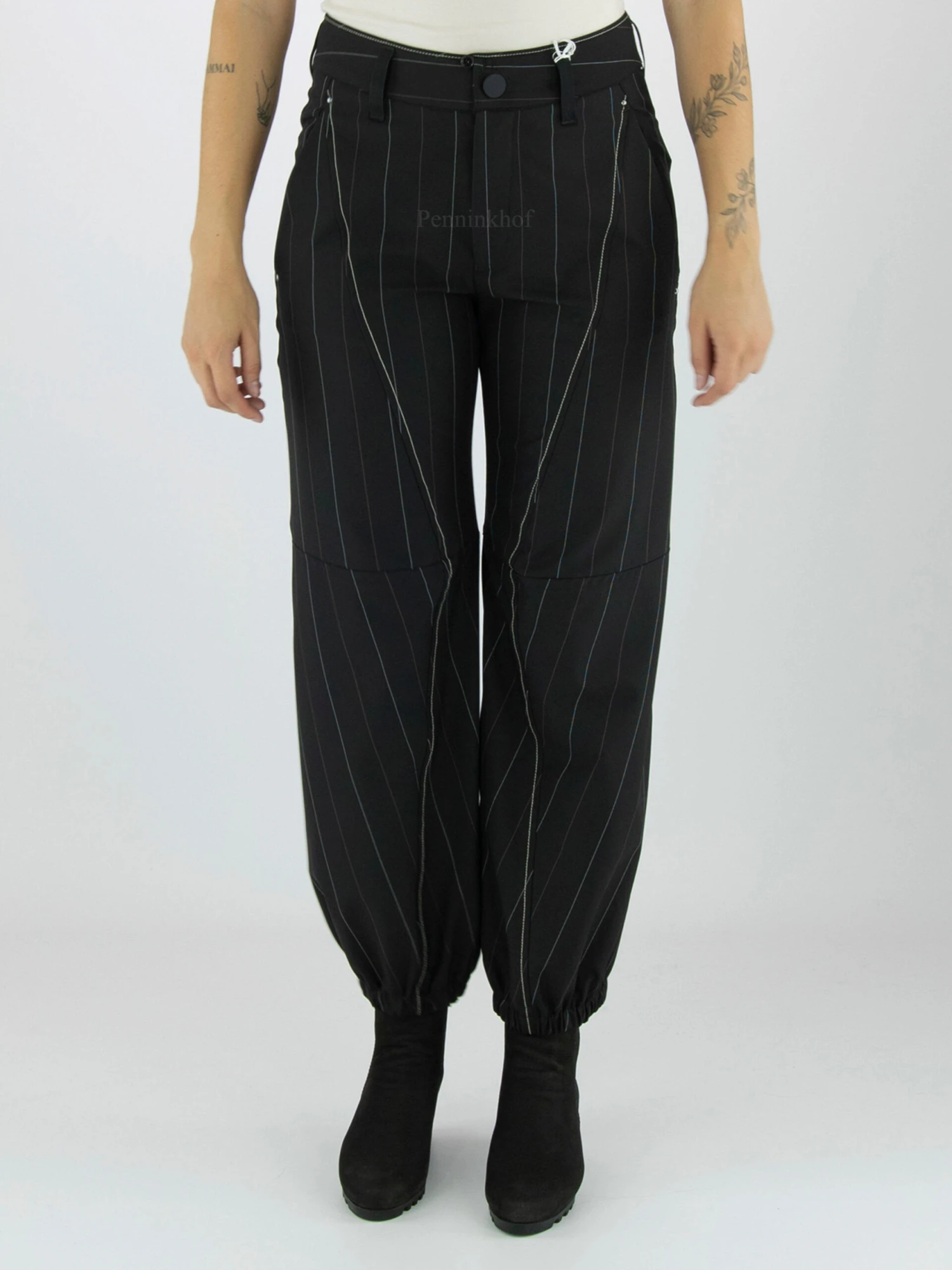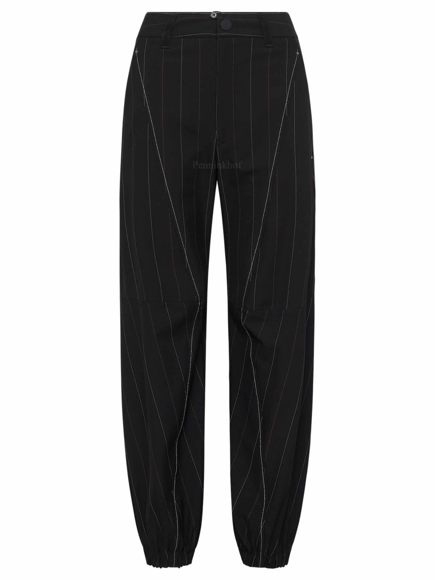 Een broek van High in een krijtstreep print met de kleuren wit en rood op een zwarte achtergrond. Langs de diagonalae stiknaden is een decoratieve helderwitte stikdraad. Aan de onderkant is de rand met een geplooid elastiek. De broek heeft steekzakken en mag op 30 graden worden gewassen.