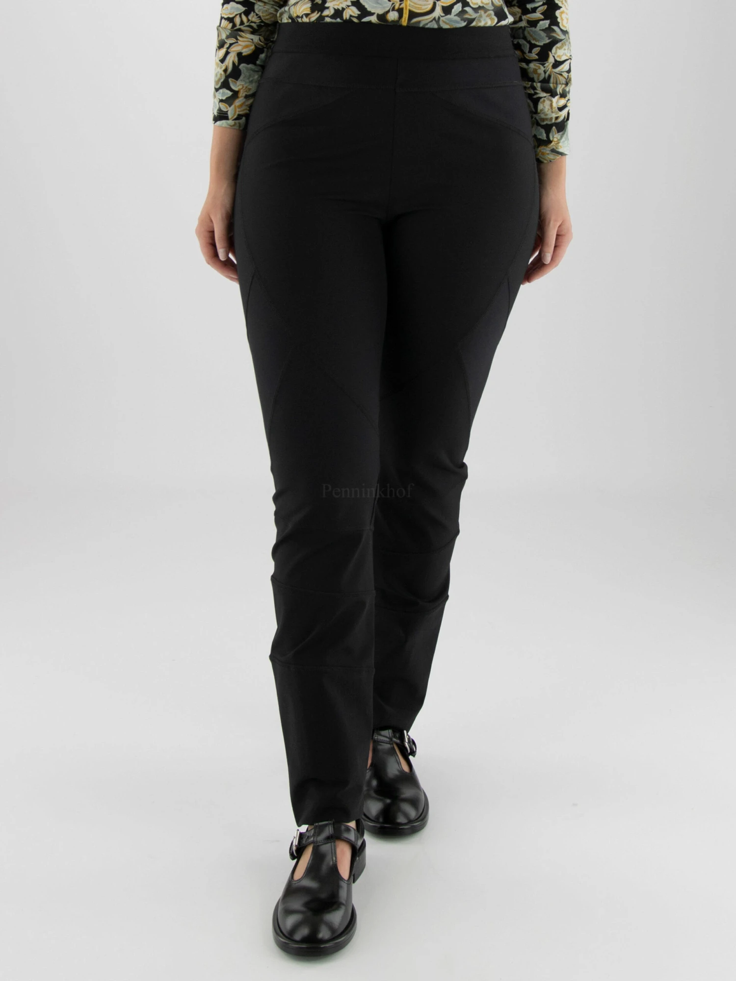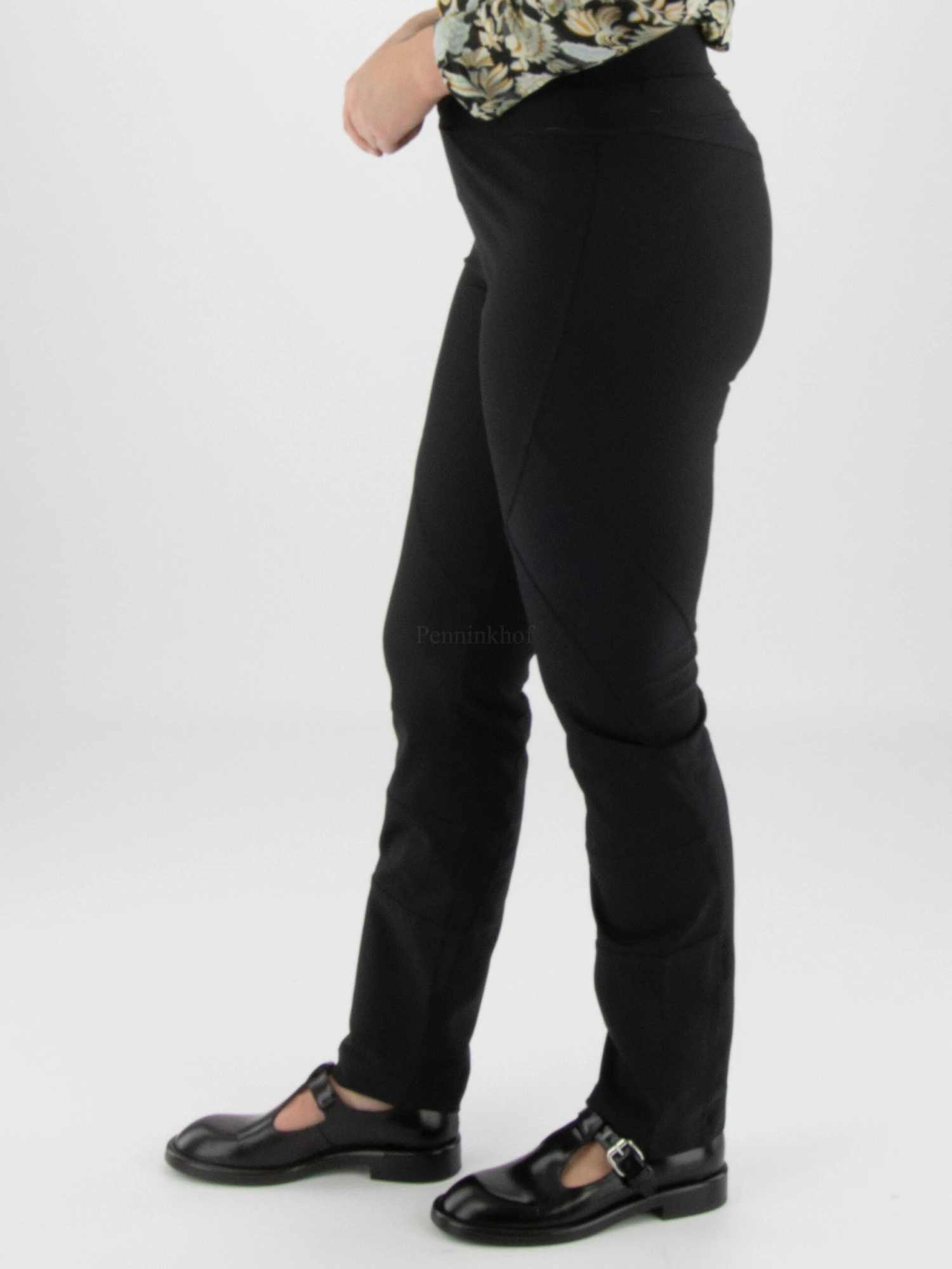Een broek van High in de kleur zwart. In de taille is een elastieken band. Aan de onderkant is een de stof fijn geribbeld. De broek heeft meerdere decoratieve stiknaden en mag op de hand worden gewassen.