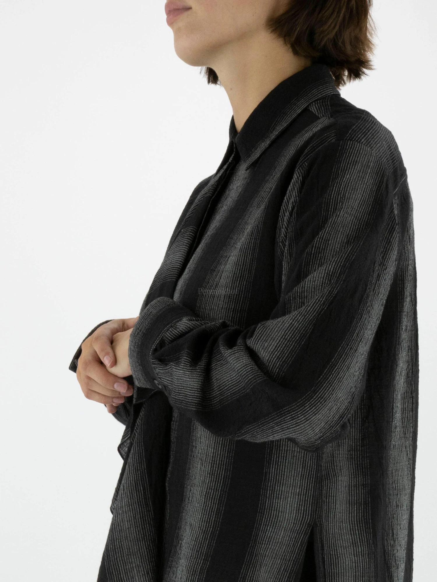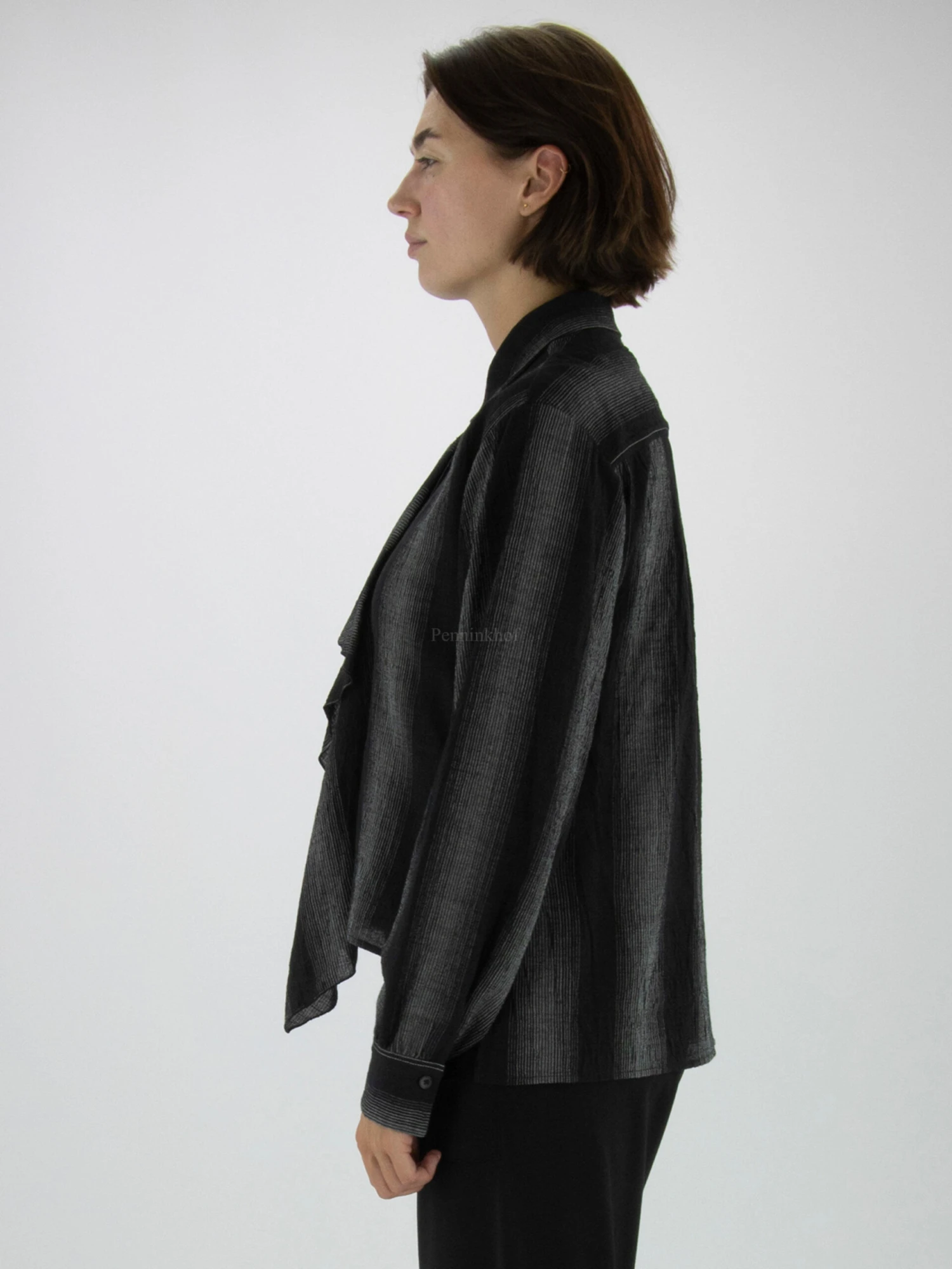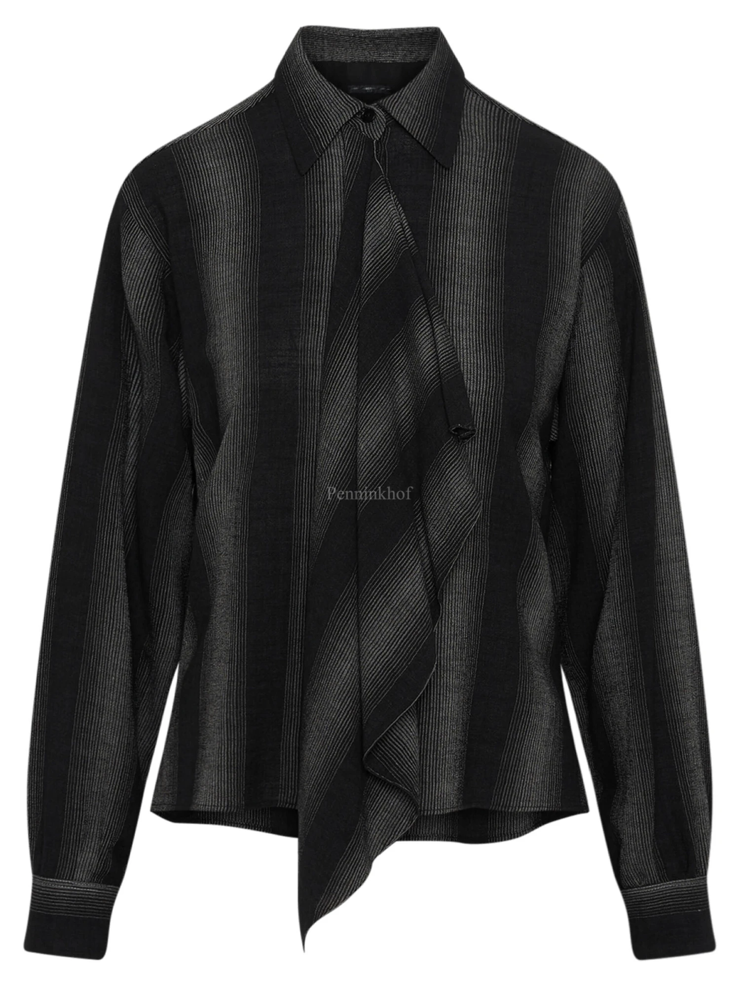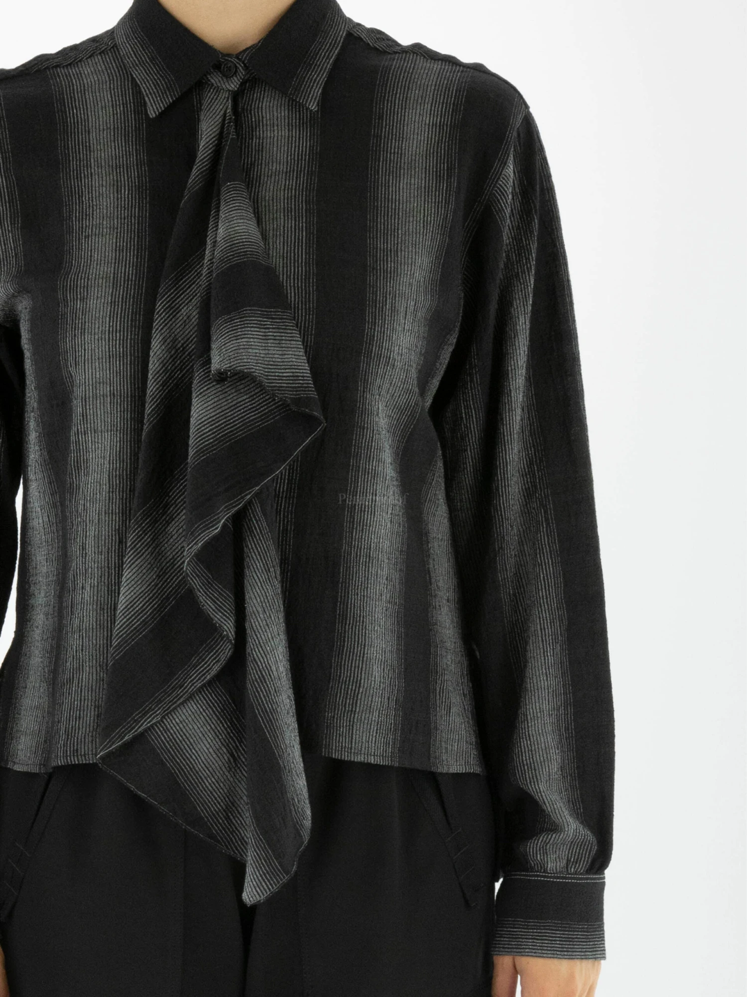 Een blouse van High in een grafische strepen patroon met de kleuren zwart en lichtgrijs. Vanuit het midden is aan de voorkant langs de sluiting ectra stof die valt als een folange. Deze blouse mag niet worden gewassen.