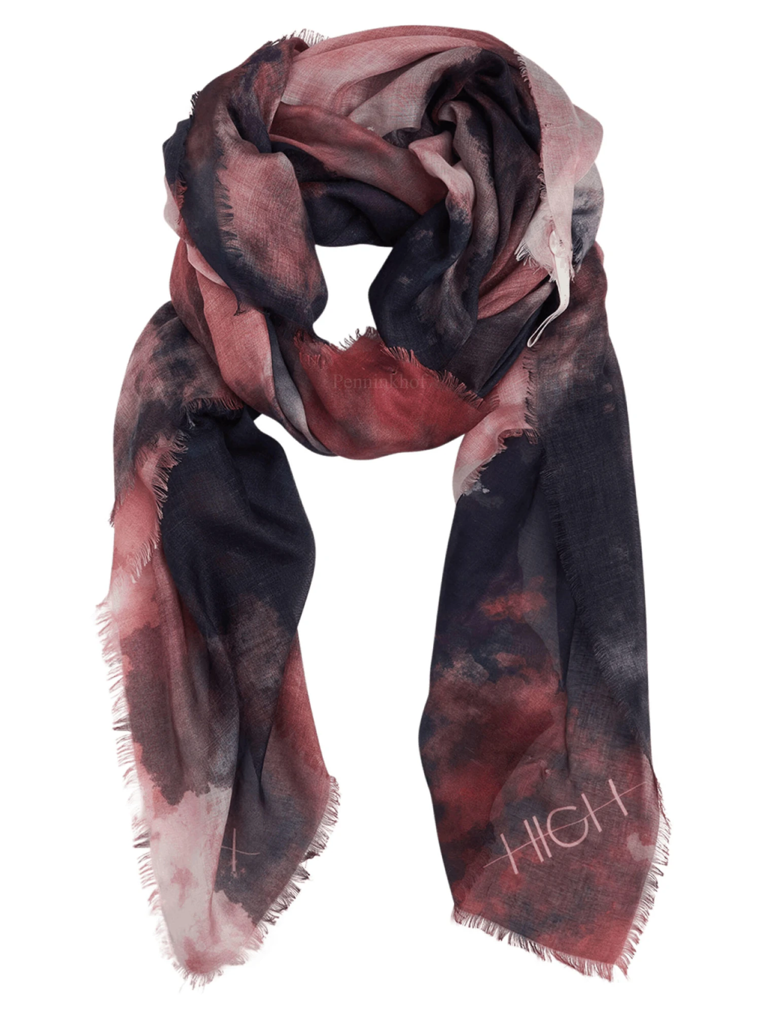 Een luxe en licht transparante shawl van High in een aquarelprint met meerdere tinten koraalrood, blauw en roomwit. De randen van de shawl zijn fijn gerafeld. Deze shawl mag niet worden gewassen.