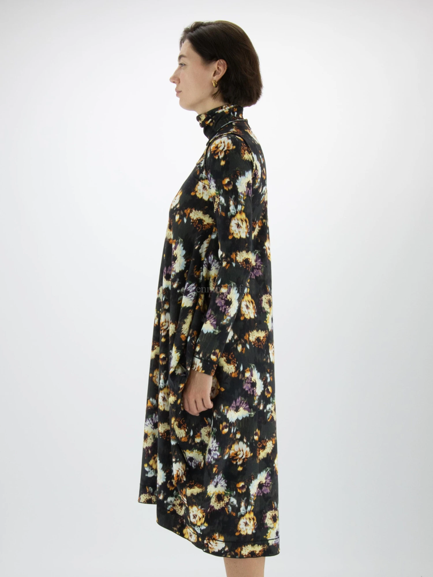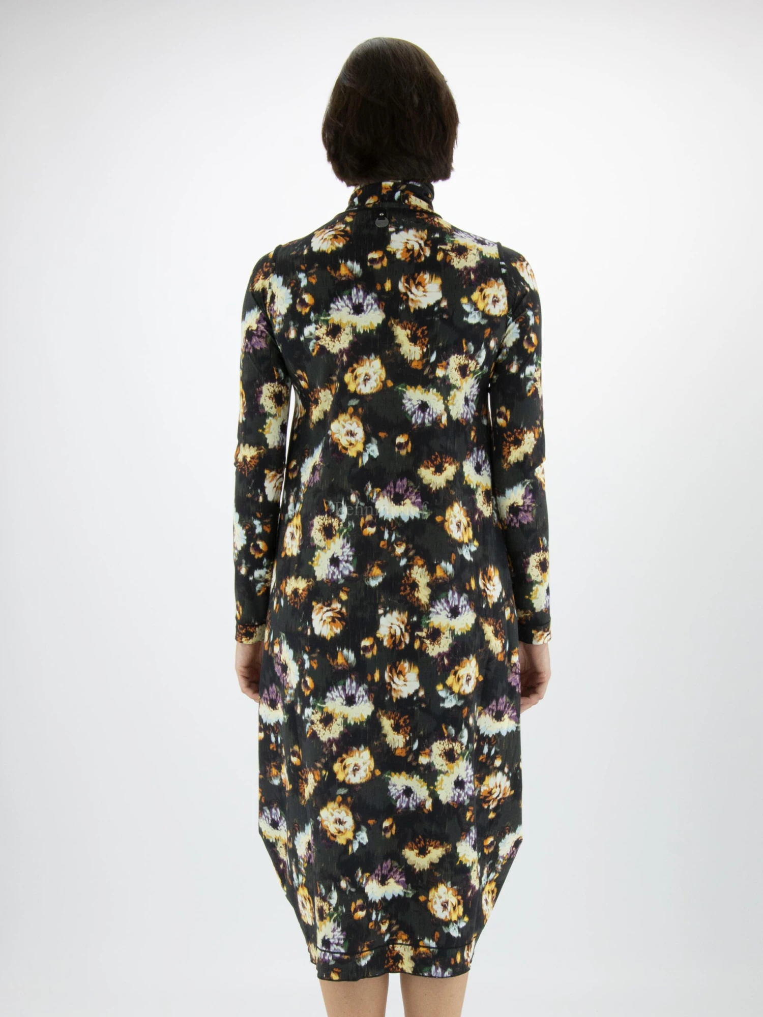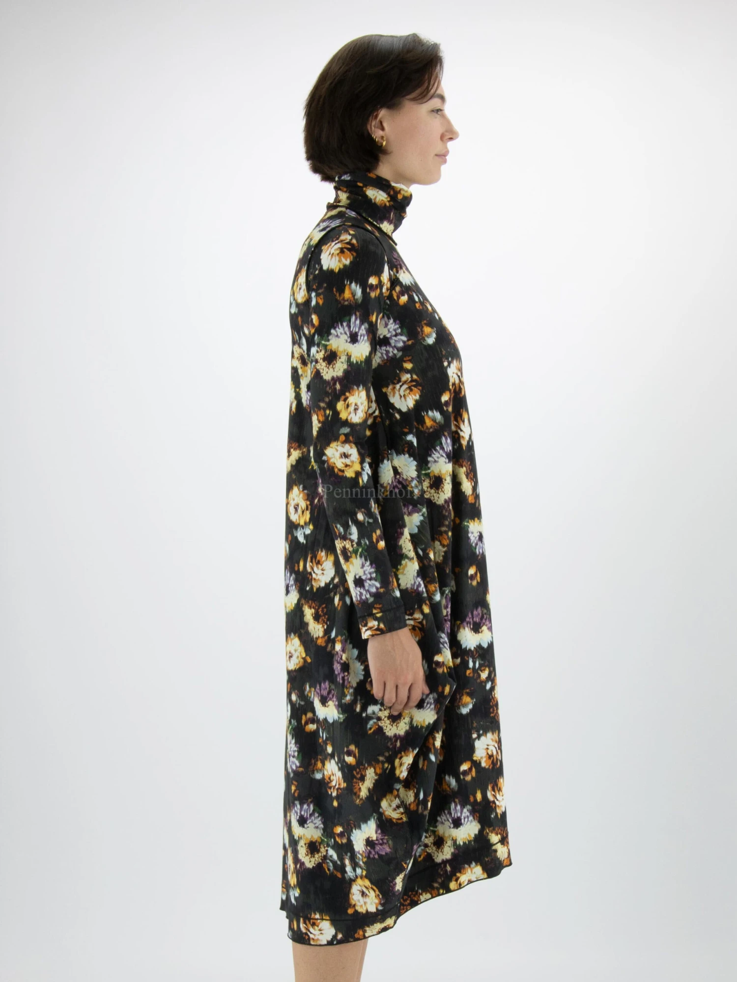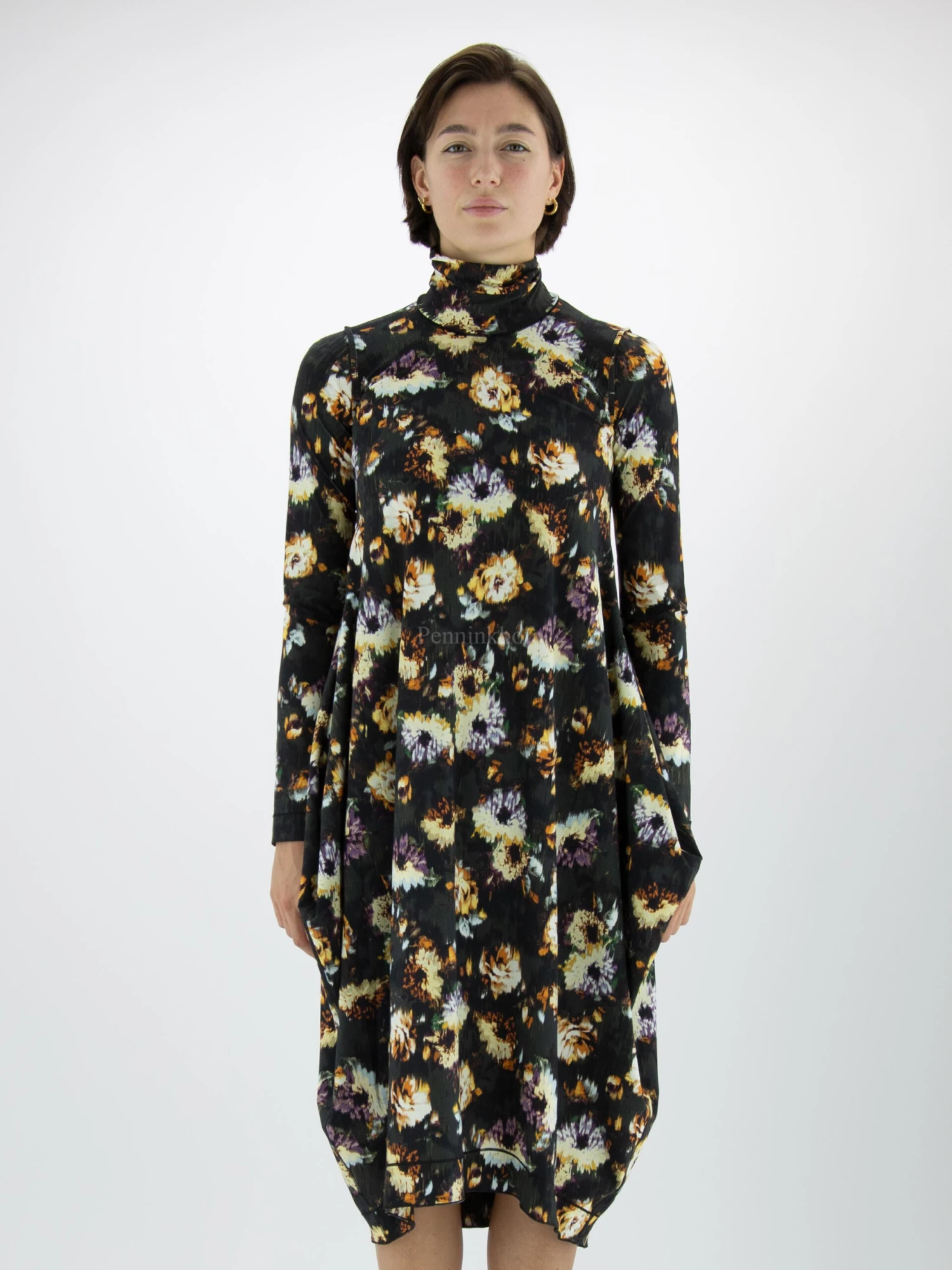Een jurk van High in een multi color bloemenprint op een khaki achtergrond. De jurk heeft een turtle hals. ter hoogte van de taille zijn steekzakken. De jurk heeft een ballonvorm en mag op 30 graden worden gewassen.