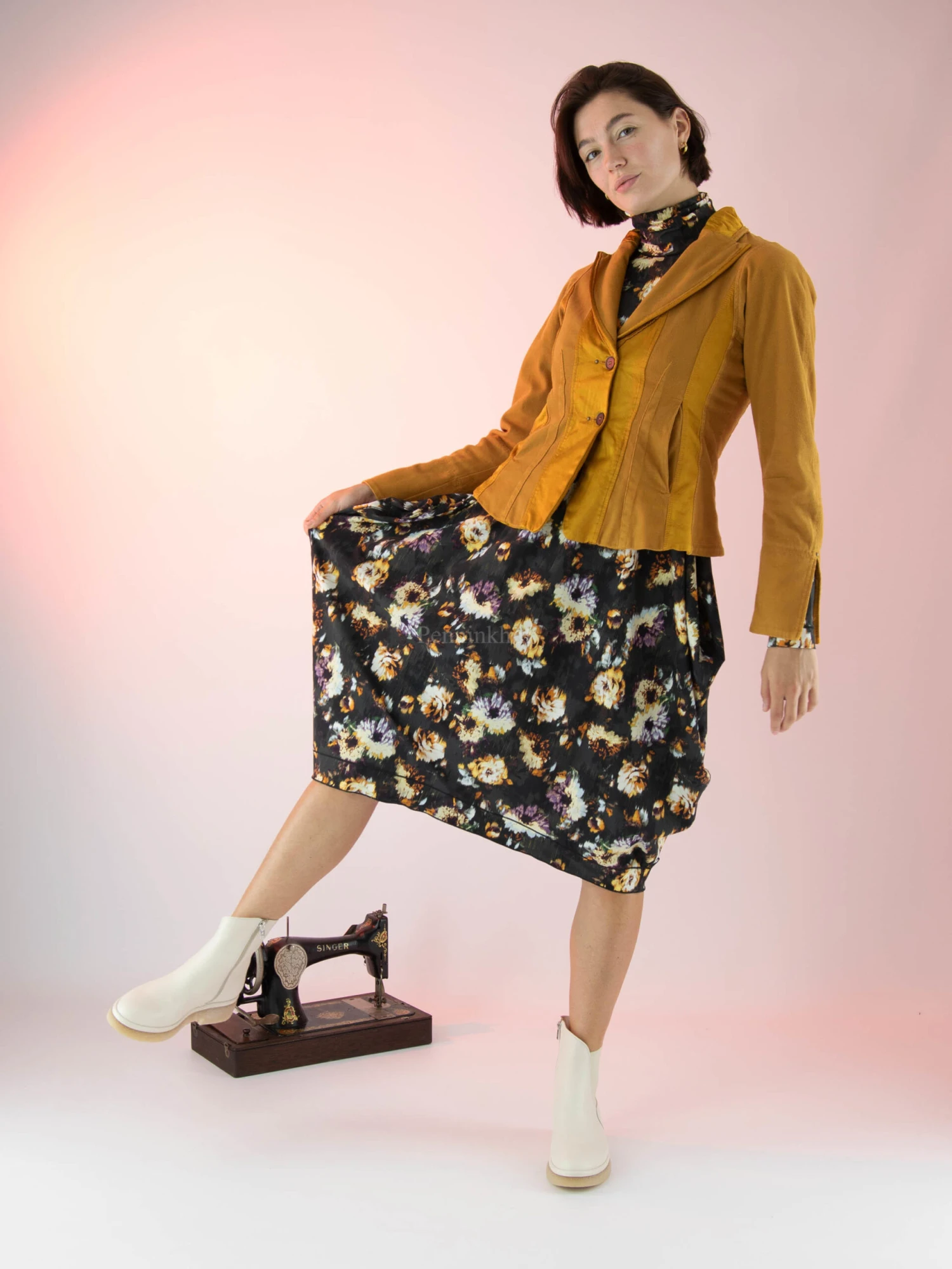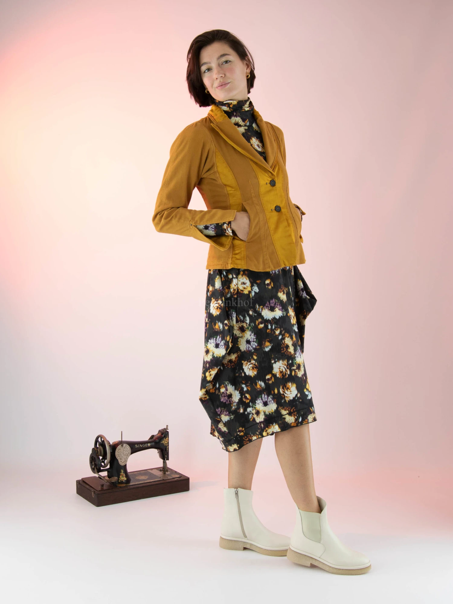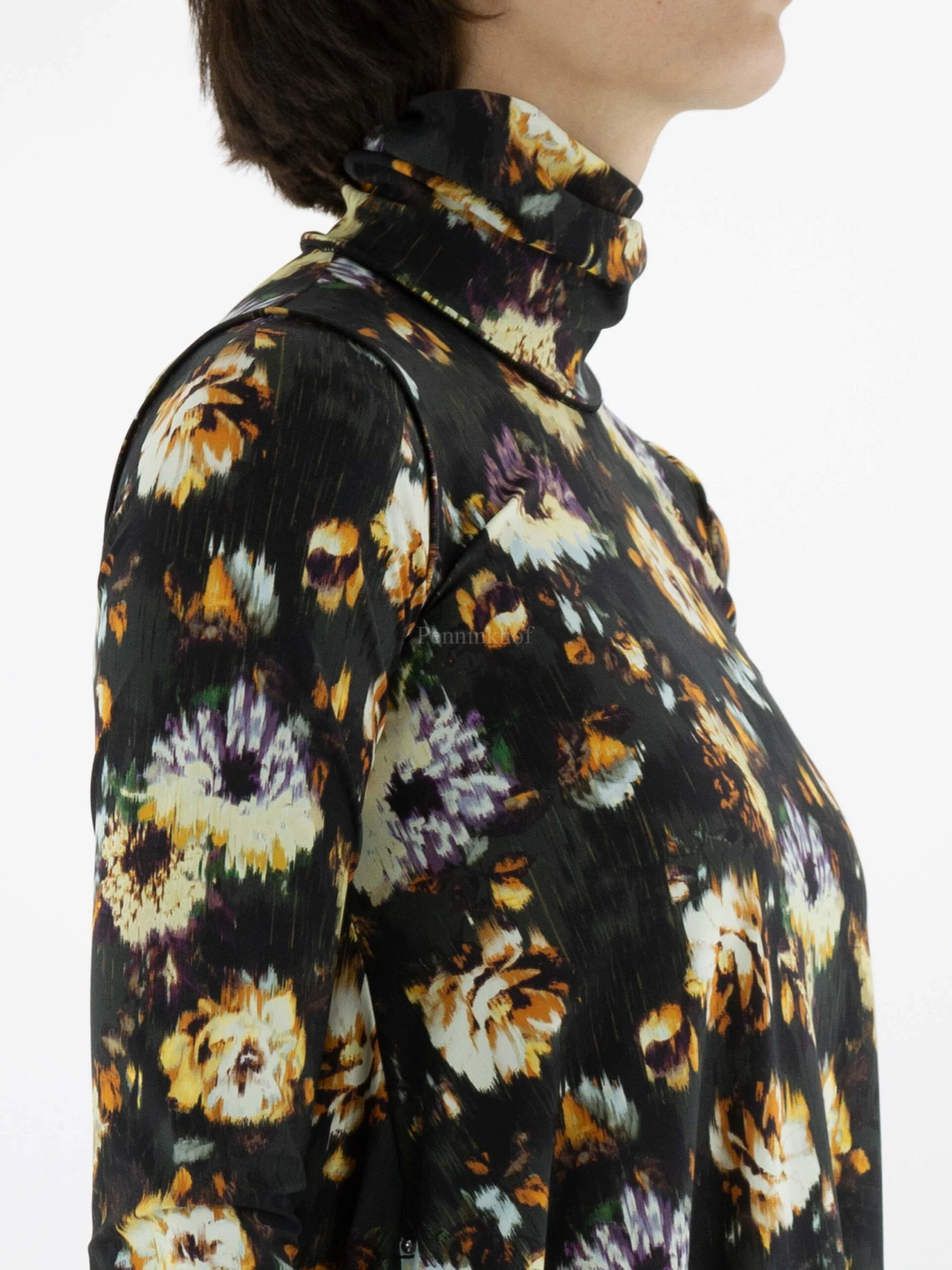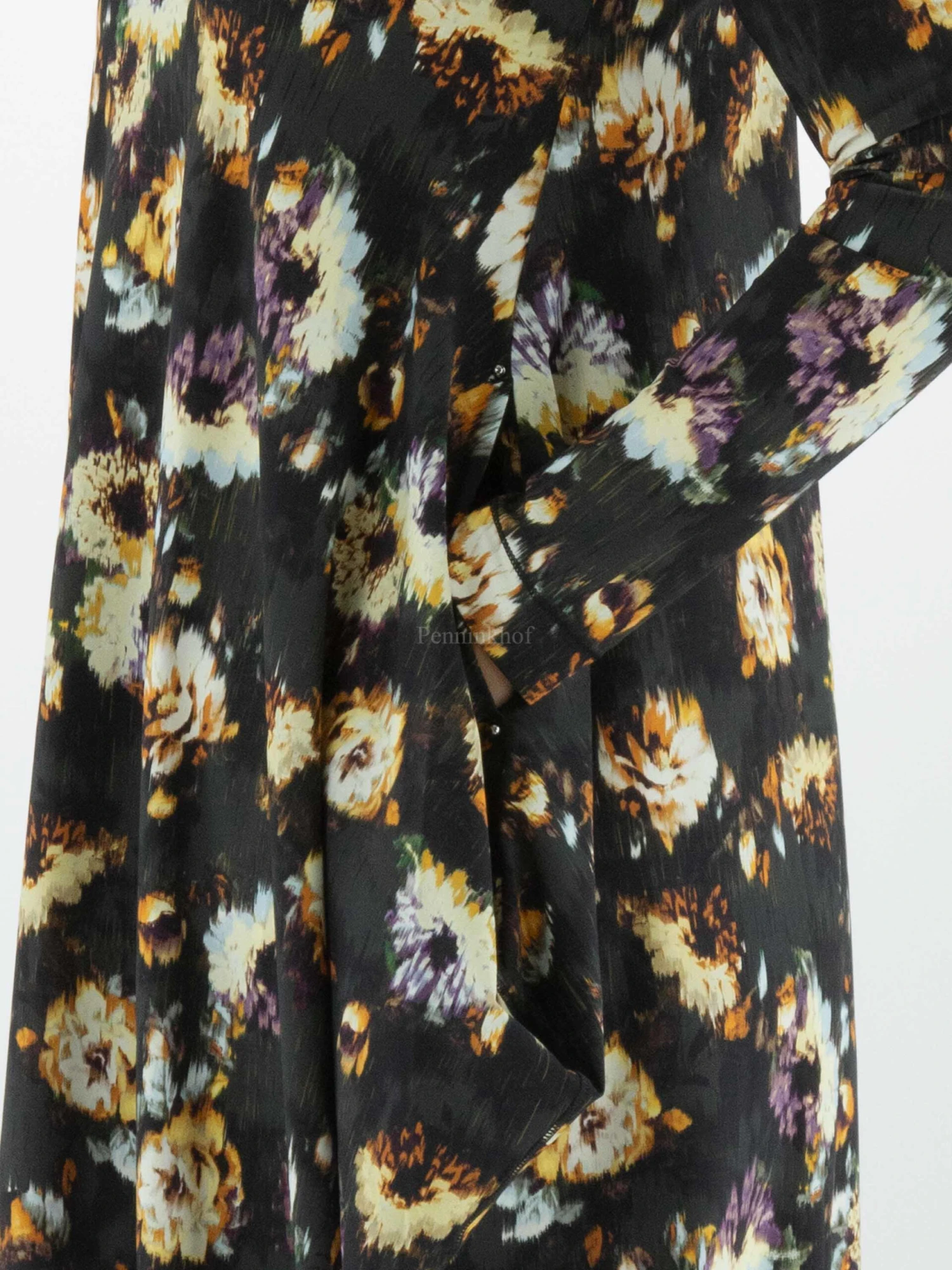 Een jurk van High in een multi color bloemenprint op een khaki achtergrond. De jurk heeft een turtle hals. ter hoogte van de taille zijn steekzakken. De jurk heeft een ballonvorm en mag op 30 graden worden gewassen.