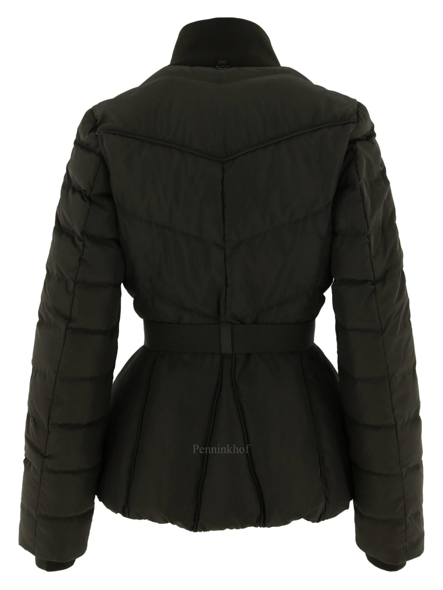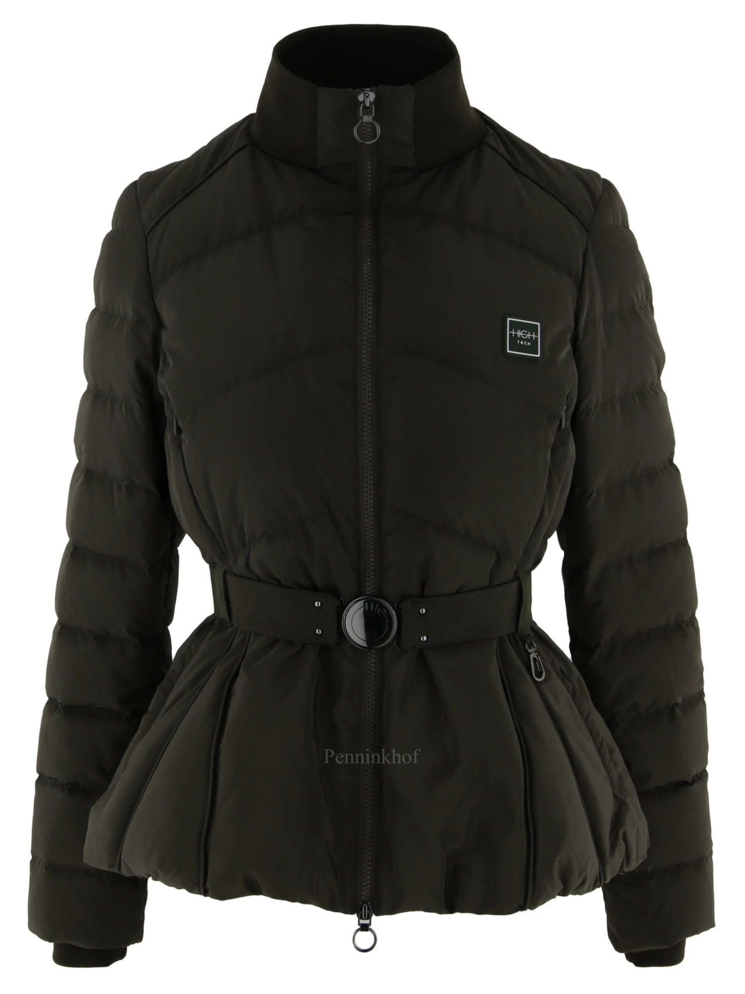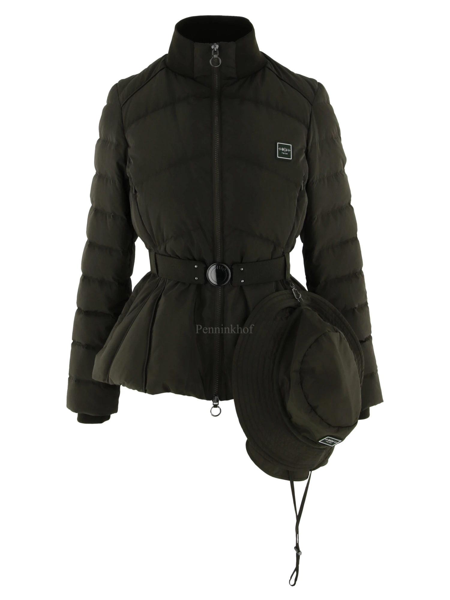Een gestepte coat van High in een olijfgroene kleur. In de hals is een brede fijn geribbelde kraag. In de taille is een elastieken ceintuur met een ronde nikkelkleurige gesp. Zowel onder de taille als ook boven de taille zijn steekzakken. Bij de coat is een safari regen hoedje. Deze coat mag op 30 graden worden gewassen.