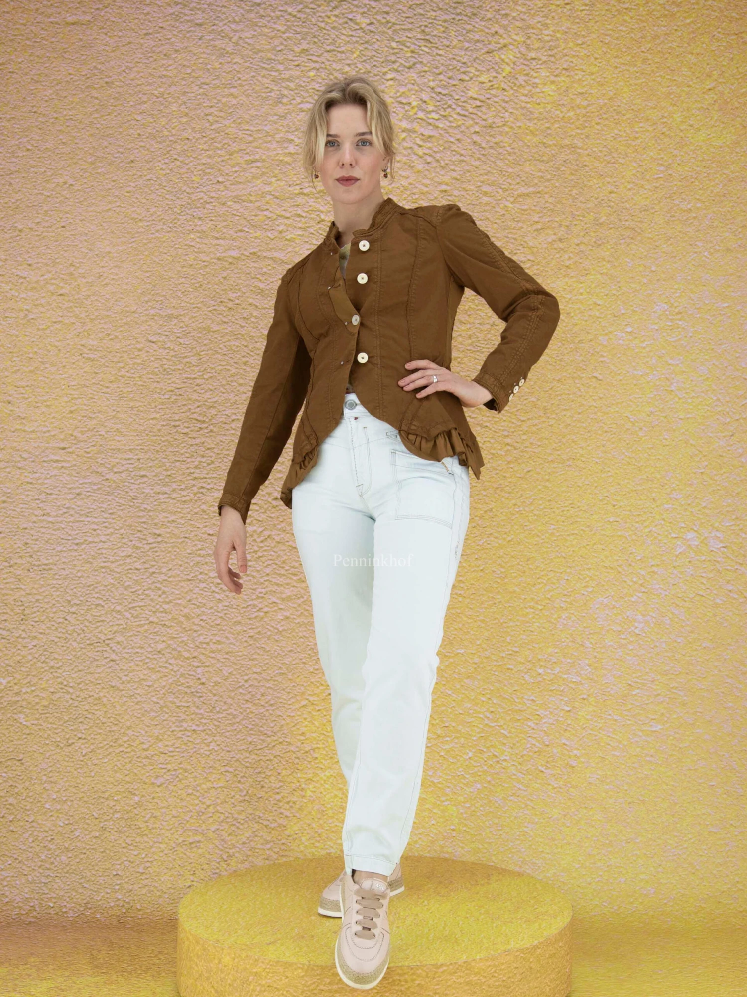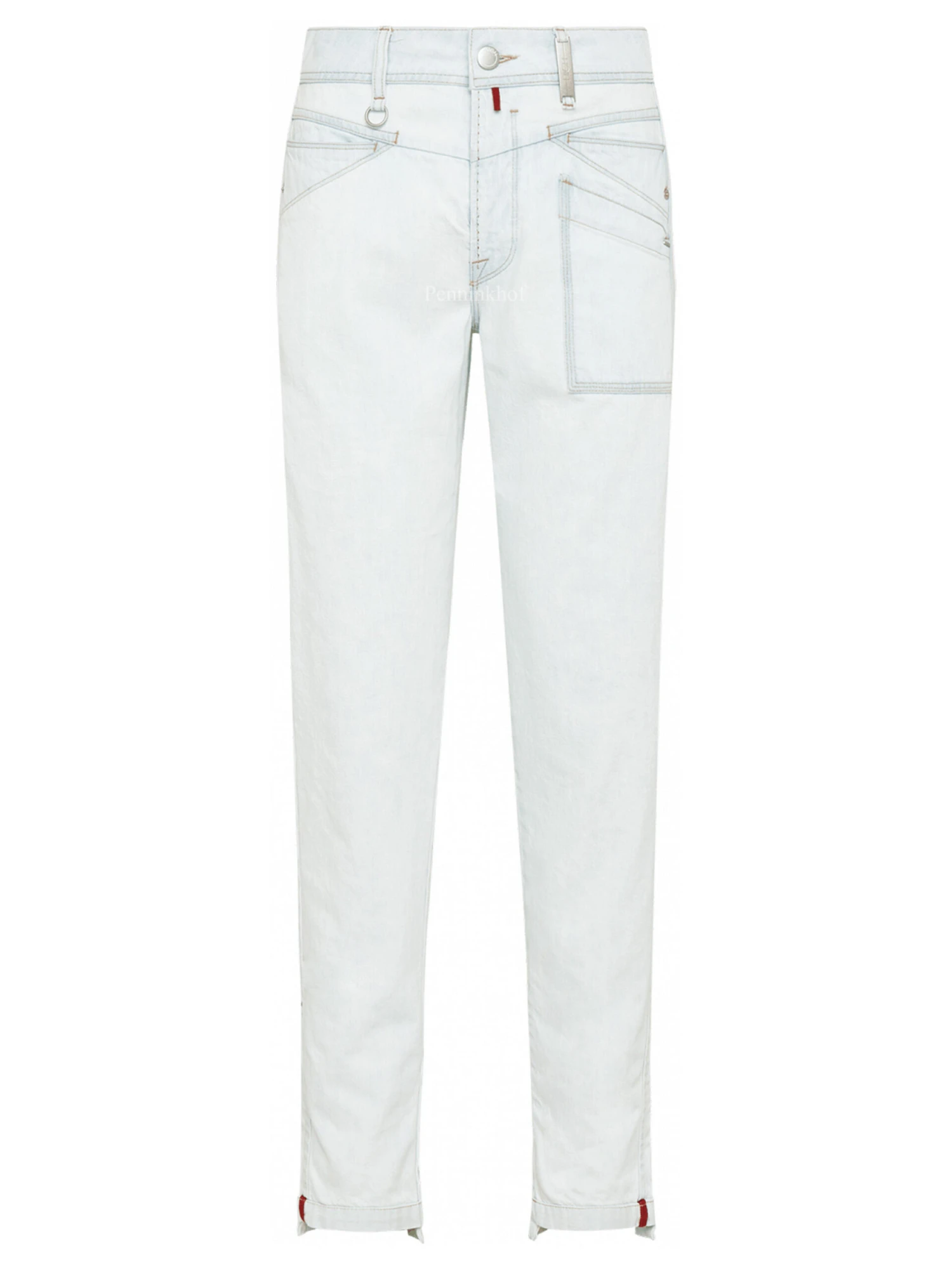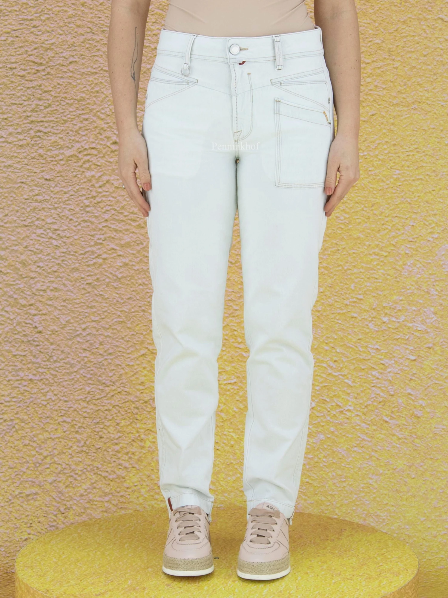 Een jeans van High in een zeer lichte jeans kleur. De jeans heeft cognac kleurige stiknaden. deze jeans mag op 30 graden worden gewassen.