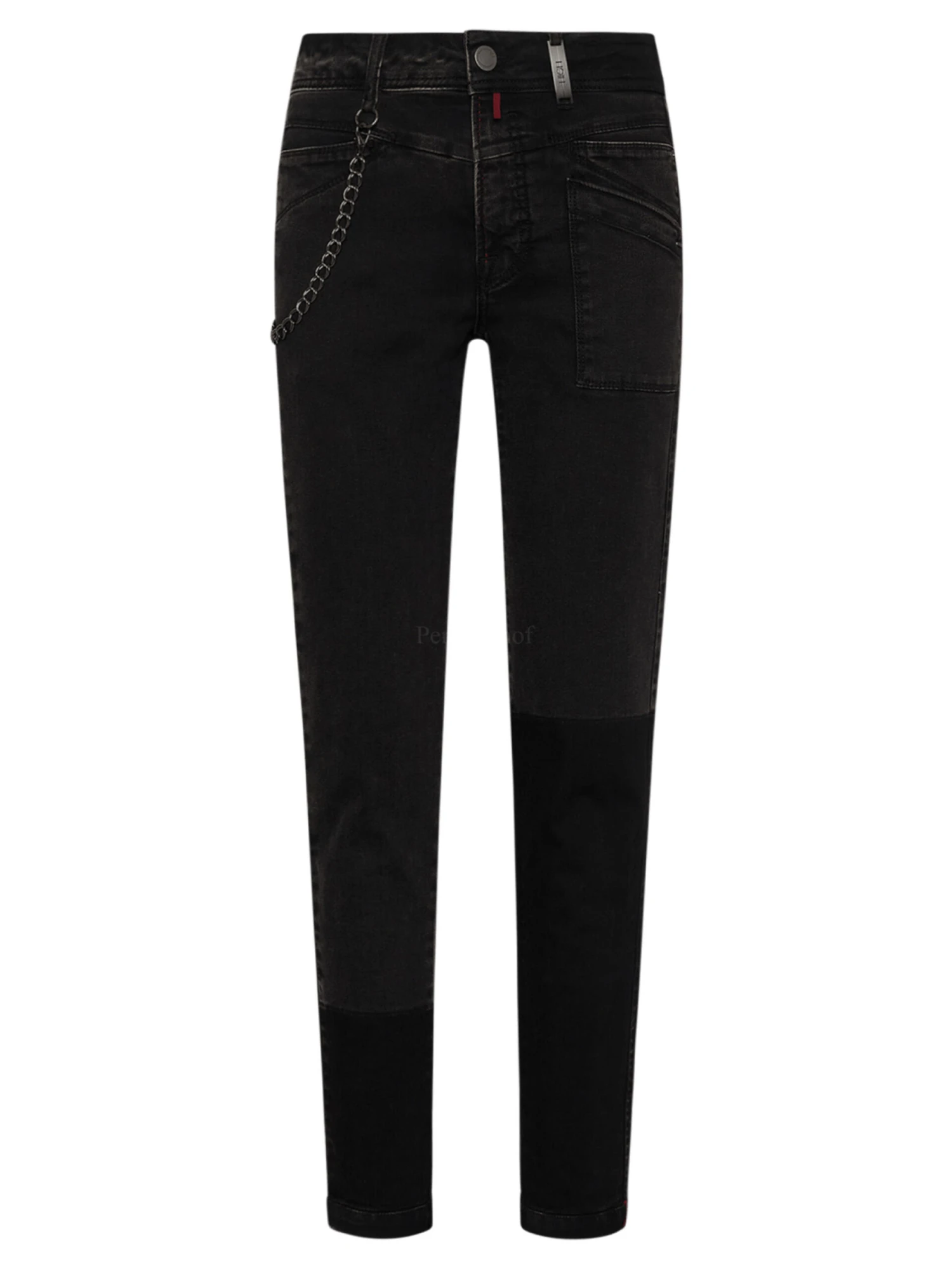Een jeans van High in meerdere kleurvakken met meerdere tinten zwart. Langs de ritssluiting is een rode stiknaad. Vanuit de rechter ceintuurlus is een nikkel kleurige ketting die naar de achterkant loopt. Deze jeans mag op 30 graden worden gewassen.