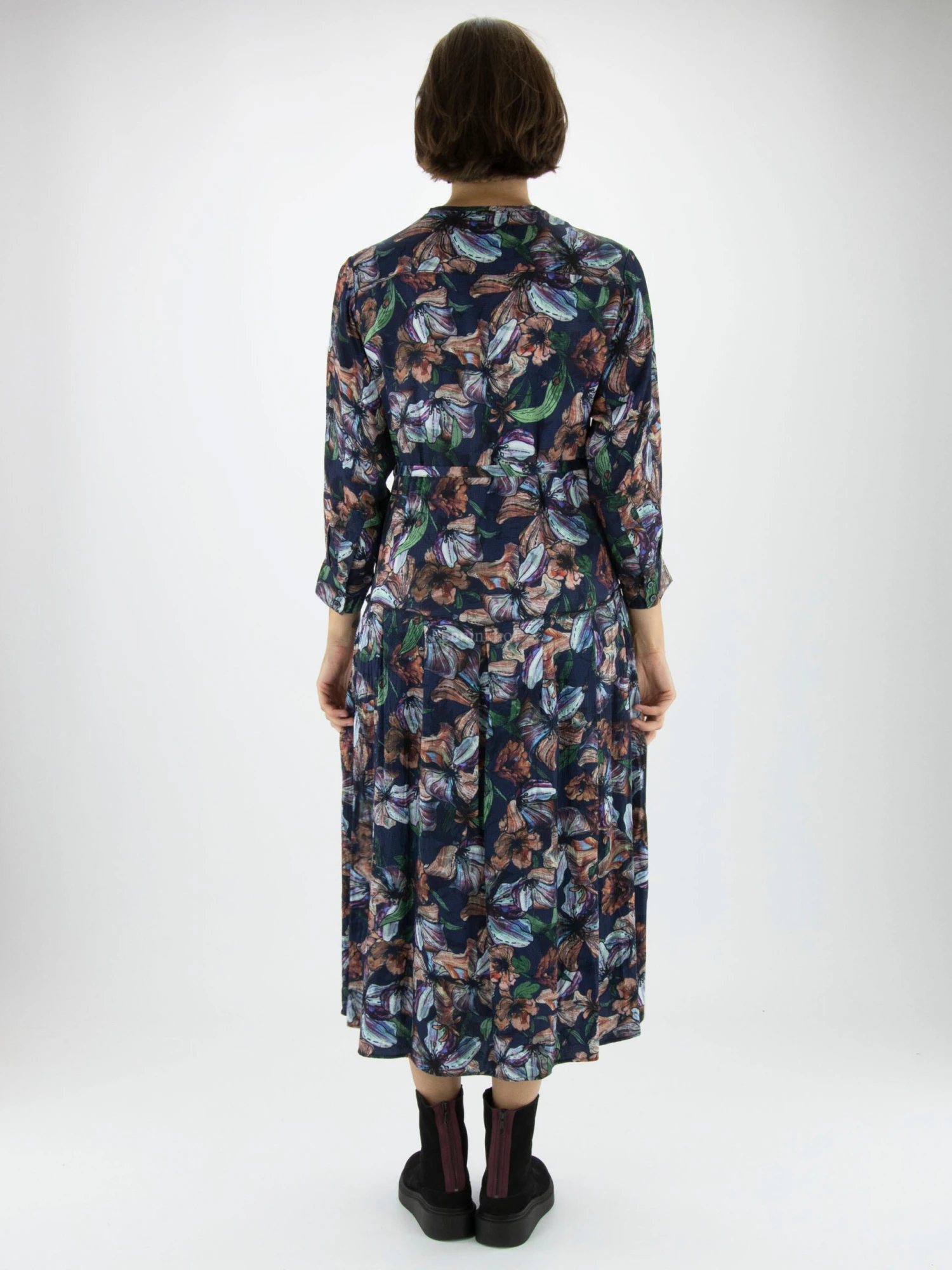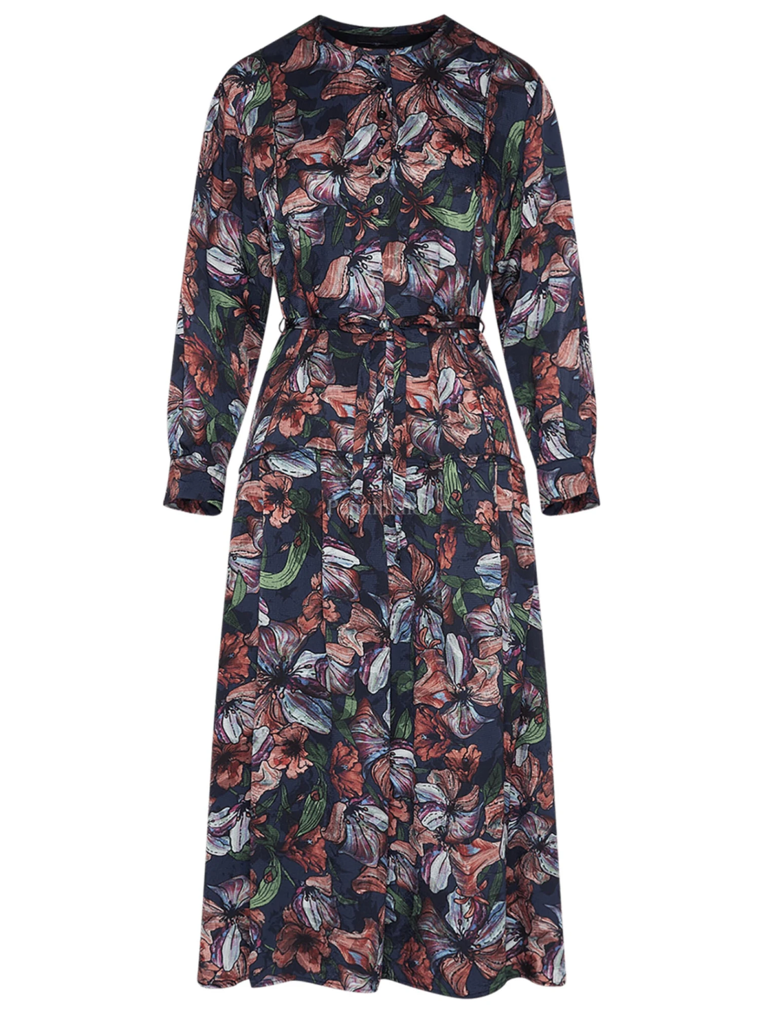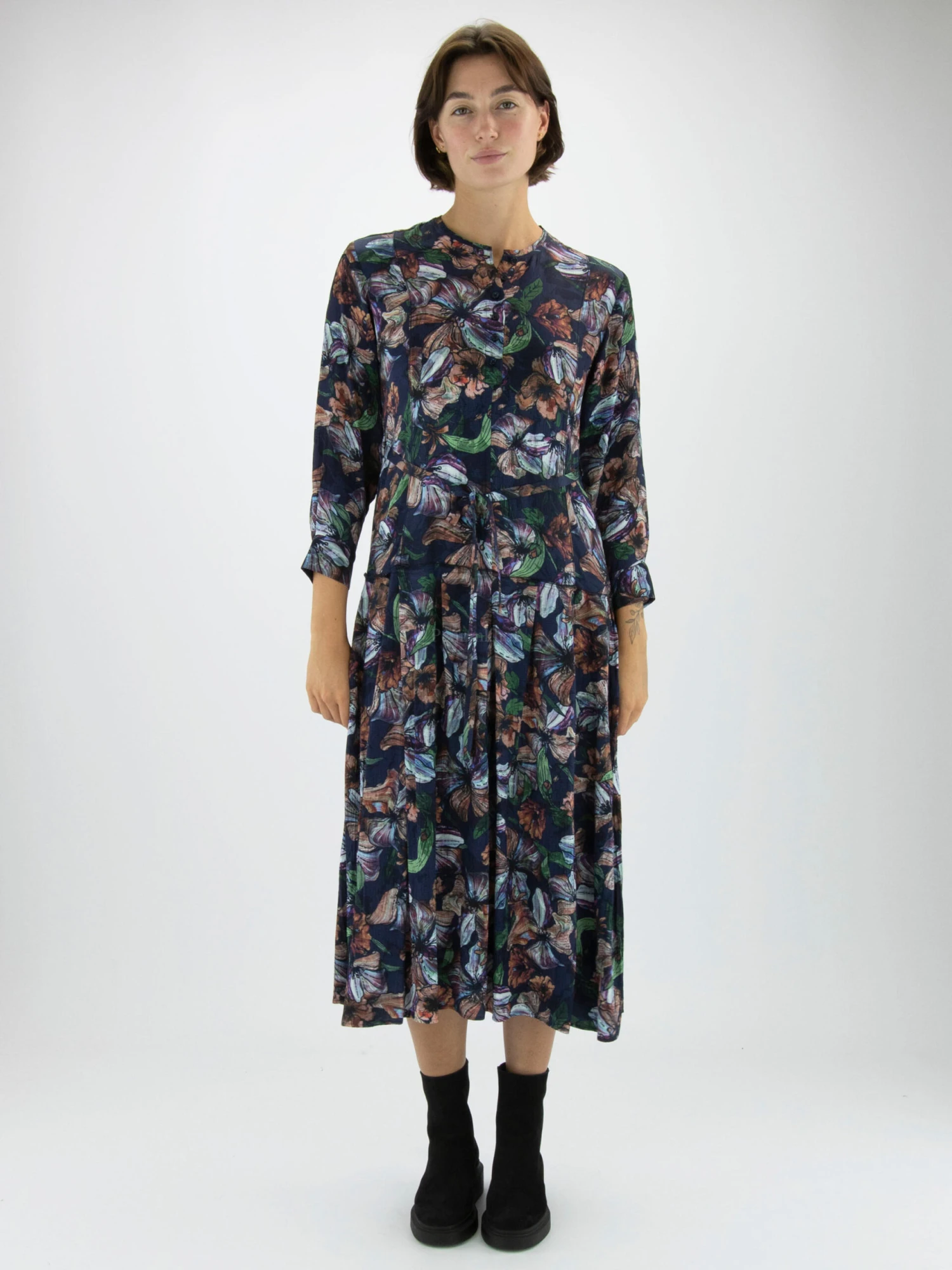Een jurk van High in een print van orchideeën in meerdere kleuren op een indigo blauwe achtergrond. De jurk heeft een knoopsluiting vanuit de hals tot onder de buste. Ter hoogte van de taille is een stiknaad waaronder de jurk een plooistructuur heeft. In de taille is een smalle ceintuur in dezelfde stof als de jurk. Onder de ceintuur zijn steekzakken. Deze jurk mag op de hand worden gewassen.