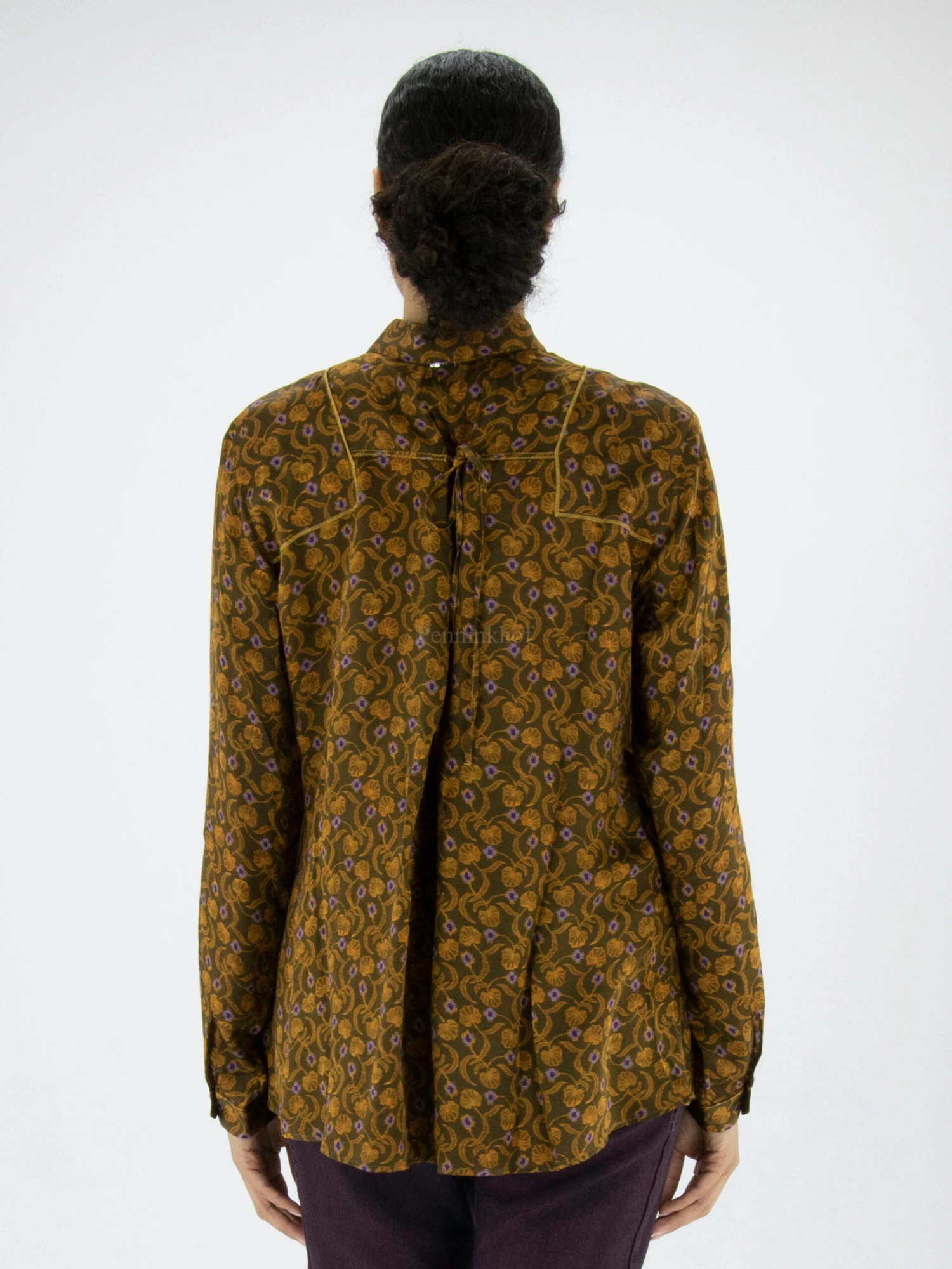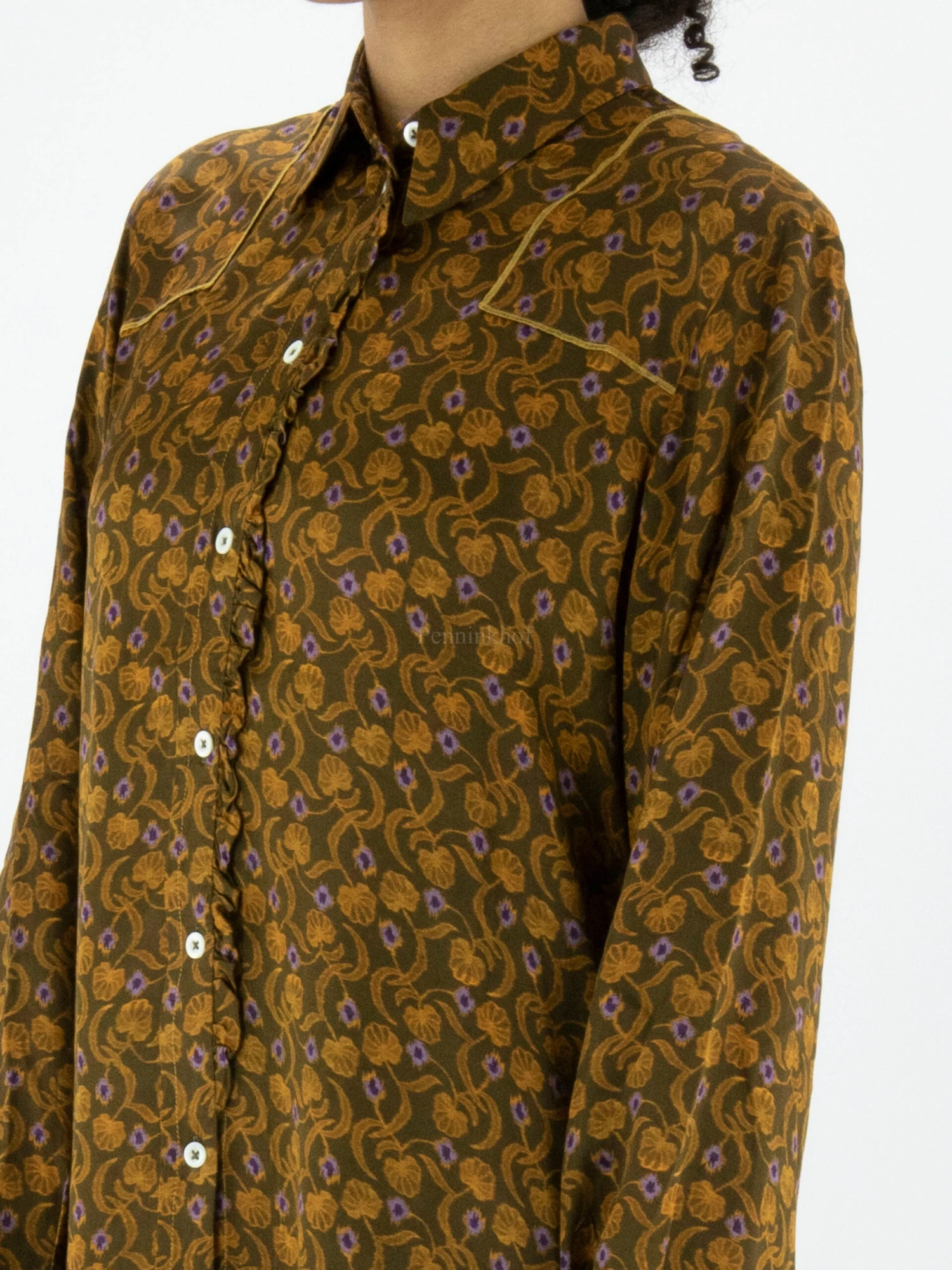 Een blouse van High in een bloemetjes en blaadjes print met de kleuren oranje en lila op een olijfgroene achtergrond. Langs de sluiting is een fijn geplooide bies in dezelfde stof als de blouse. Deze blouse mag op de hand worden gewassen.