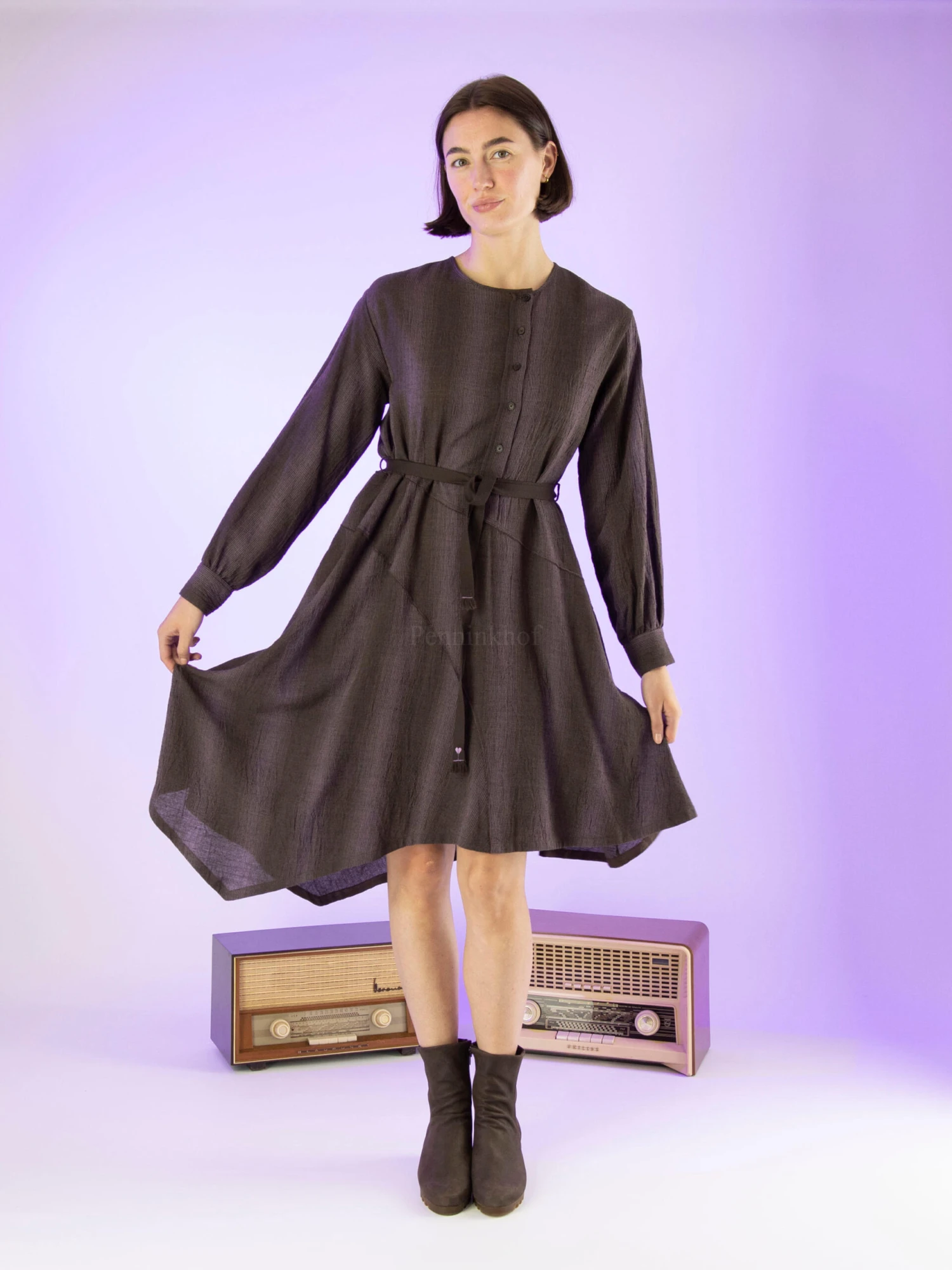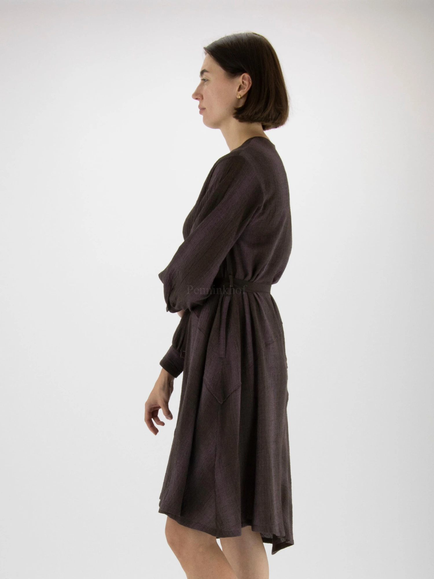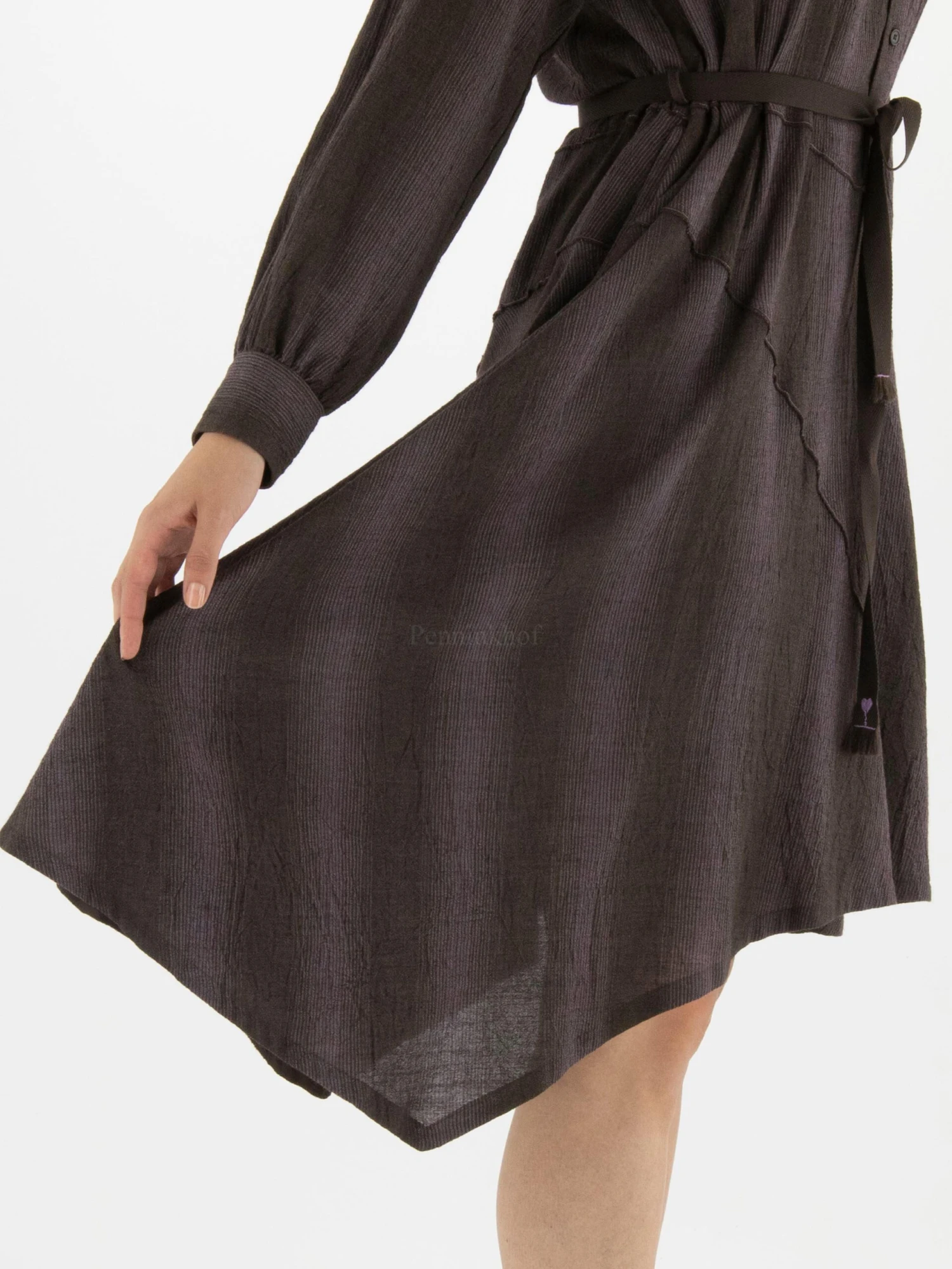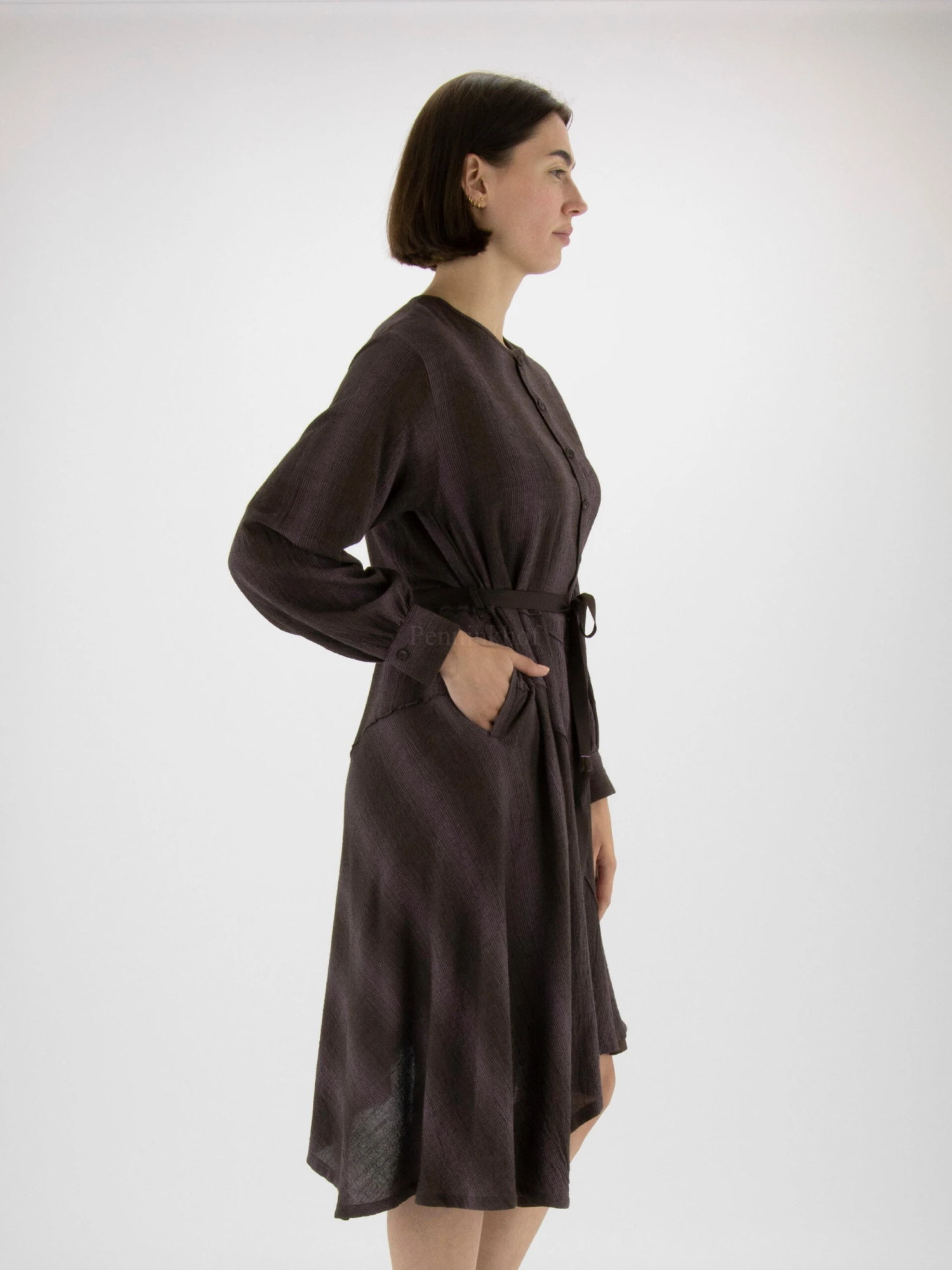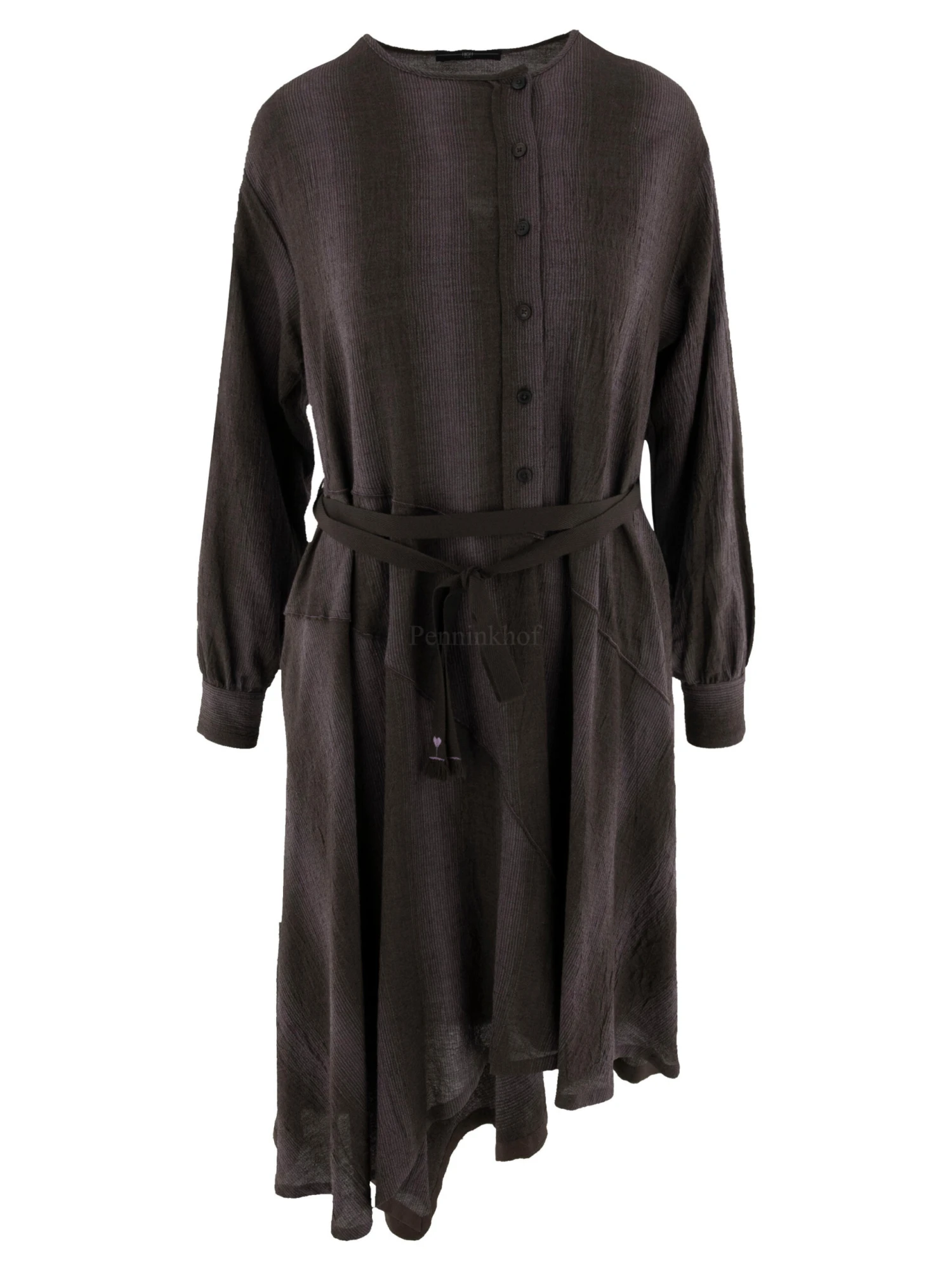 Een jurk van High in een grafische strepen patroon met de kleuren paars en bruin. Vanuit het midden van de ronde hals is een knoops sluiting tot onder de taille. In de taille is een Lint ceintuur in de kleur bruin. Vanuit de taille zijn 2 diagonale stiknaden naar beneden toe De jurk heeft lange mouwen en mag niet worden gewassen.