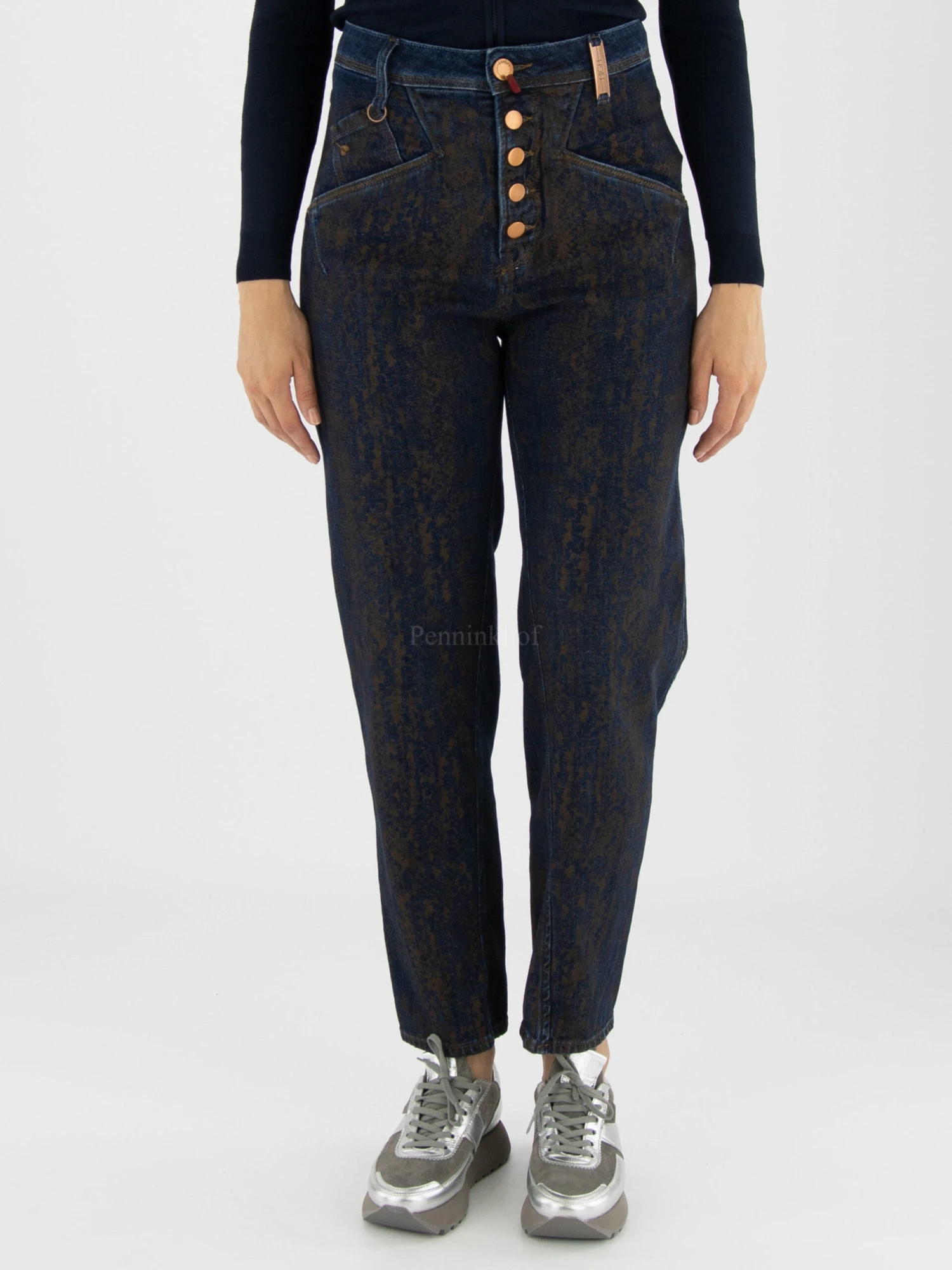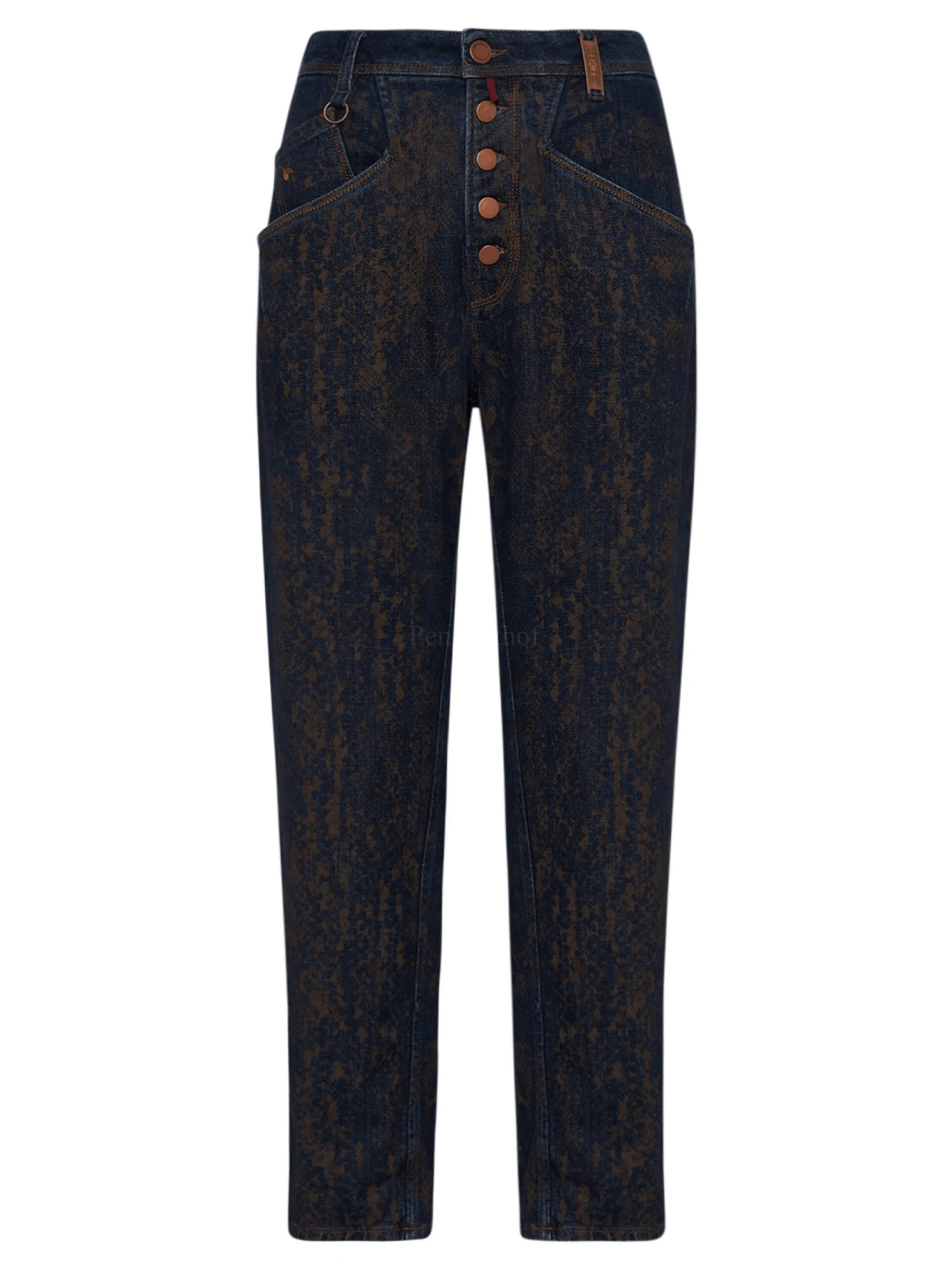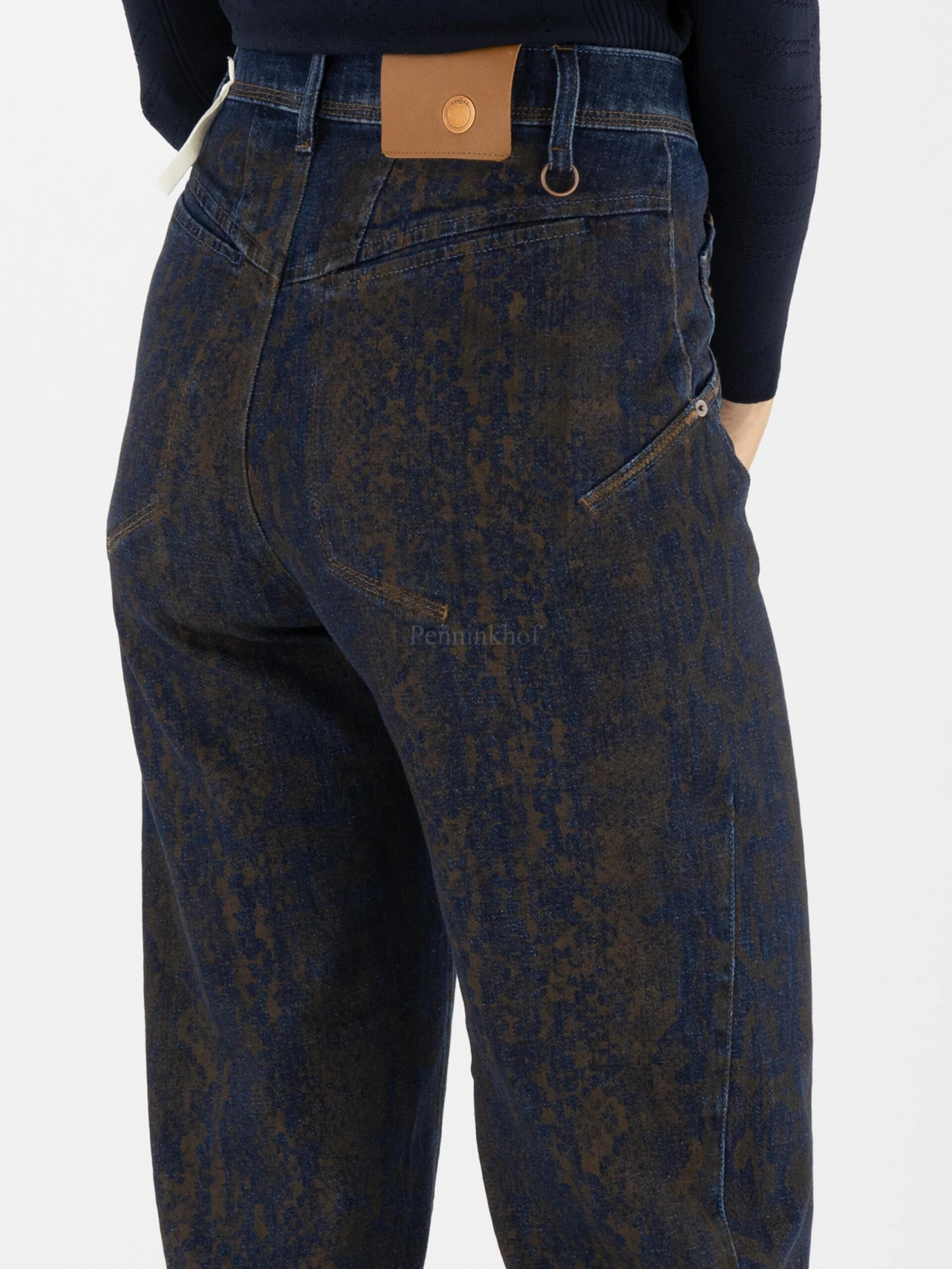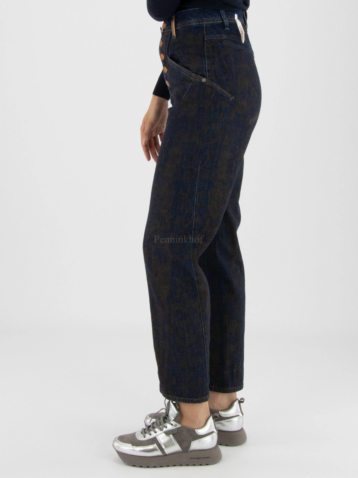 Een jeans van High in een reptielprint met de kleuren mokkabruin en jeans. De jeans heeft een sluiting met 5 koper kleurige knopen. De jeans is in een 5 pocket model met diagonaal gesneden zakken. Deze jeans mag op 30 graden worden gewassen.