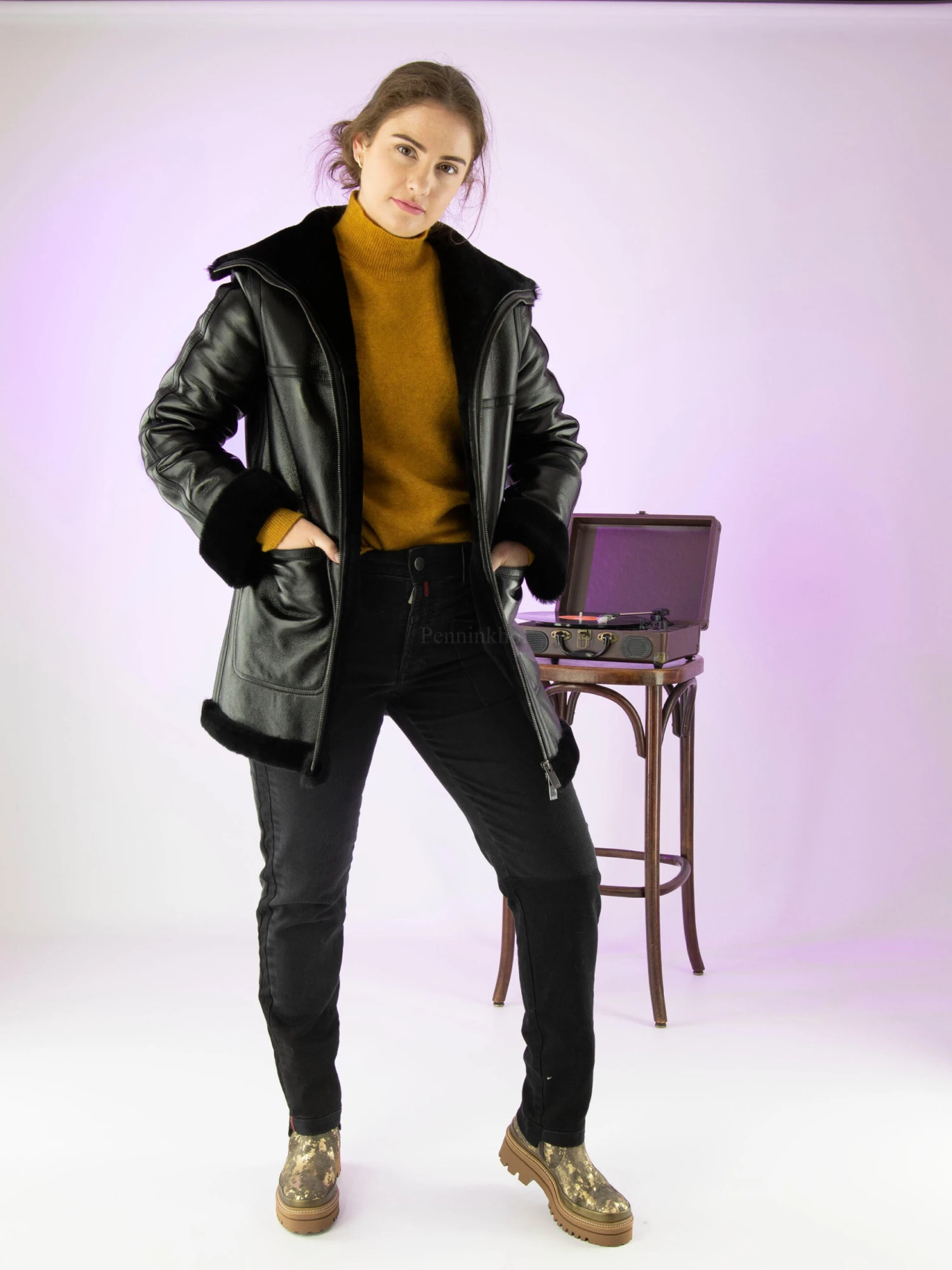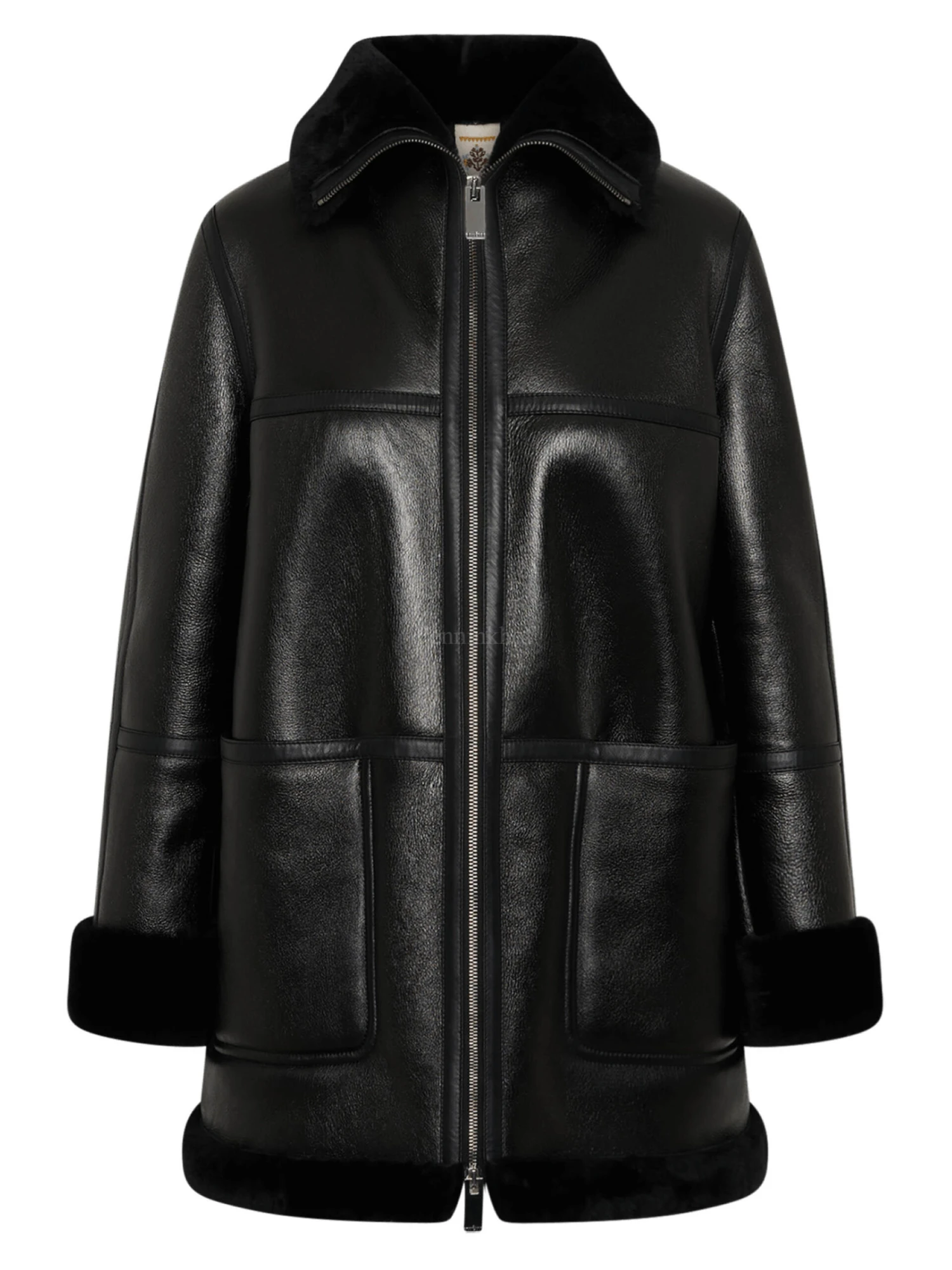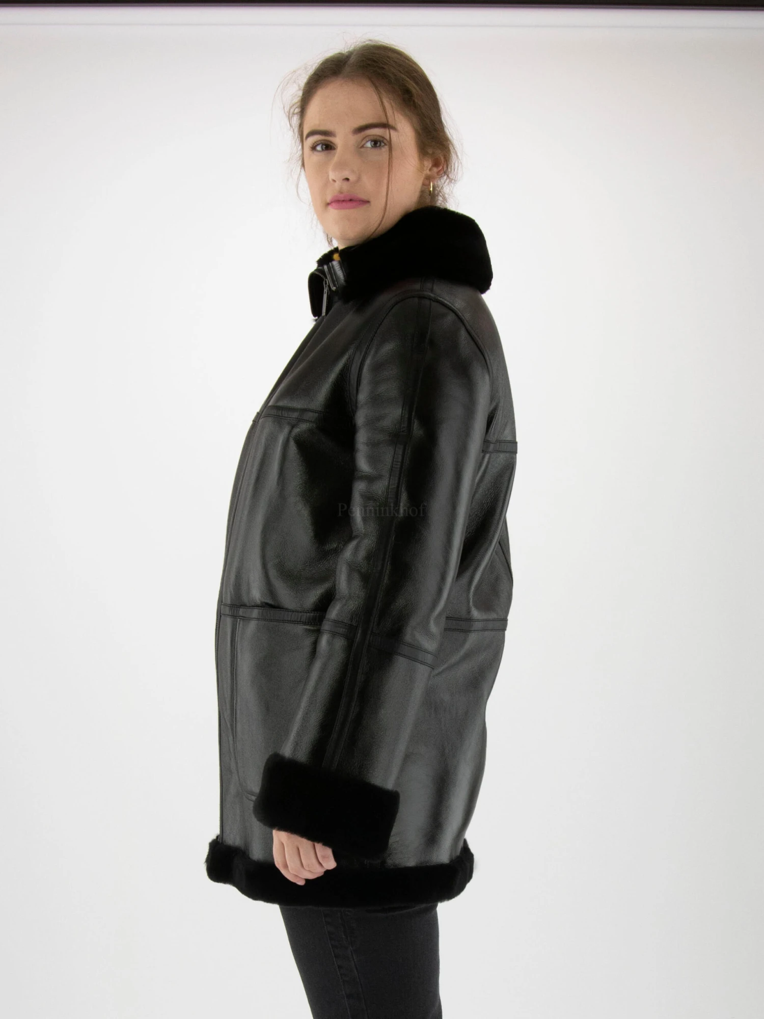 Een lederen coat van High in de kleur zwart. De coat is licht glanzend gecoat en heeft een ritssluiting. Aan de onderkant is een rand met geschoren vacht net als in de kraag. Deze coat mag niet worden gewassen.