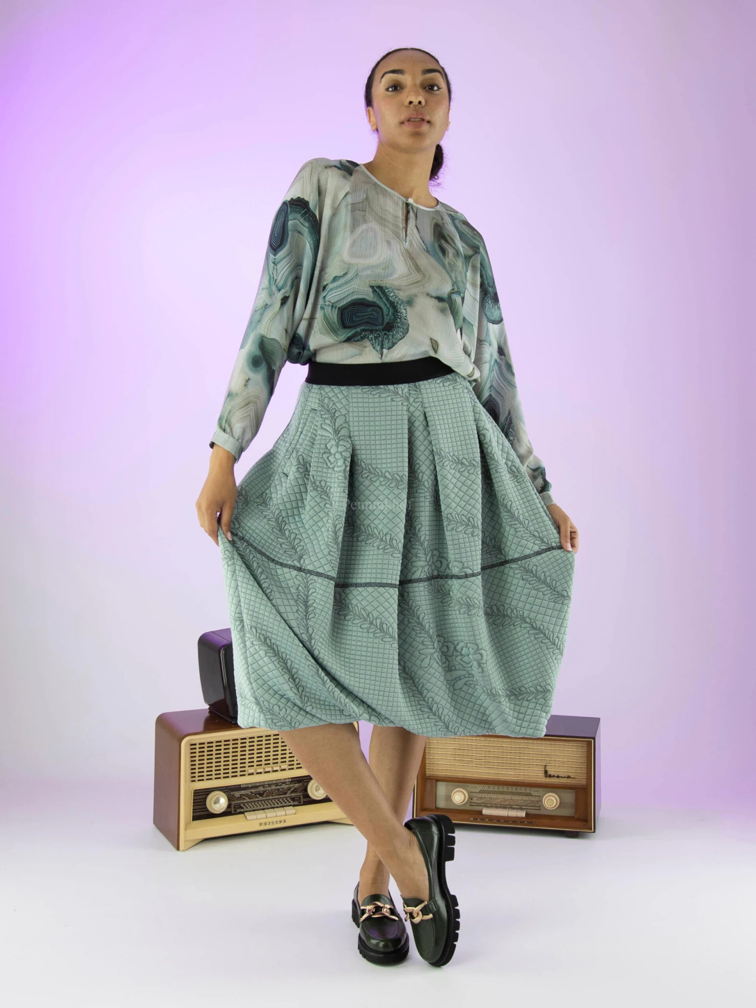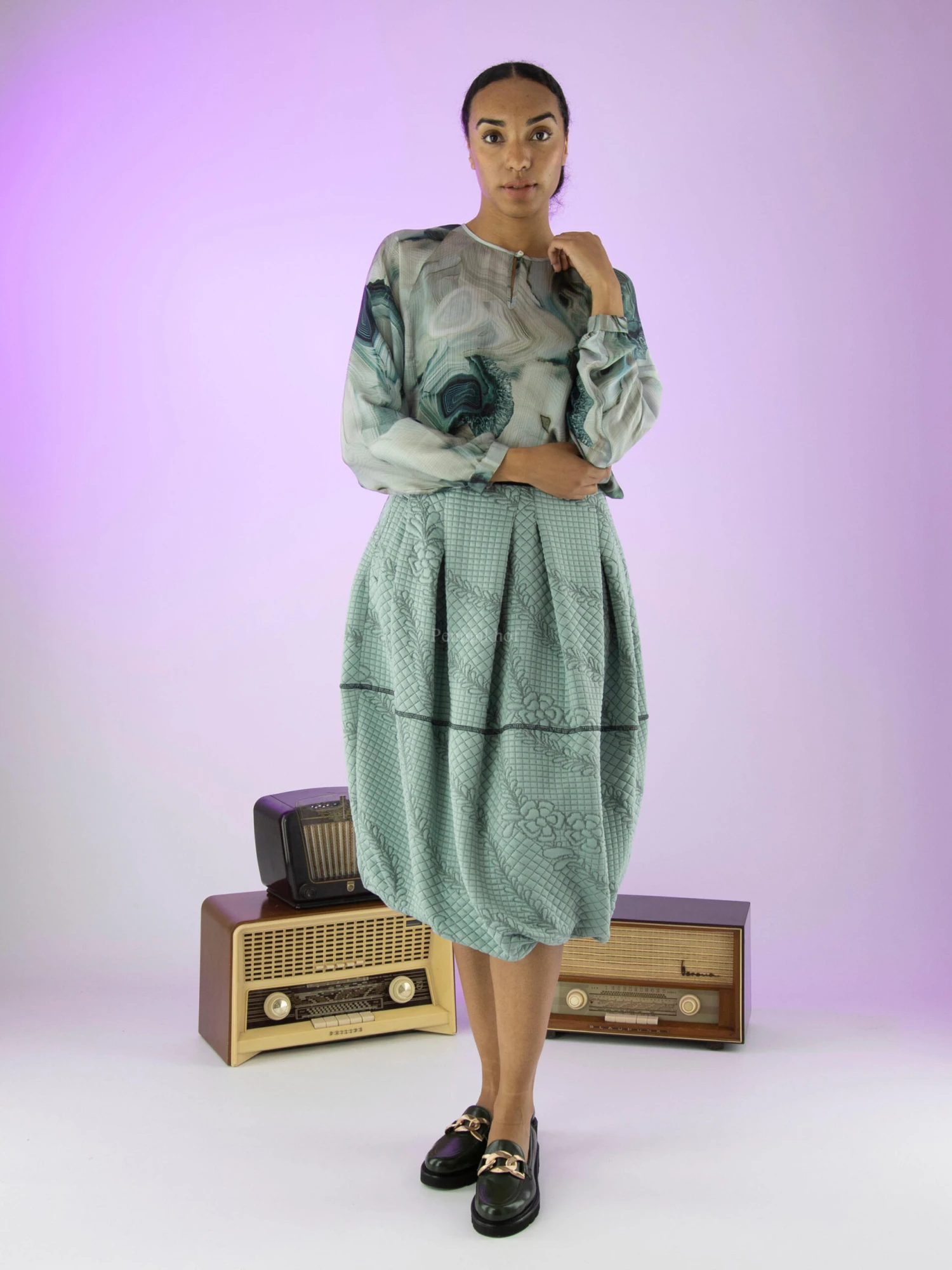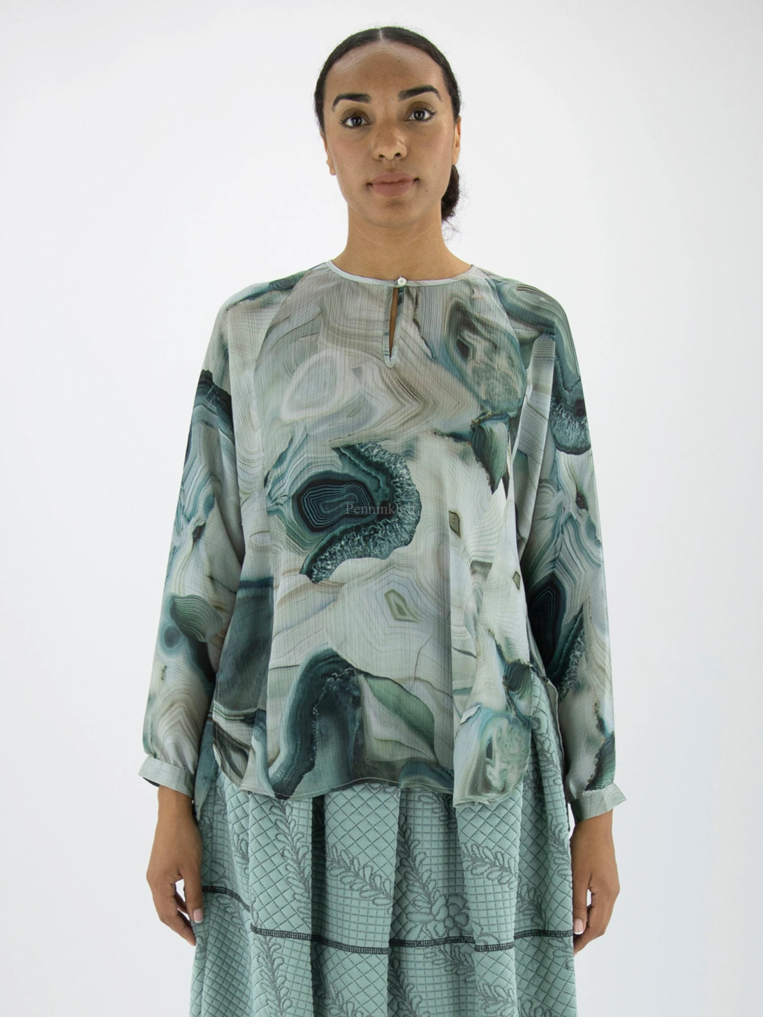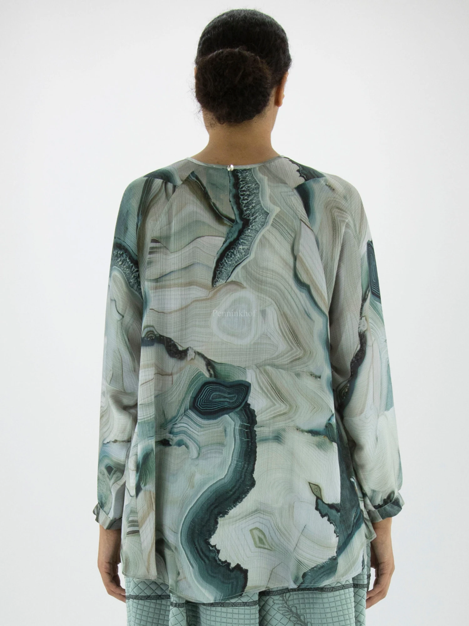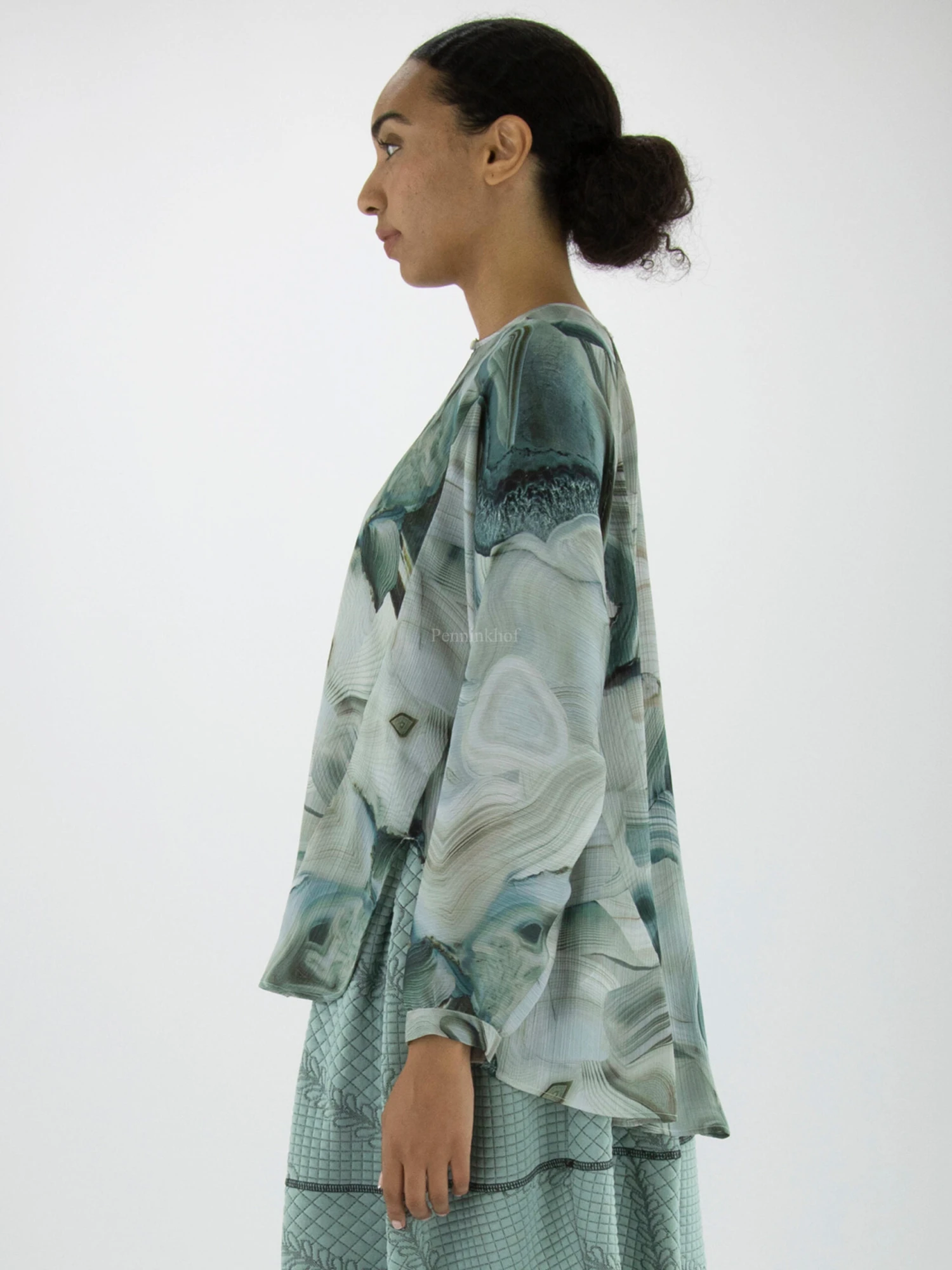 Een licht transparante blouse van High in een grafische print met meerdere tinten turquoise met zwart en roomwit. In het midden van de ronde hals is aan de voorkant een druppel opening met een knoopsluiting. Aan de onderkant is aan beide zijden een diepe split. Deze blouse mag op de hand worden gewassen.