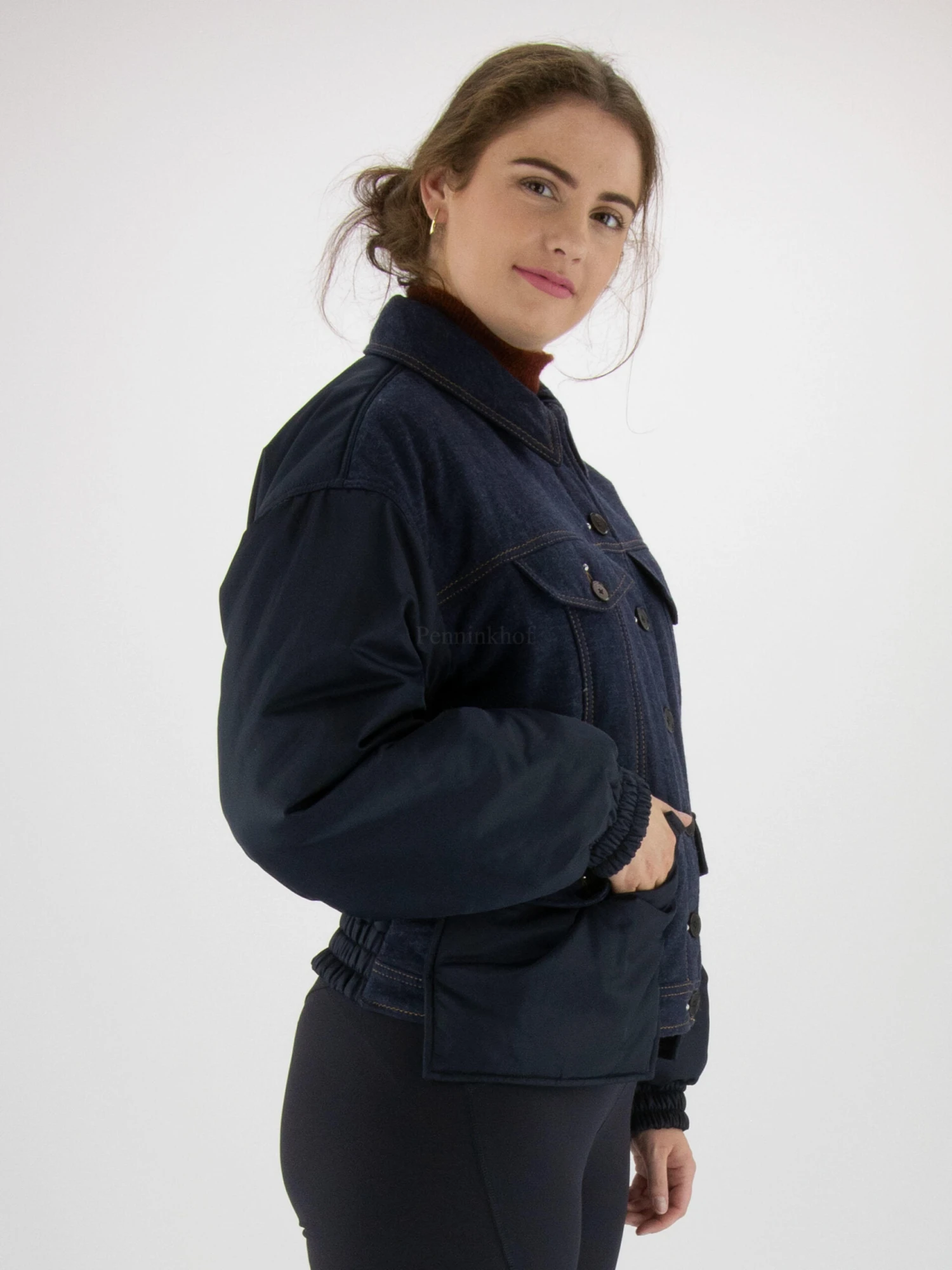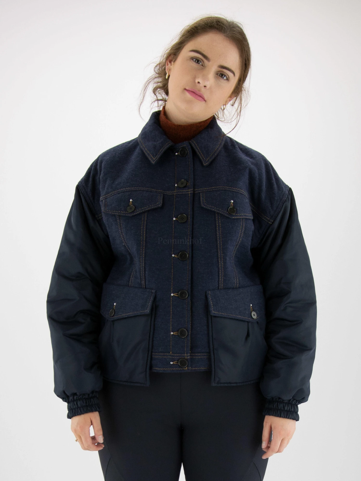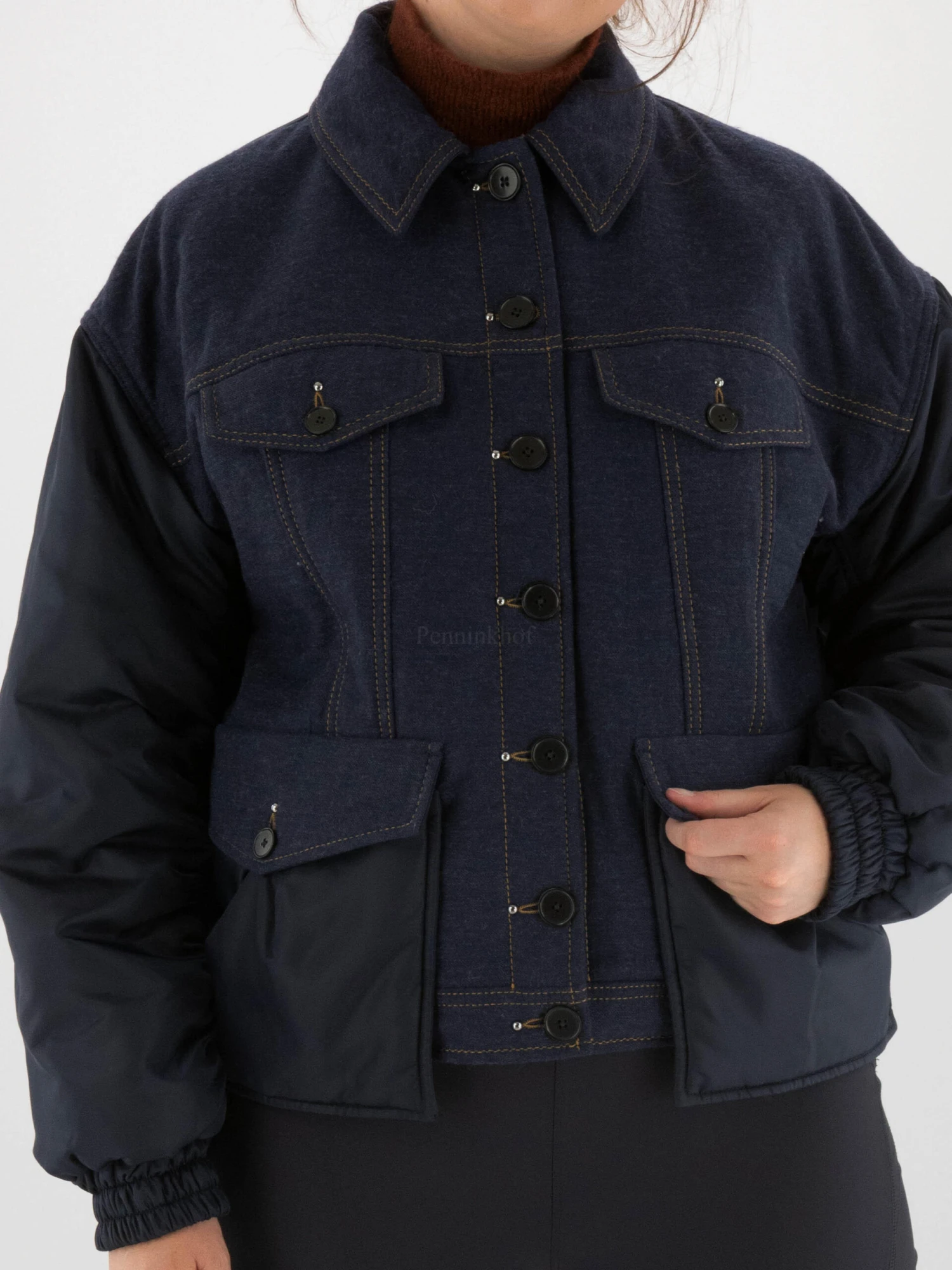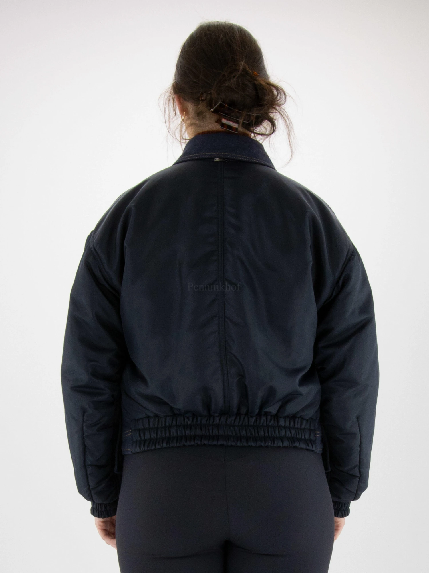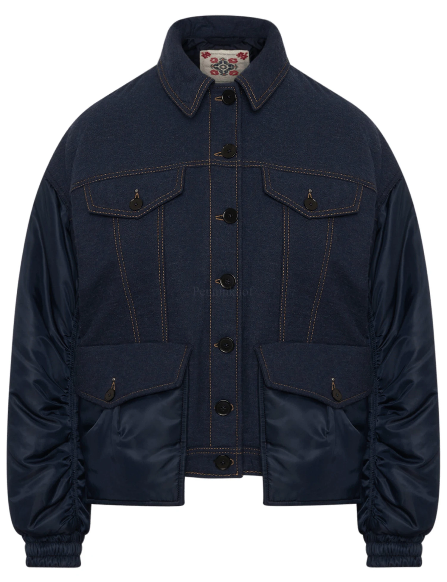 Een korte gewatteerde jeans coat in een basic jeans kleur. Aan de voorzijde van de onderste zakken en de mouwen zijn in een marineblauwe parachute stof. De uiteinden van de mouwen hebben een brede fijn geplooide elastische boord. Deze coat mag niet worden gewassen.