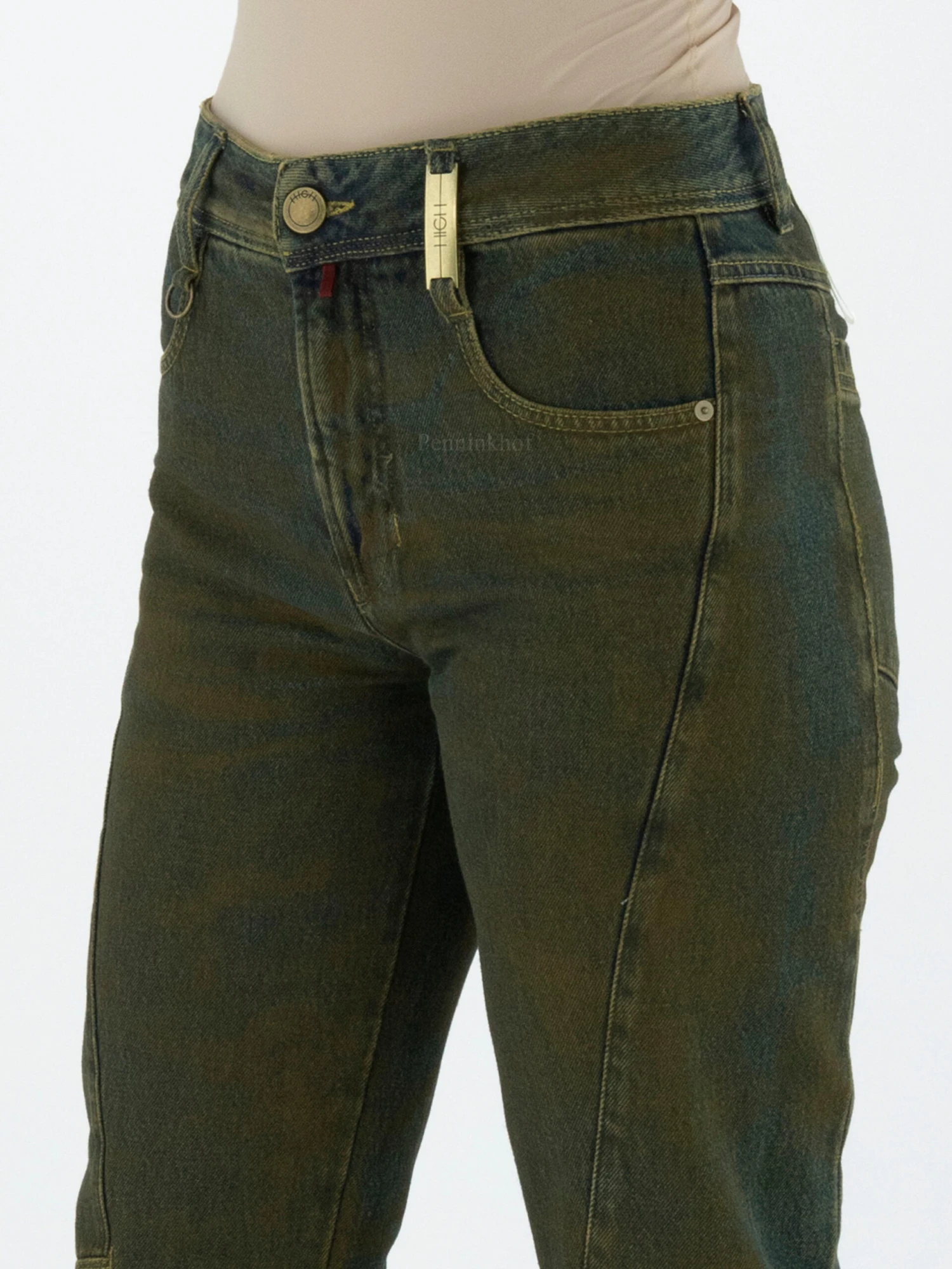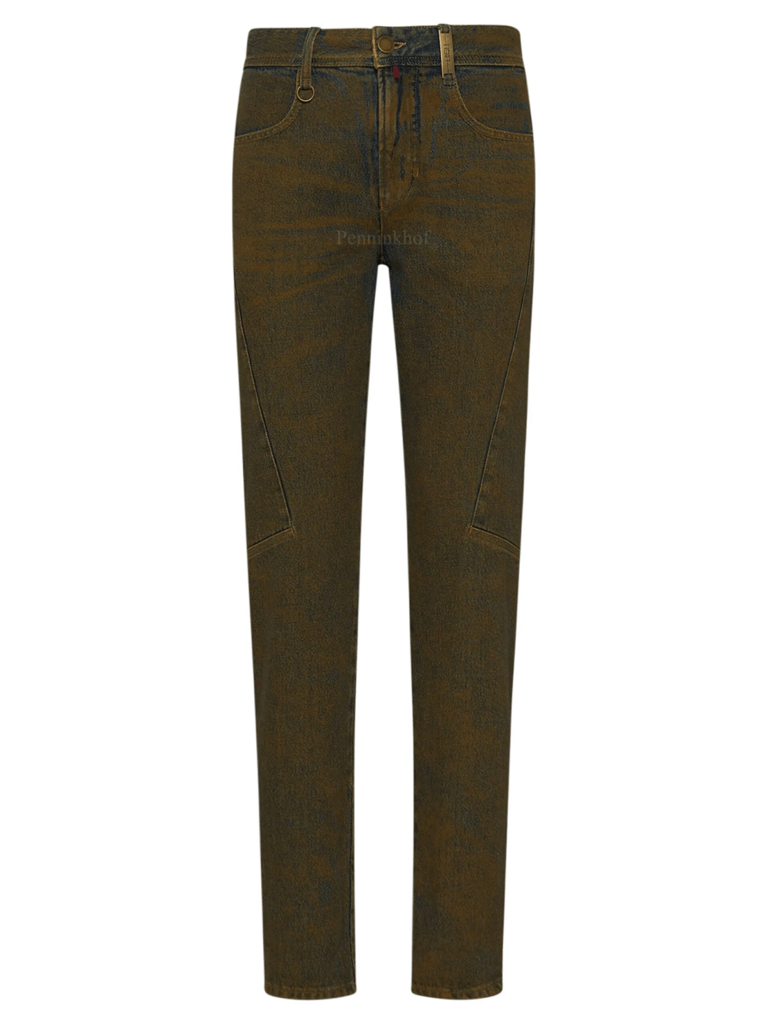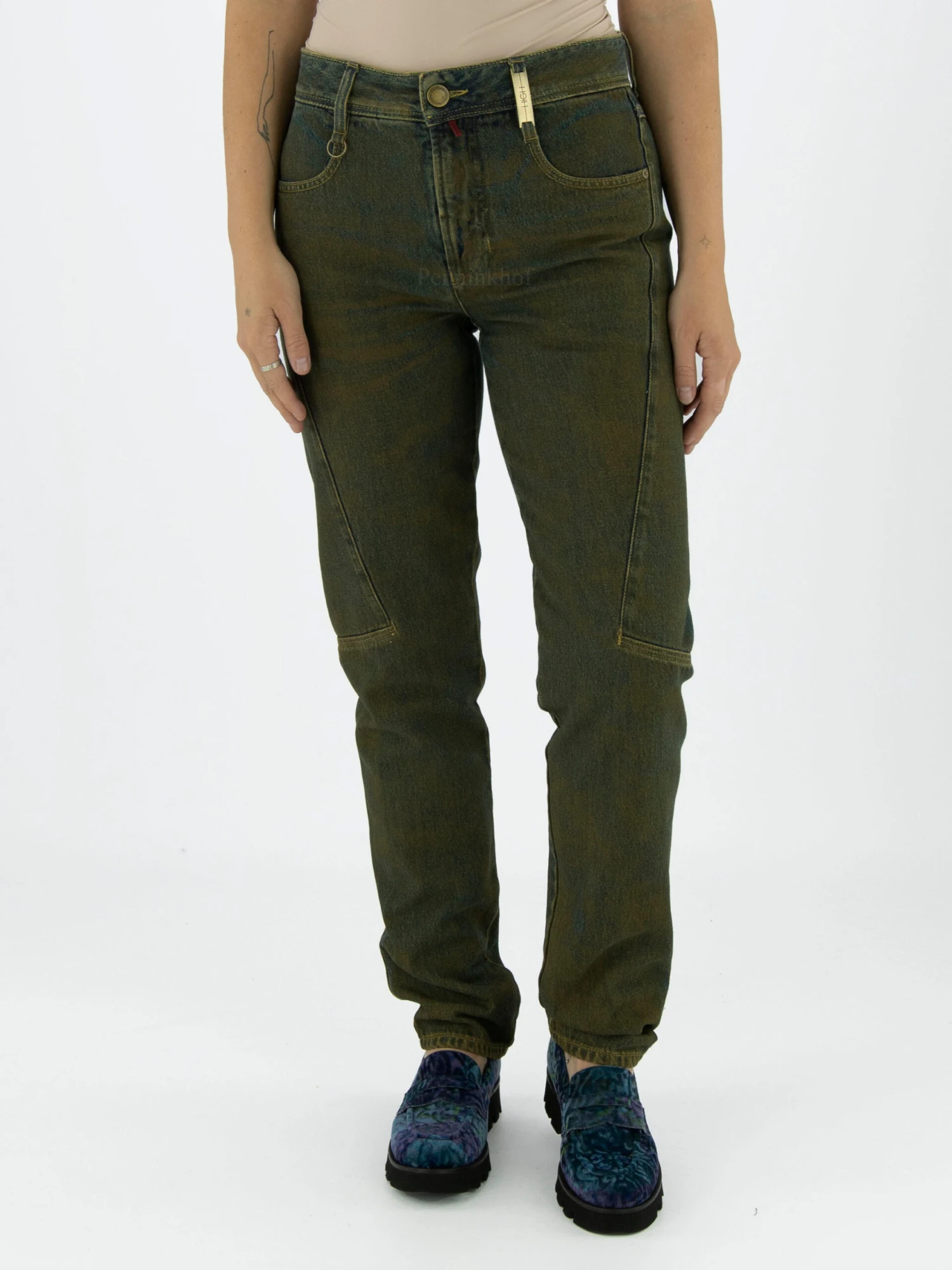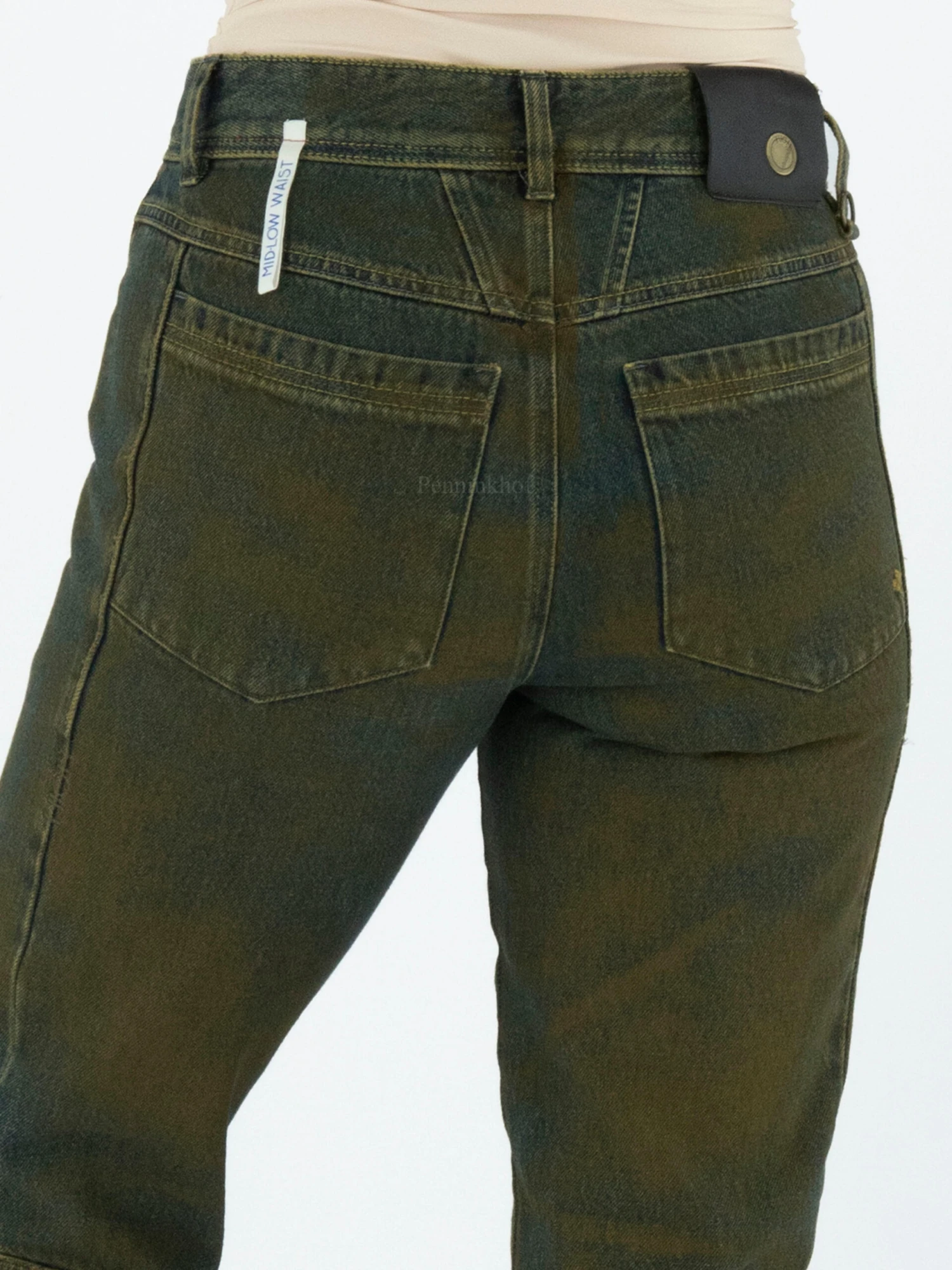 Een jeans van High in een gemêleerde groene kleur met als ondergrond jeansblauw.Vanuit de zijkant van de taille is een stiknaad neer het midden ter hoogte van de knie. Deze jeans mag op de hand worden gewassen.