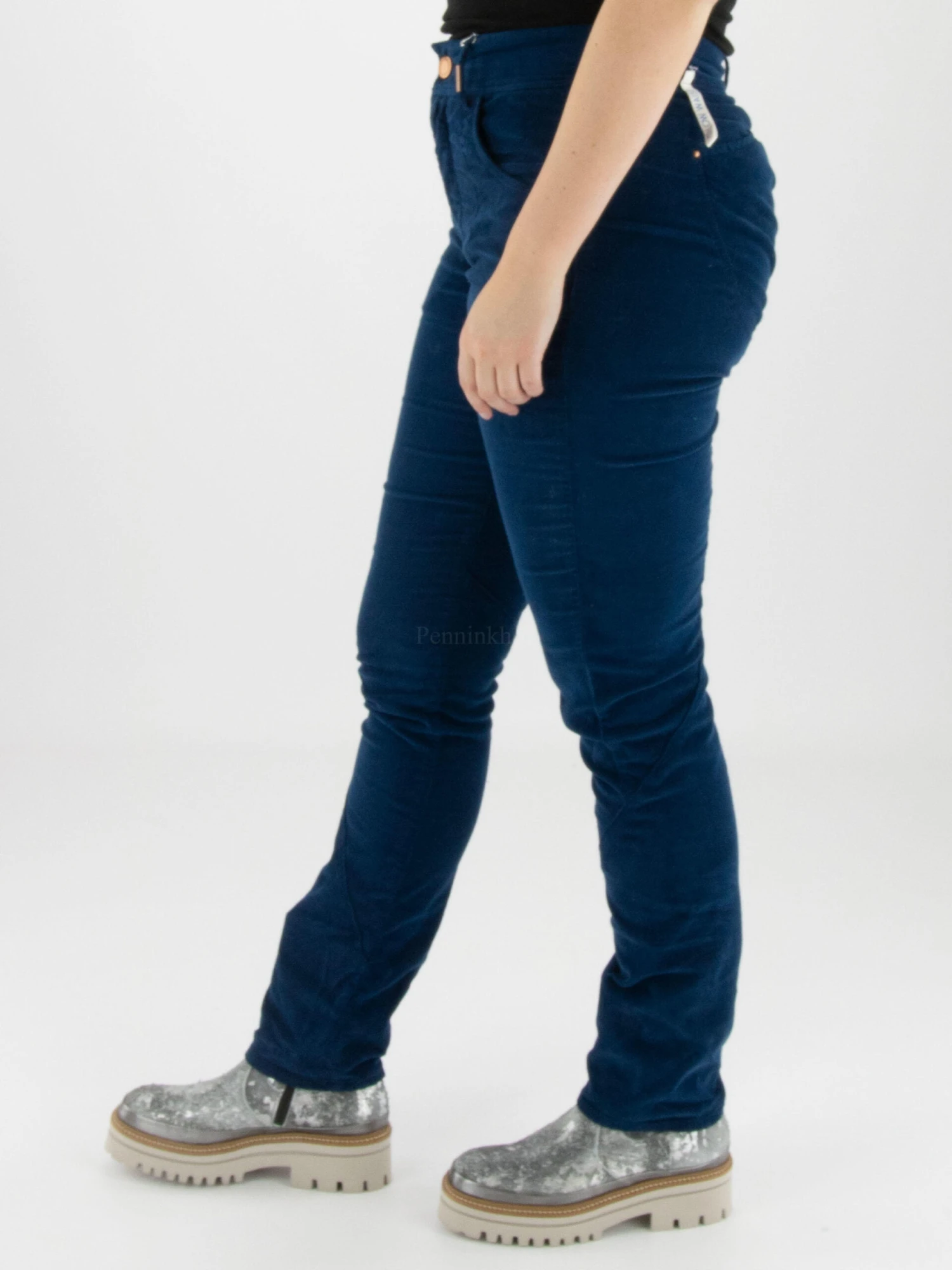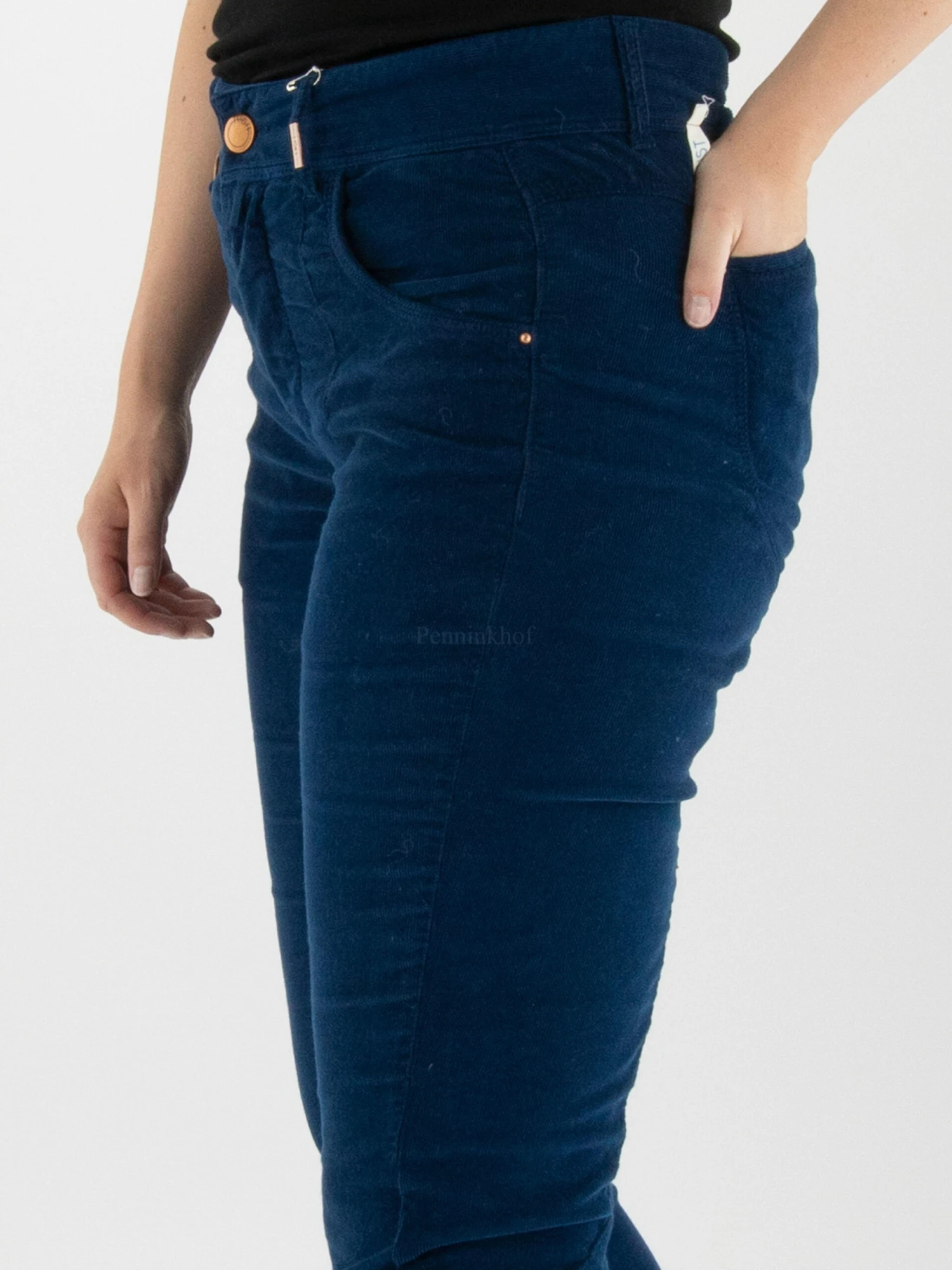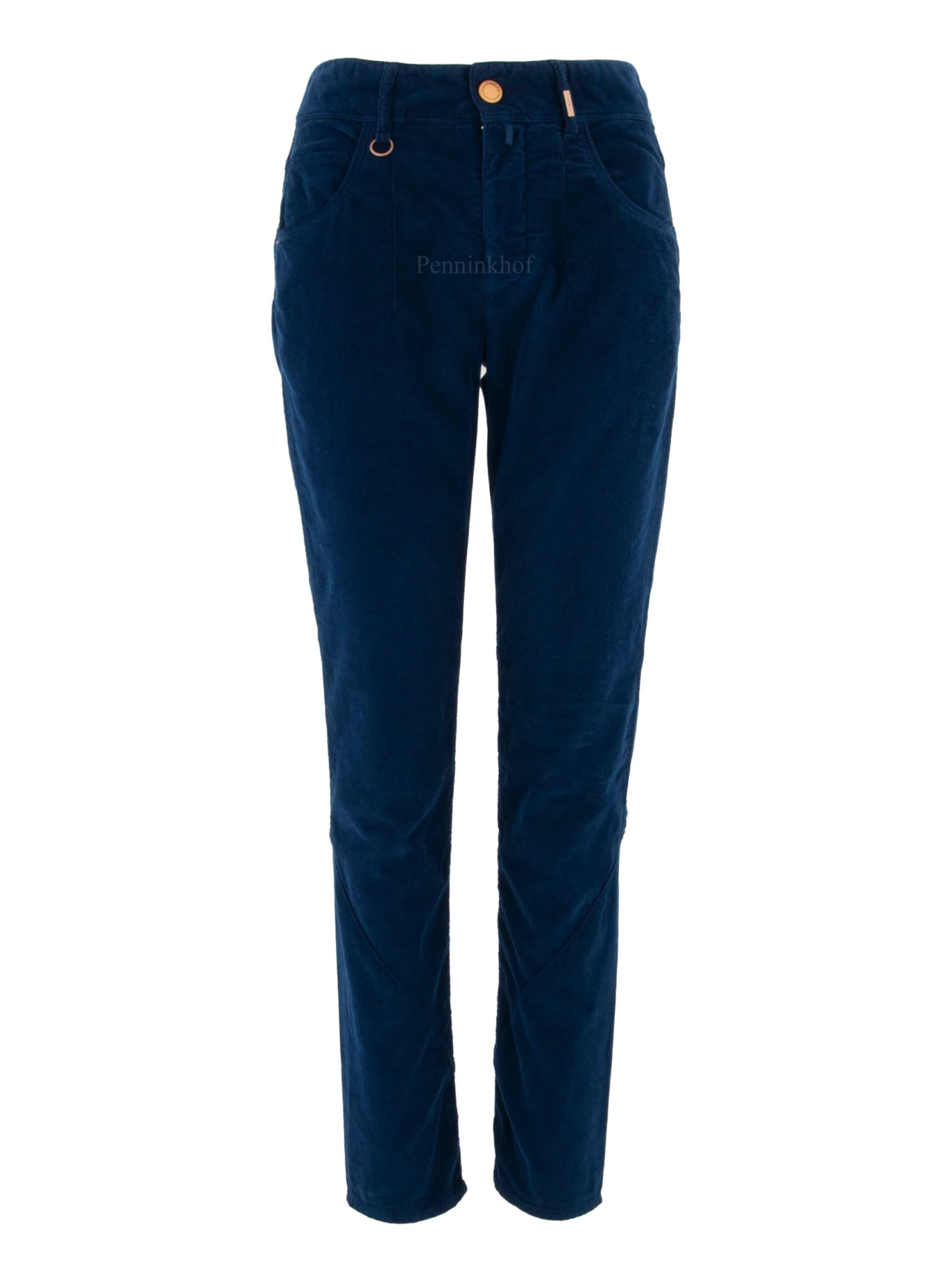Een rib cord broek van High in een volle blauwe kleur. De broek is in een 5 pocket model en heeft enkele decoratieve stiknaden. Deze broek mag op 30 graden worden gewassen.