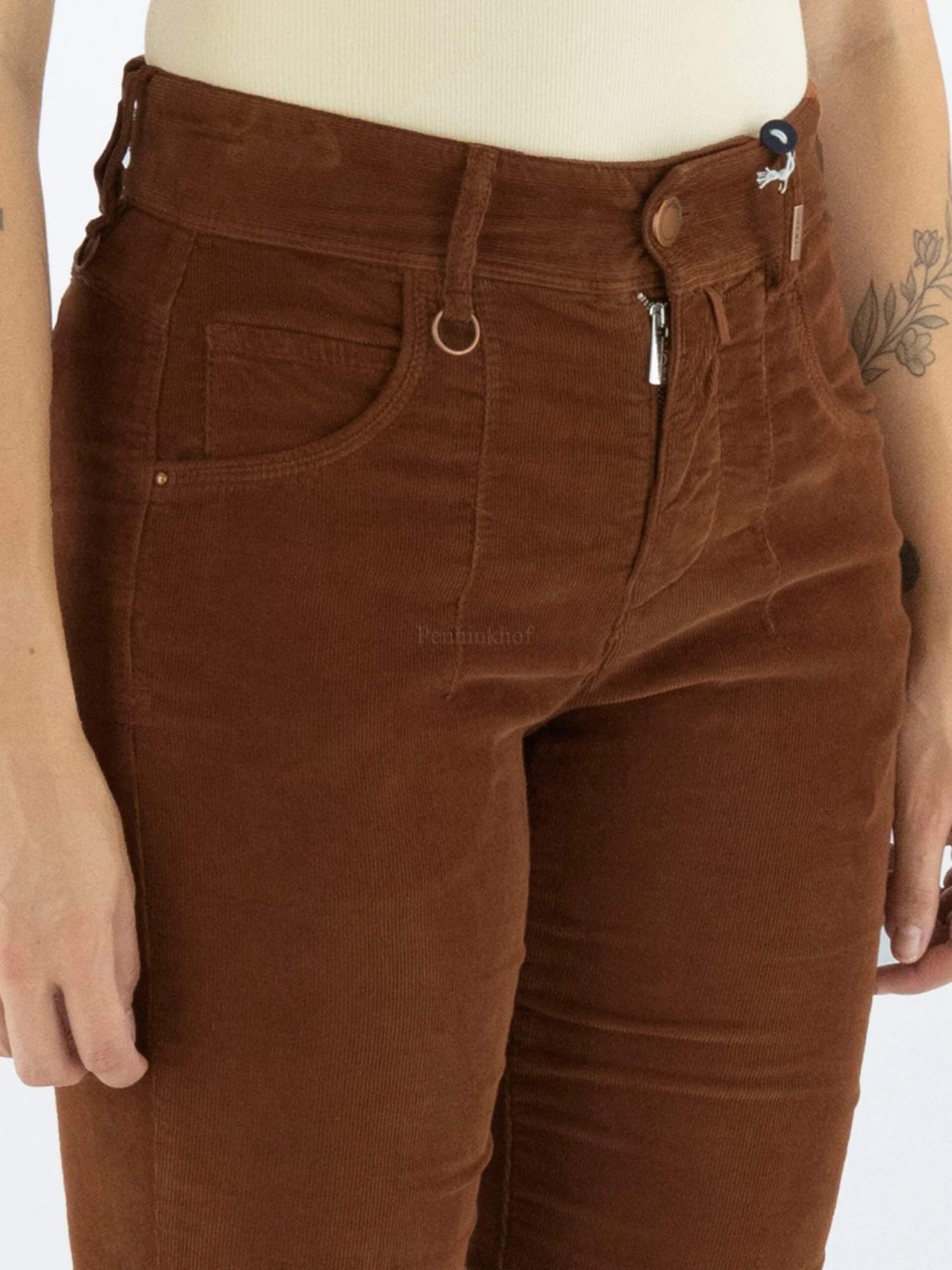 Een rib cord broek van High in een cognac kleur. De broek is in een 5 pocket model en heeft enkele decoratieve stiknaden. Deze broek mag op 30 graden worden gewassen.