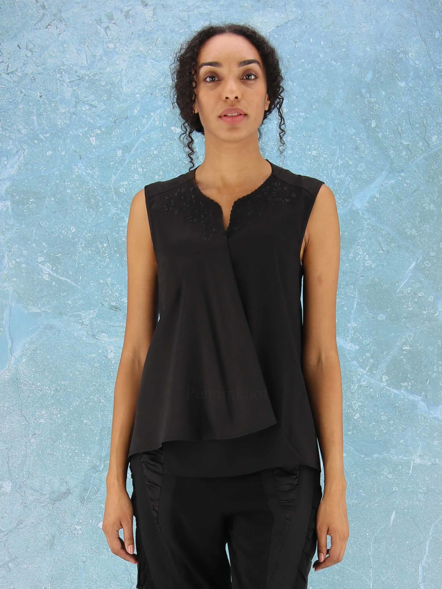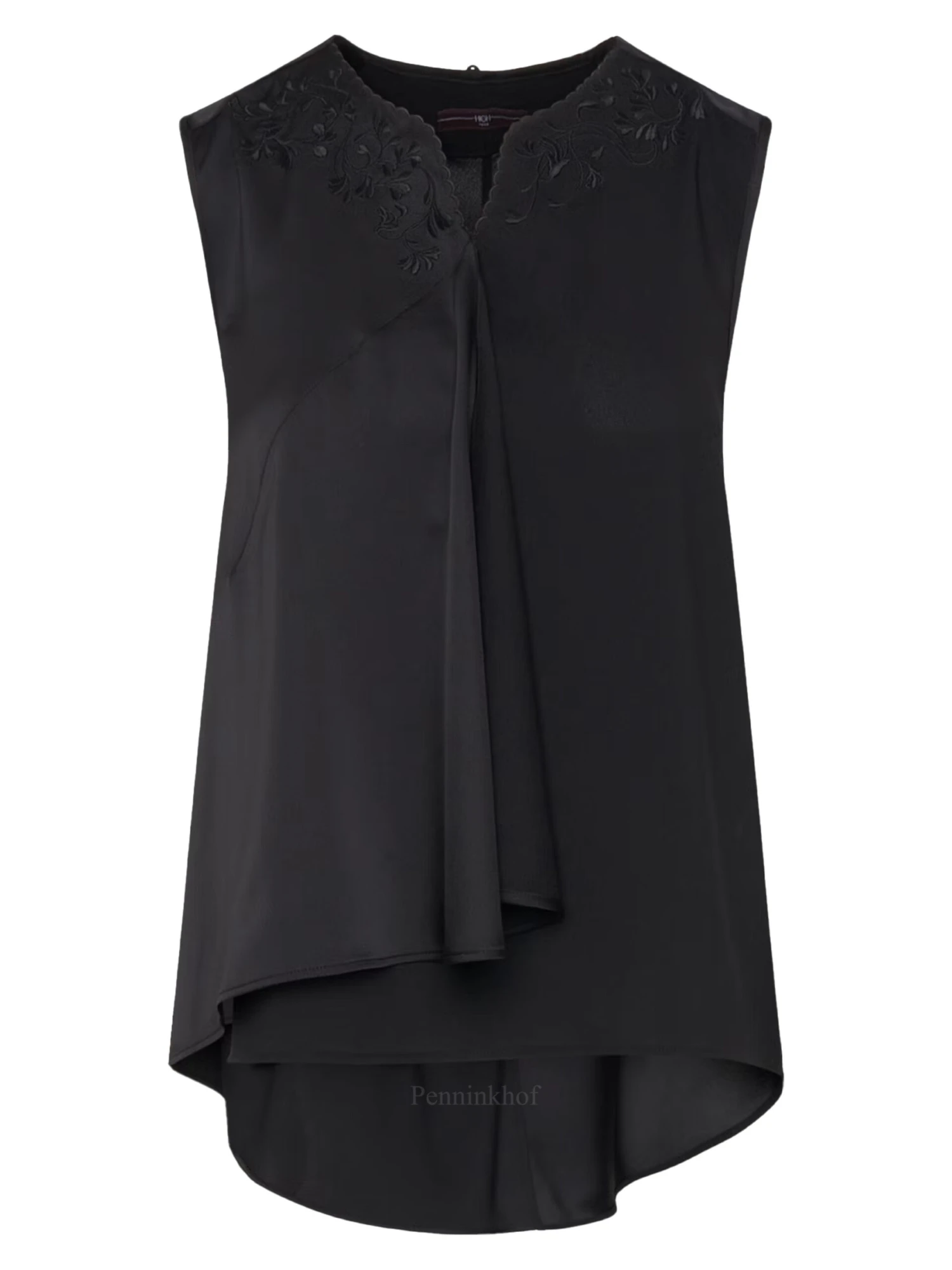 Een overslag top van High in de kleur zwart. Boven de buste is een broderie structuur in de vorm van bloemen. Deze top mag op de hand worden gewassen.