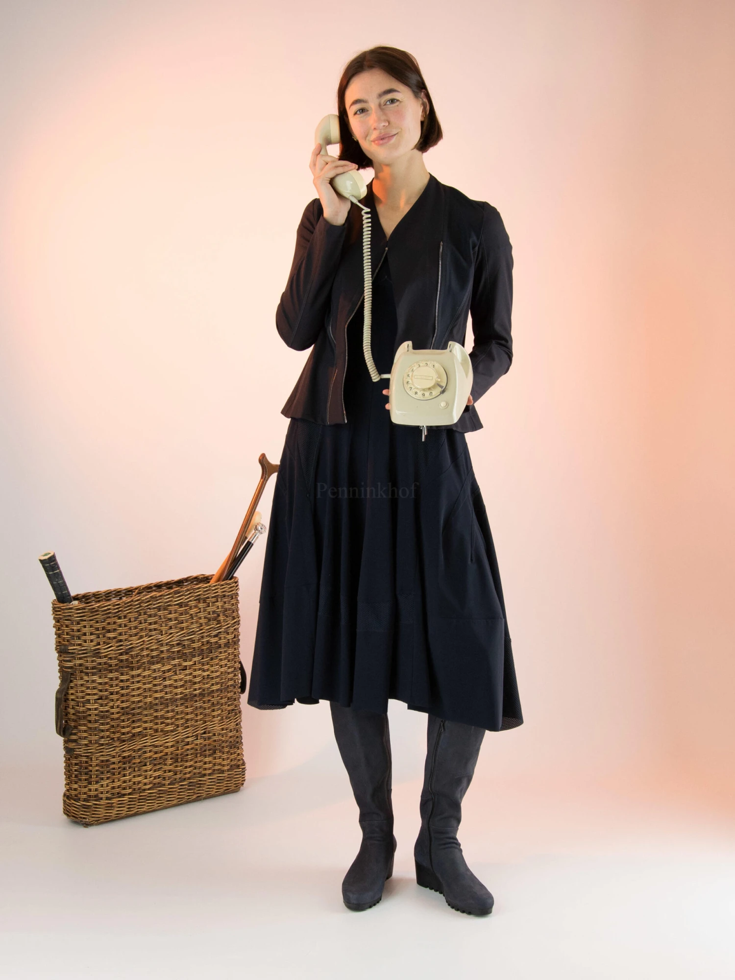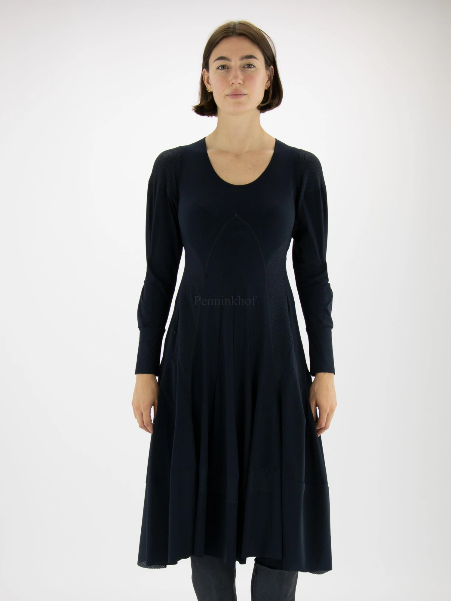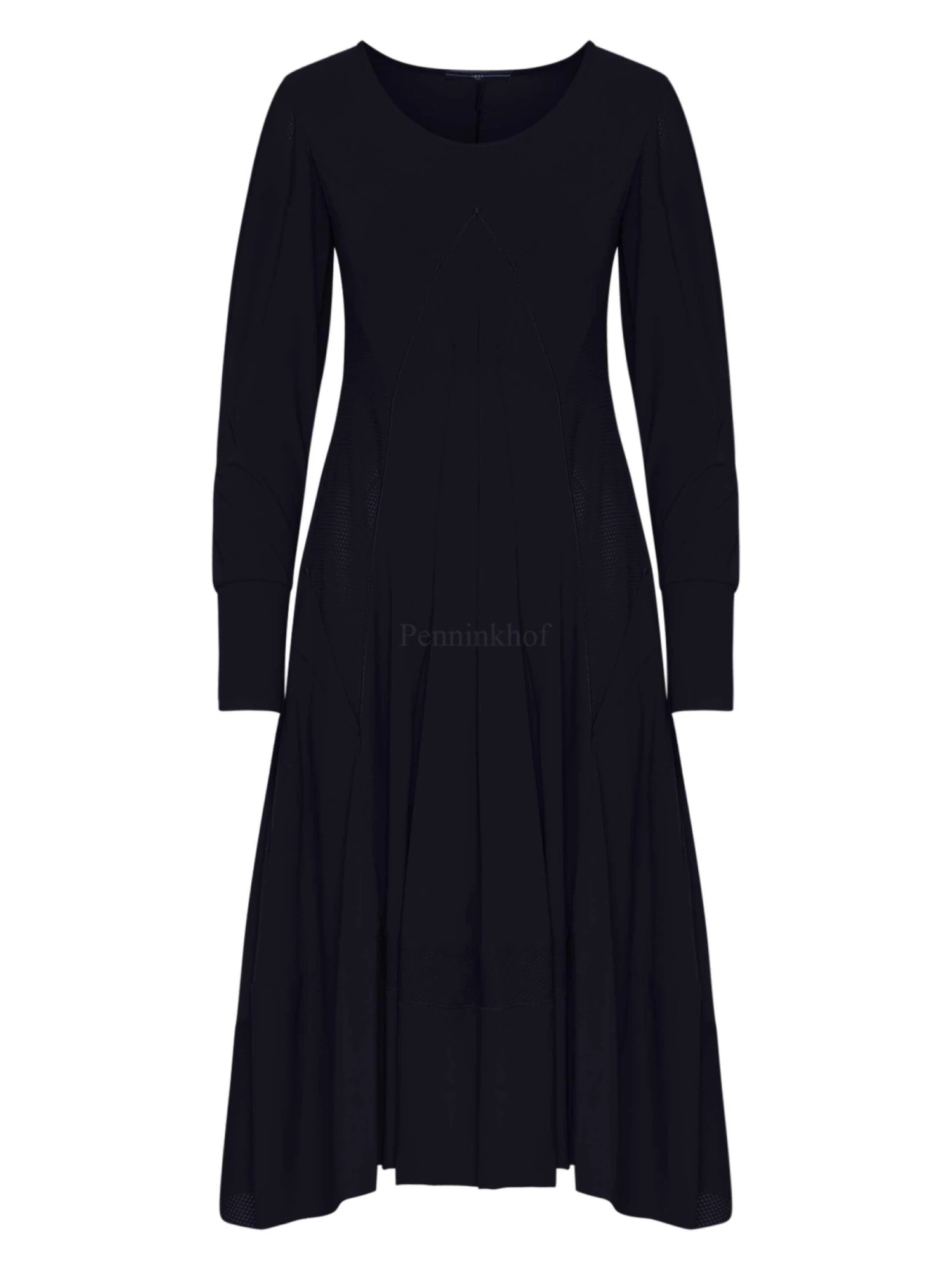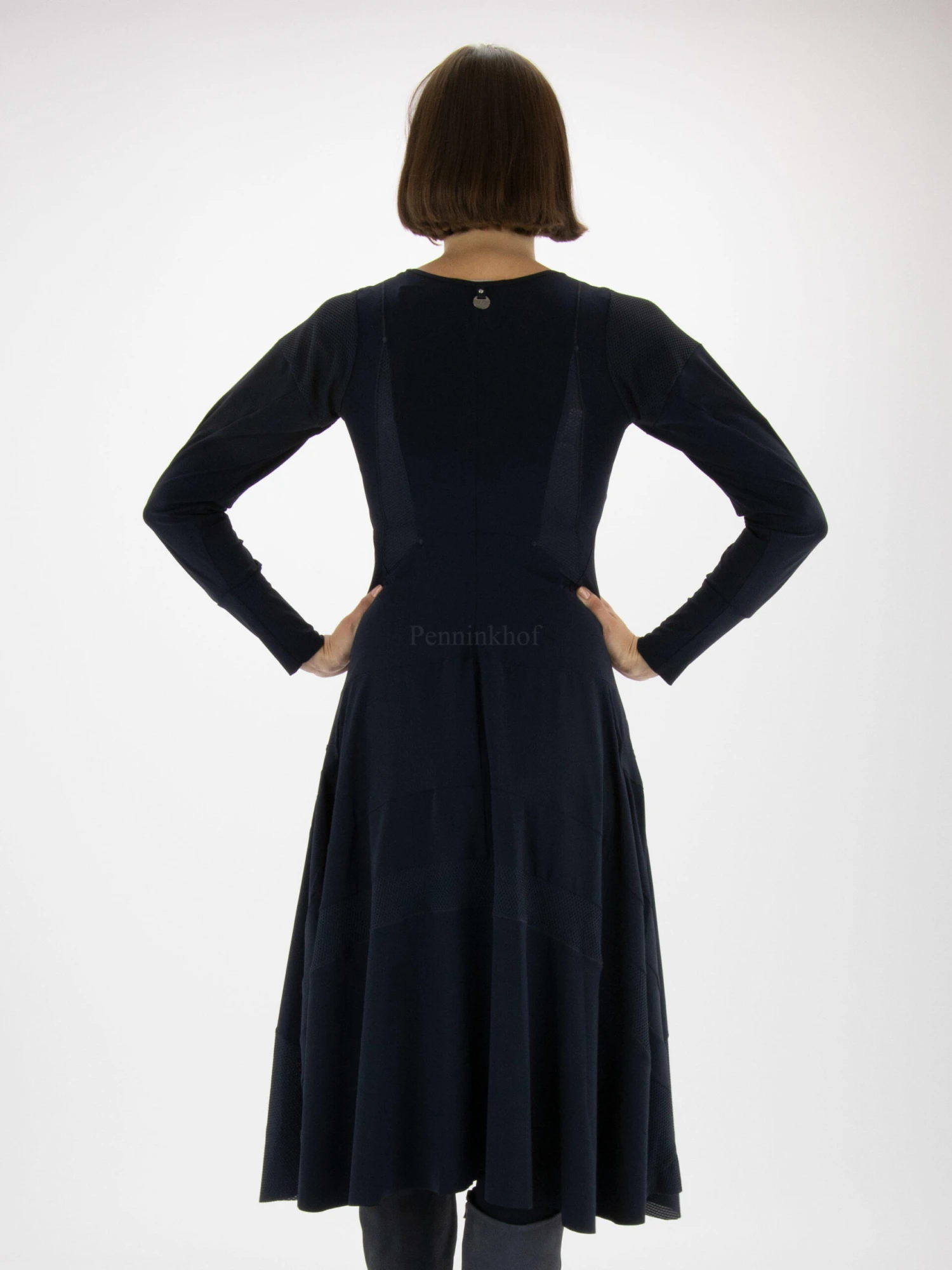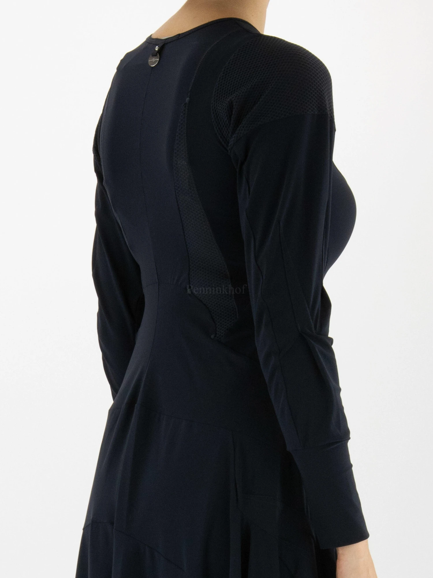 Een jurk van High in de kleur marineblauw. Op de schouders en vanuit de oksels tot onder de taille is de stof in een netstructuur. Dit detail komt terug aan de onderkant van de jurk. Vanuit de taille heeft de jurk aan A – Lijn. De jurk heeft een ronde hals en mag op de hand worden gewassen.