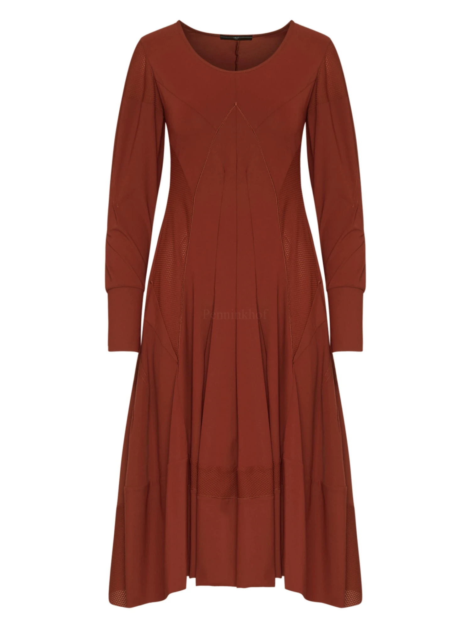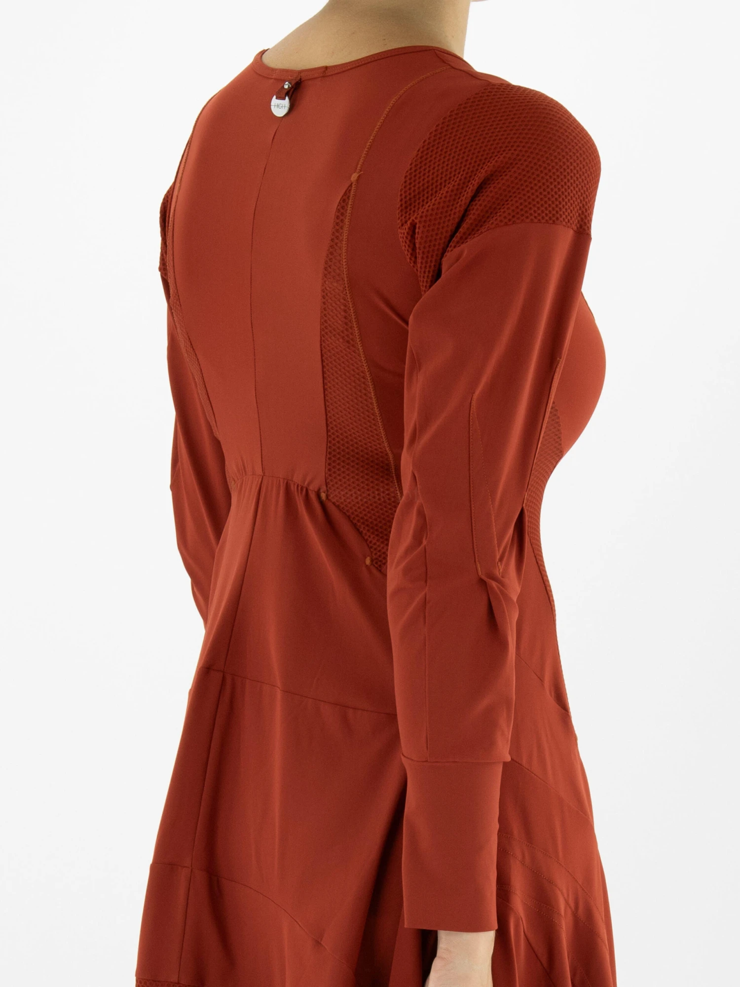 Een jurk van High in de kleur roest. Op de schouders en vanuit de oksels tot onder de taille is de stof in een netstructuur. Dit detail komt terug aan de onderkant van de jurk. Vanuit de taille heeft de jurk aan A – Lijn. De jurk heeft een ronde hals en mag op de hand worden gewassen.