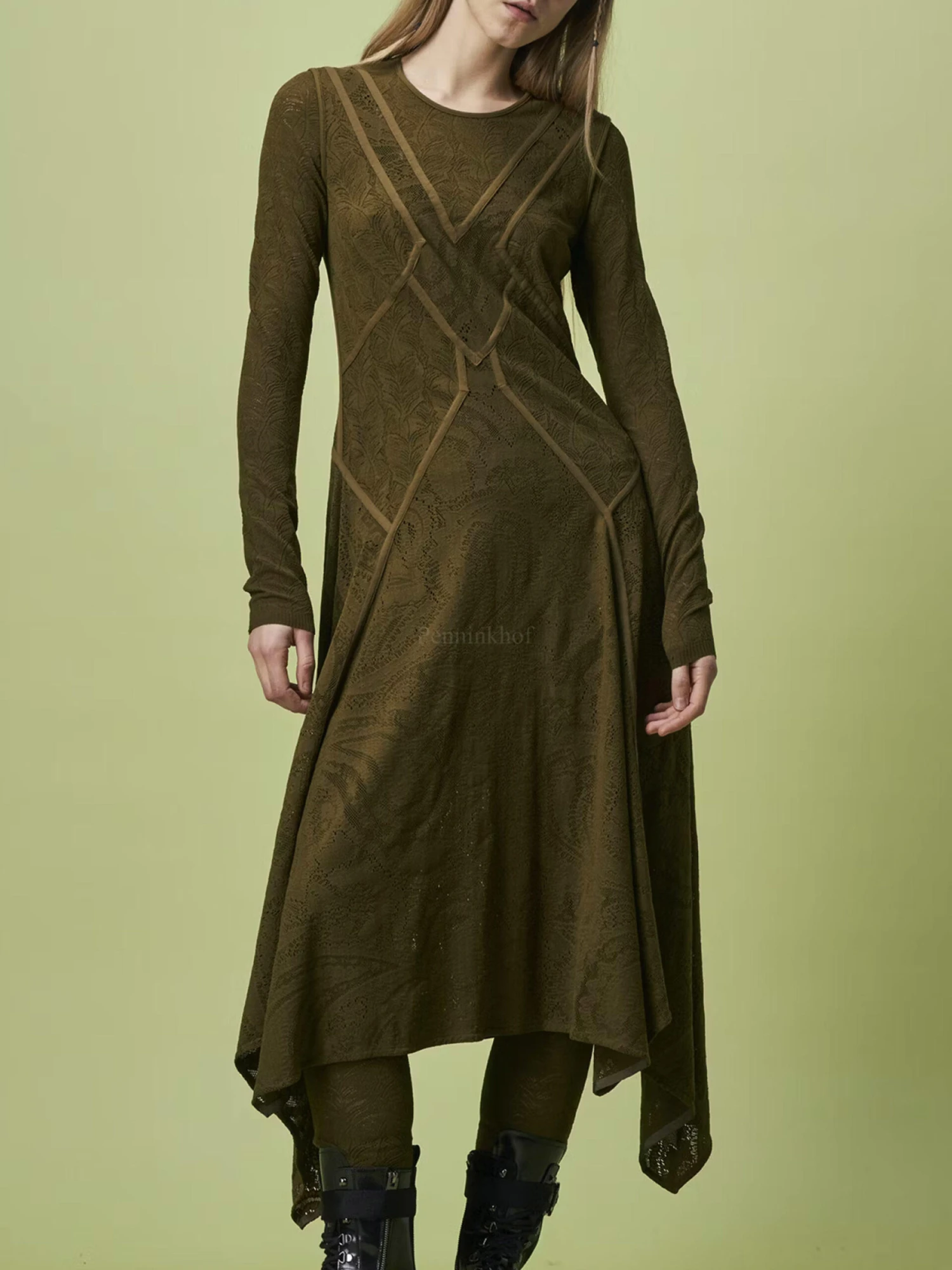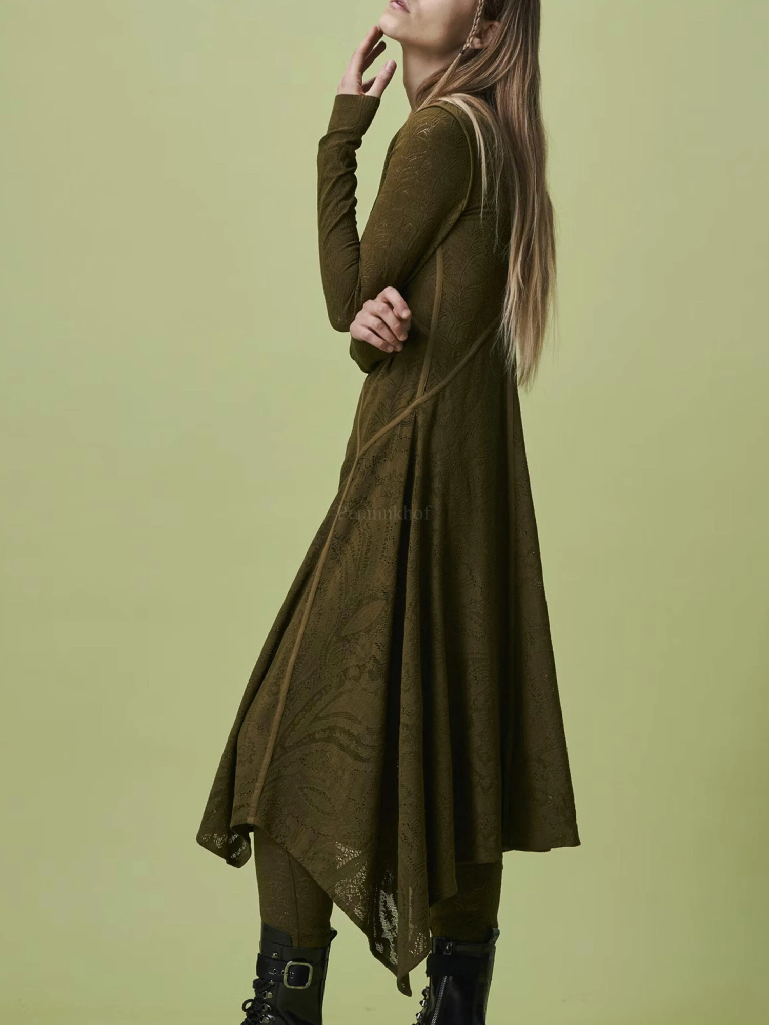 Een fijn geperforeerde jurk van High in een barok patroon in de kleur olijfgroen. Vanuit de taille heft de jurk een A – Lijn. De jurk heeft een onderjurk en mag op de hand worden gewassen.