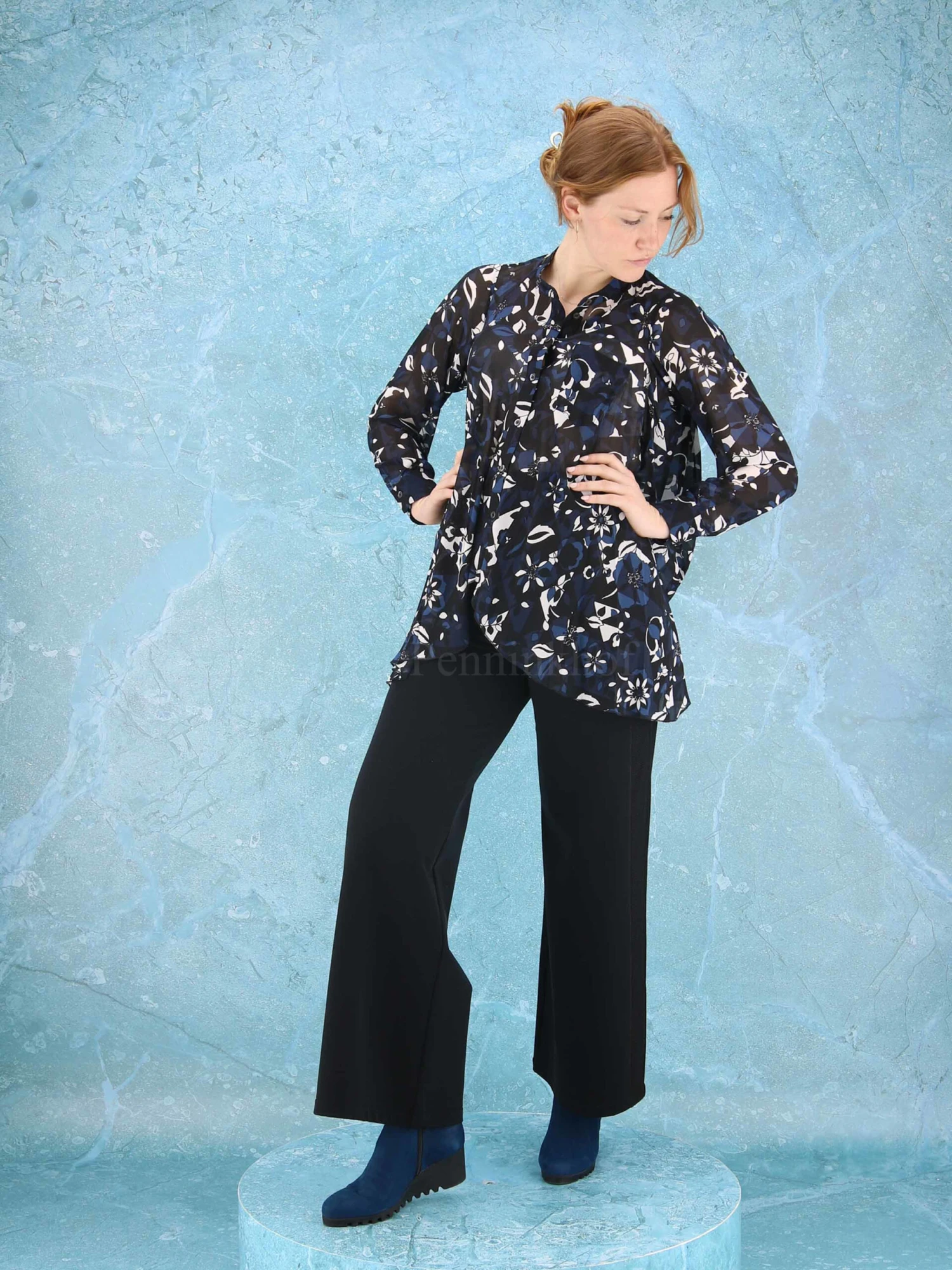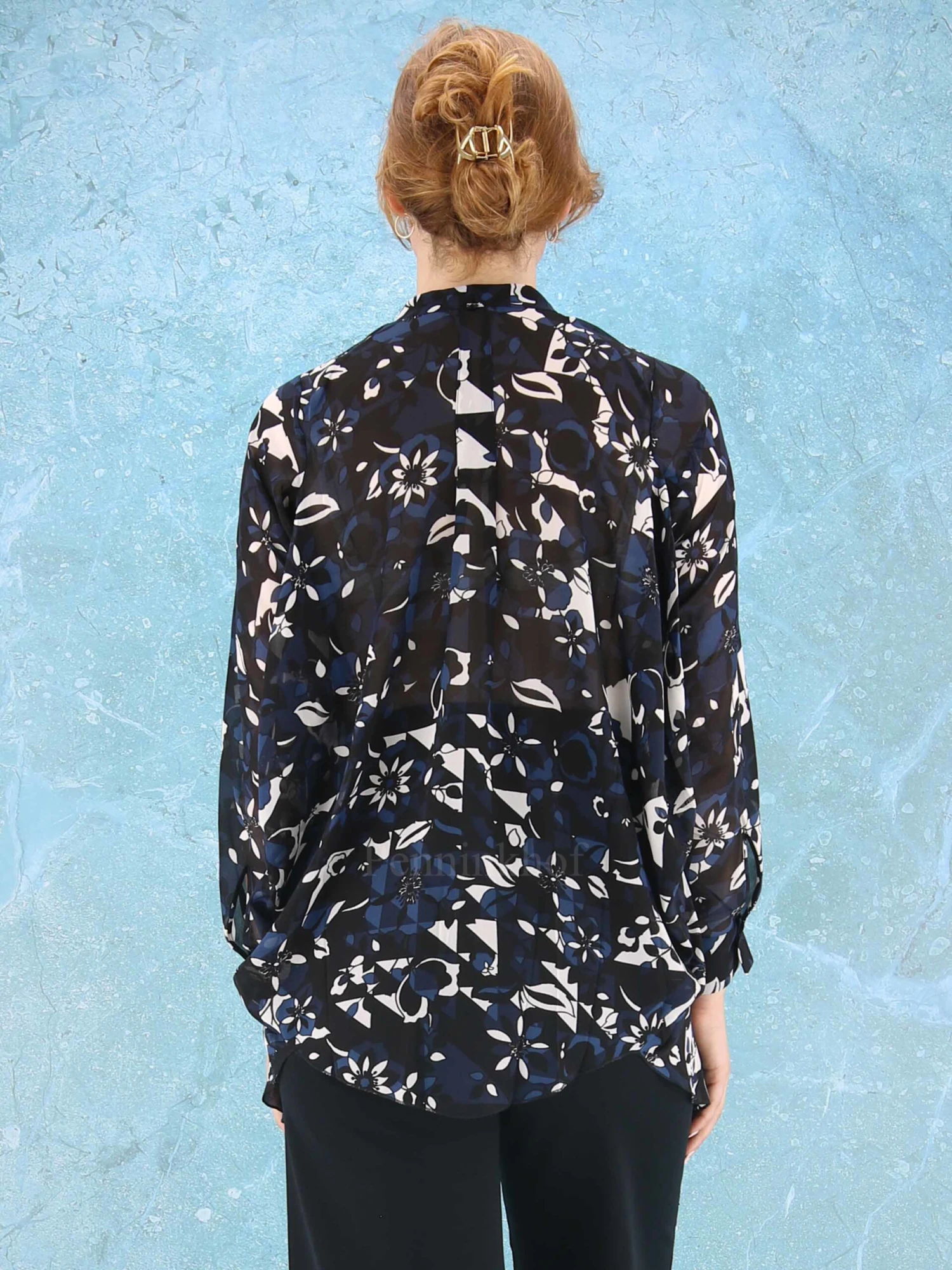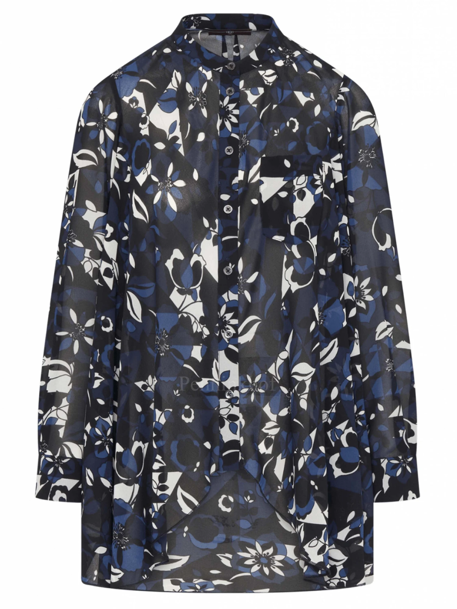 Een transparante blouse van High in een grafische print met de kleuren nachtblauw, zwart en roomwit. Aan de achterkant zijn vanuit de schouders 2 plooien. deze blouse mag op de hand worden gewassen.