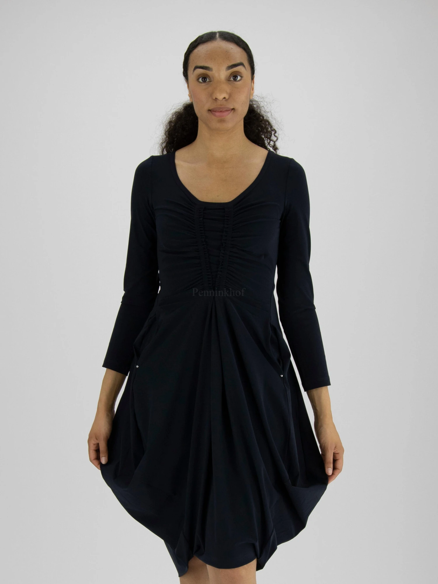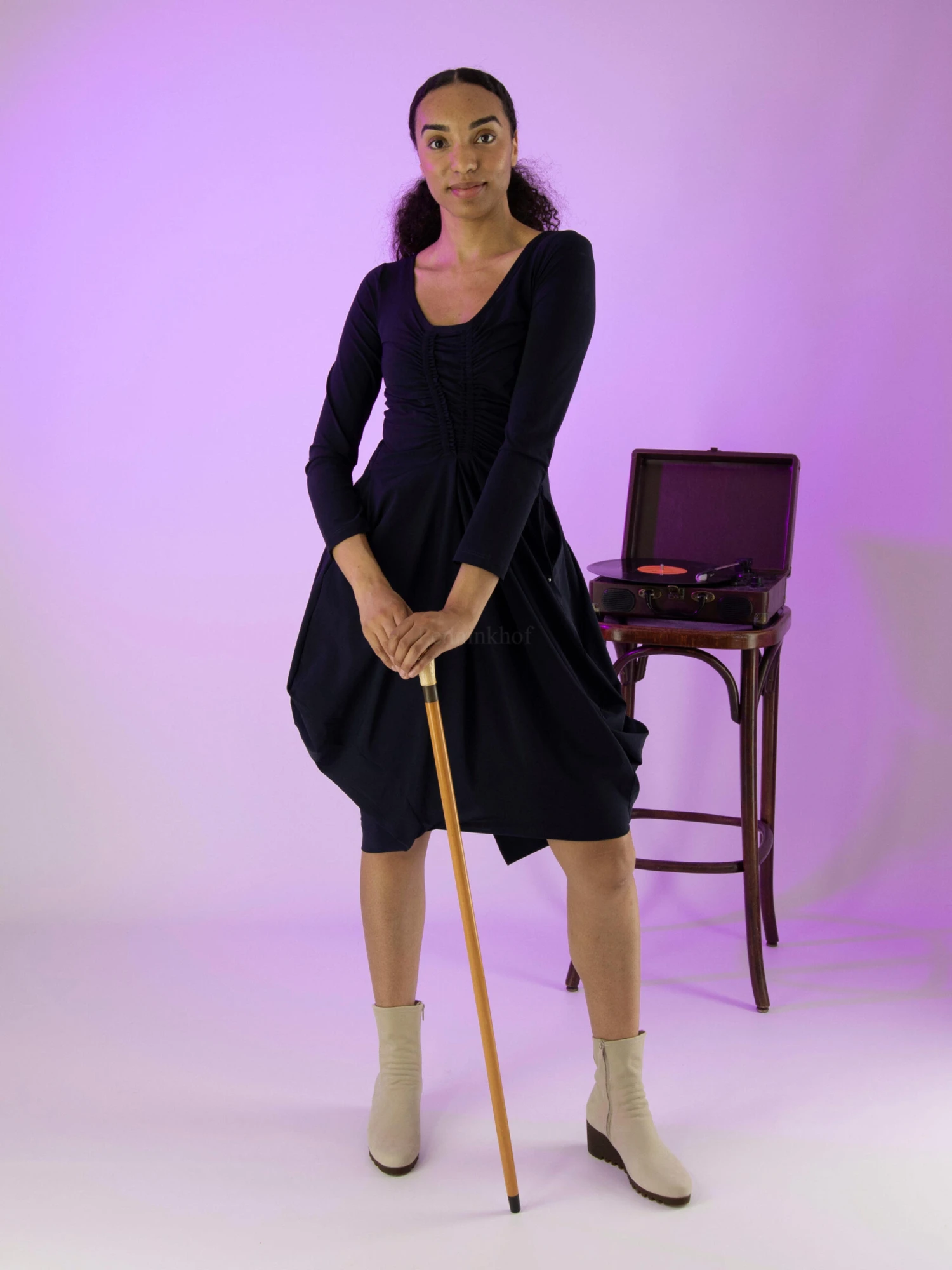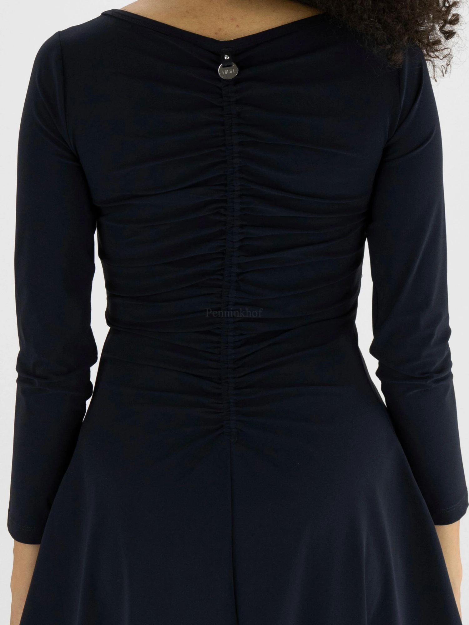 Een jurk van High in de kleur marineblauw. Vanuit het midden van de diepe ronde hals Zijn er 2 stiknaden waarlangs de stof fijn geplooid is, naar de taille toe. Ter hoogte van de taille heeft de jurk steekzakken. In het midden van de achterkant is de stof fijn geplooid langs de stiknaad tot onder de taille. Deze jurk mag op 30 graden worden gewassen.