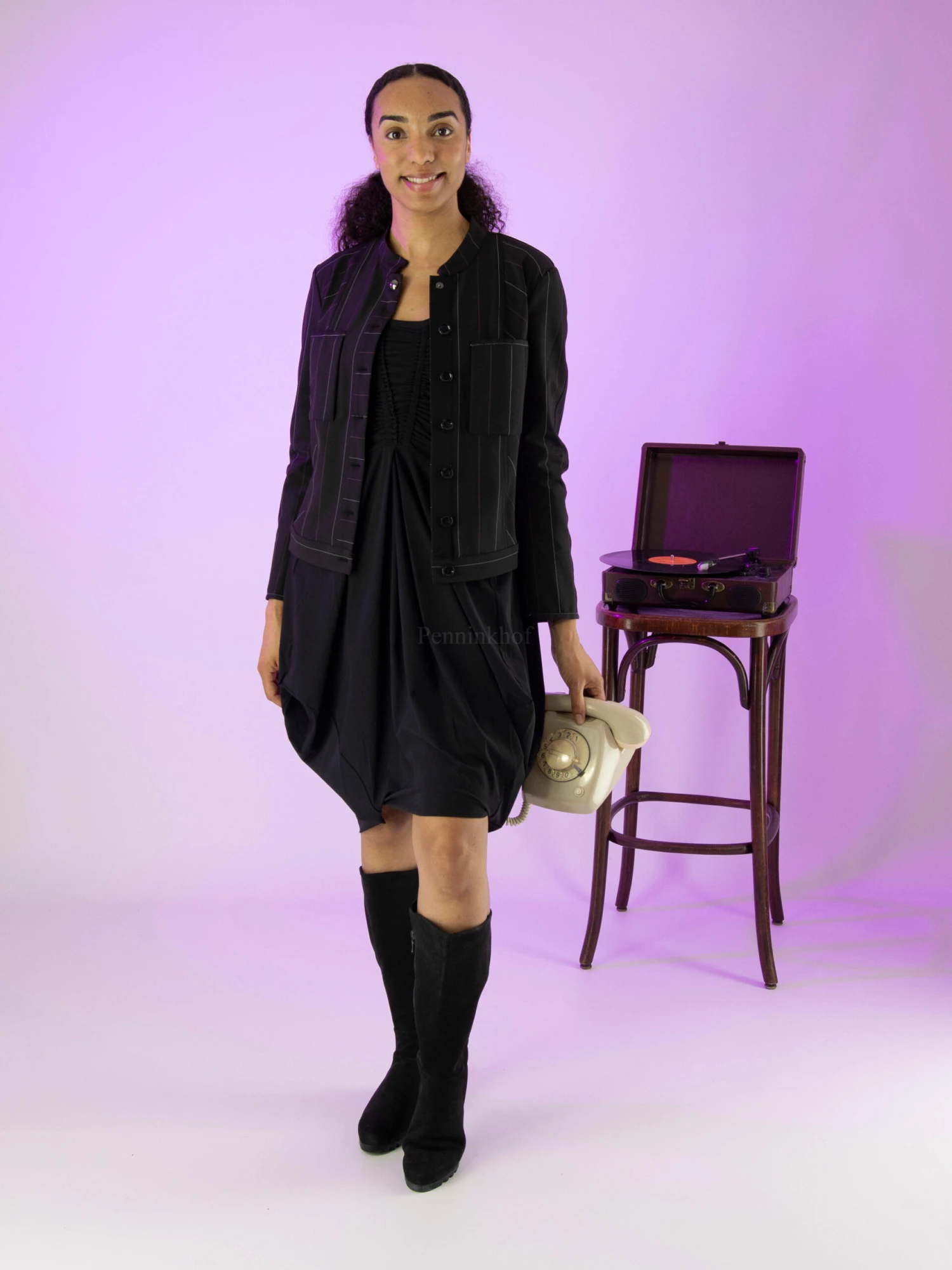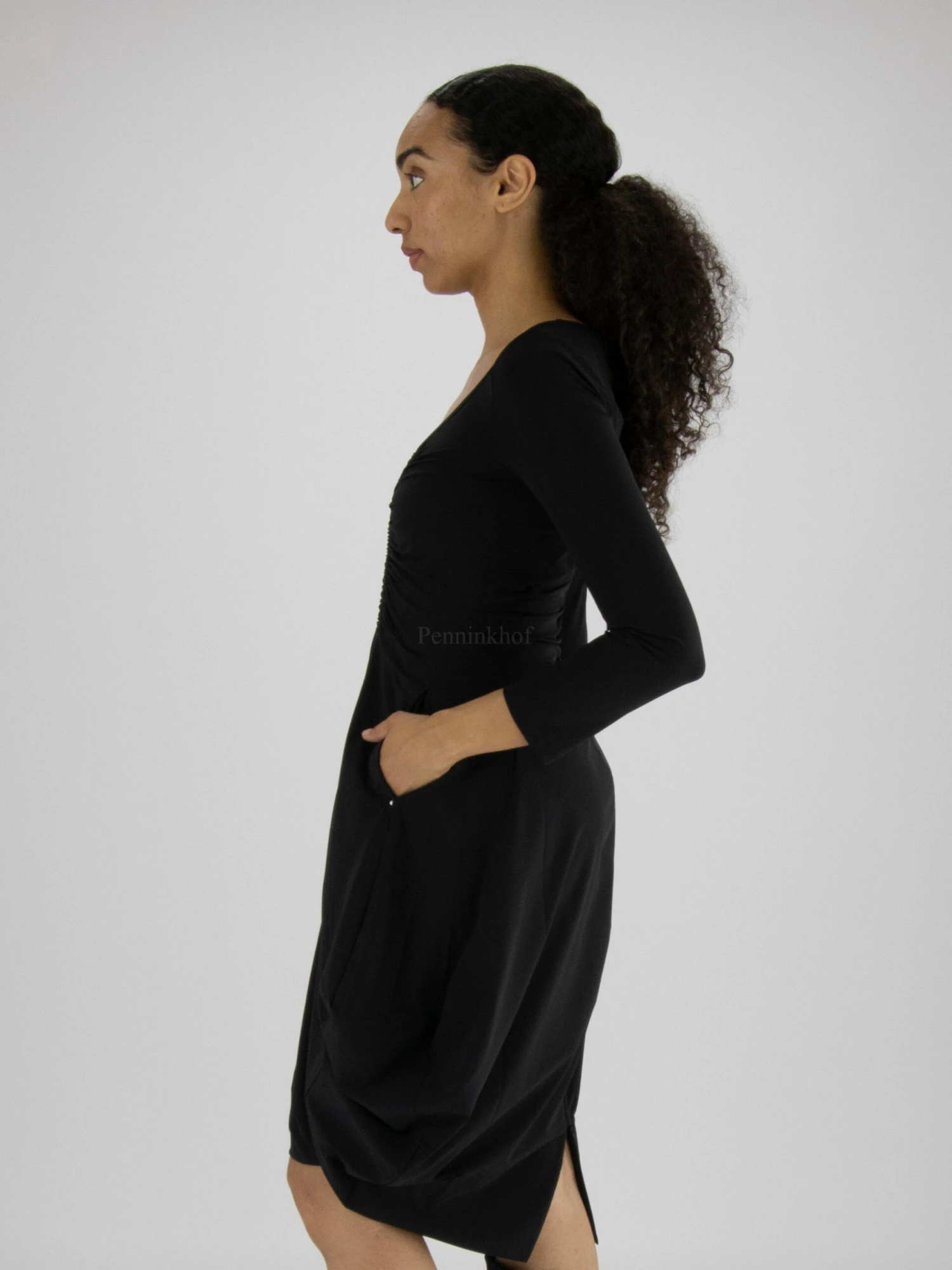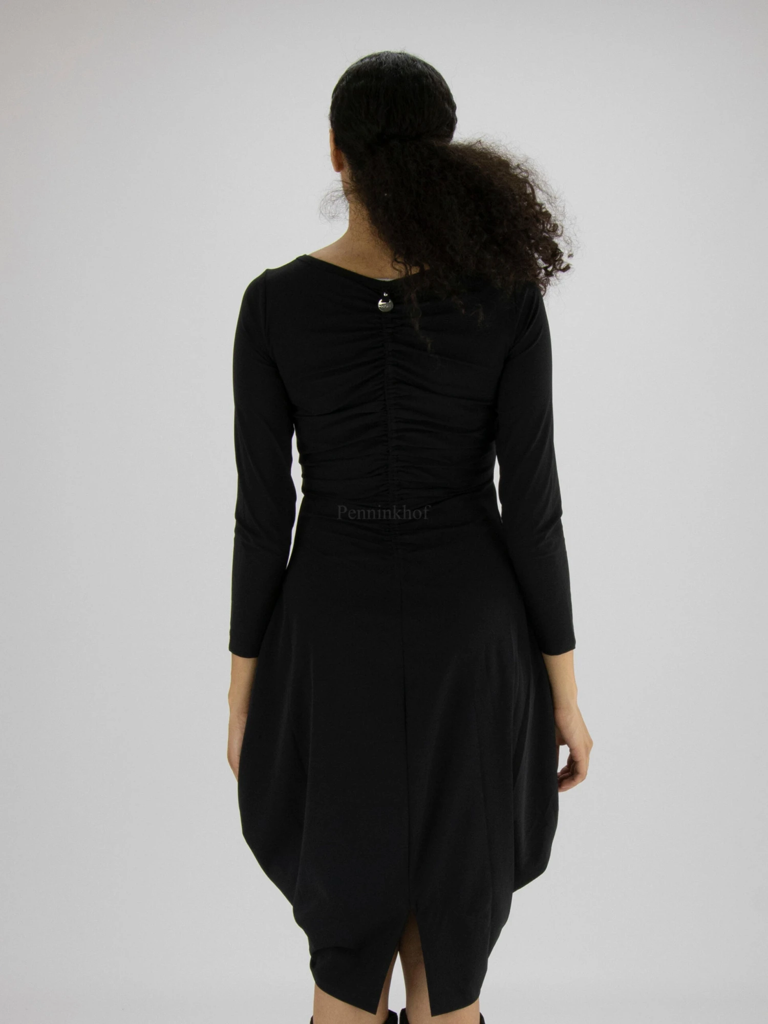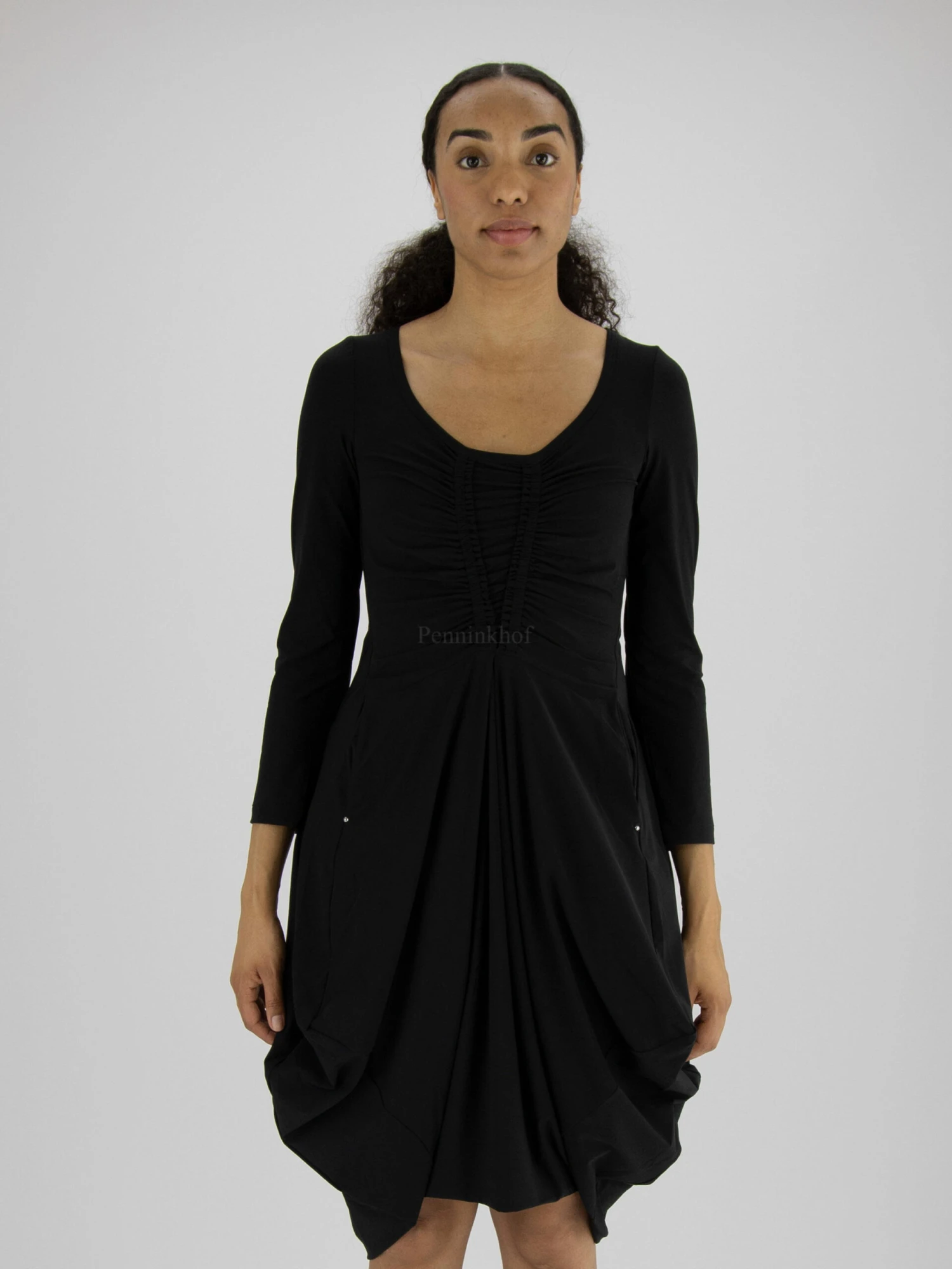 Een jurk van High in de kleur zwart. Vanuit het midden van de diepe ronde hals Zijn er 2 stiknaden waarlangs de stof fijn geplooid is, naar de taille toe. Ter hoogte van de taille heeft de jurk steekzakken. In het midden van de achterkant is de stof fijn geplooid langs de stiknaad tot onder de taille. Deze jurk mag op 30 graden worden gewassen.