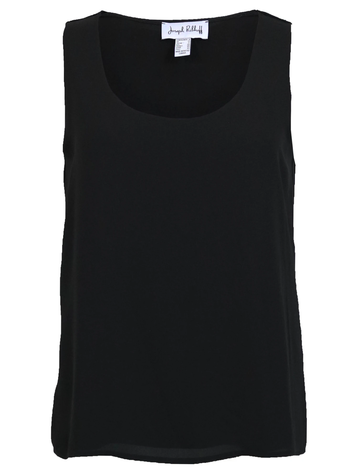Een top van Joseph Ribkoff in de kleur zwart. De top heeft een diepe ronde hals en de voorkant heeft een dubbele stof. Deze top mag op de hand worden gewassen.