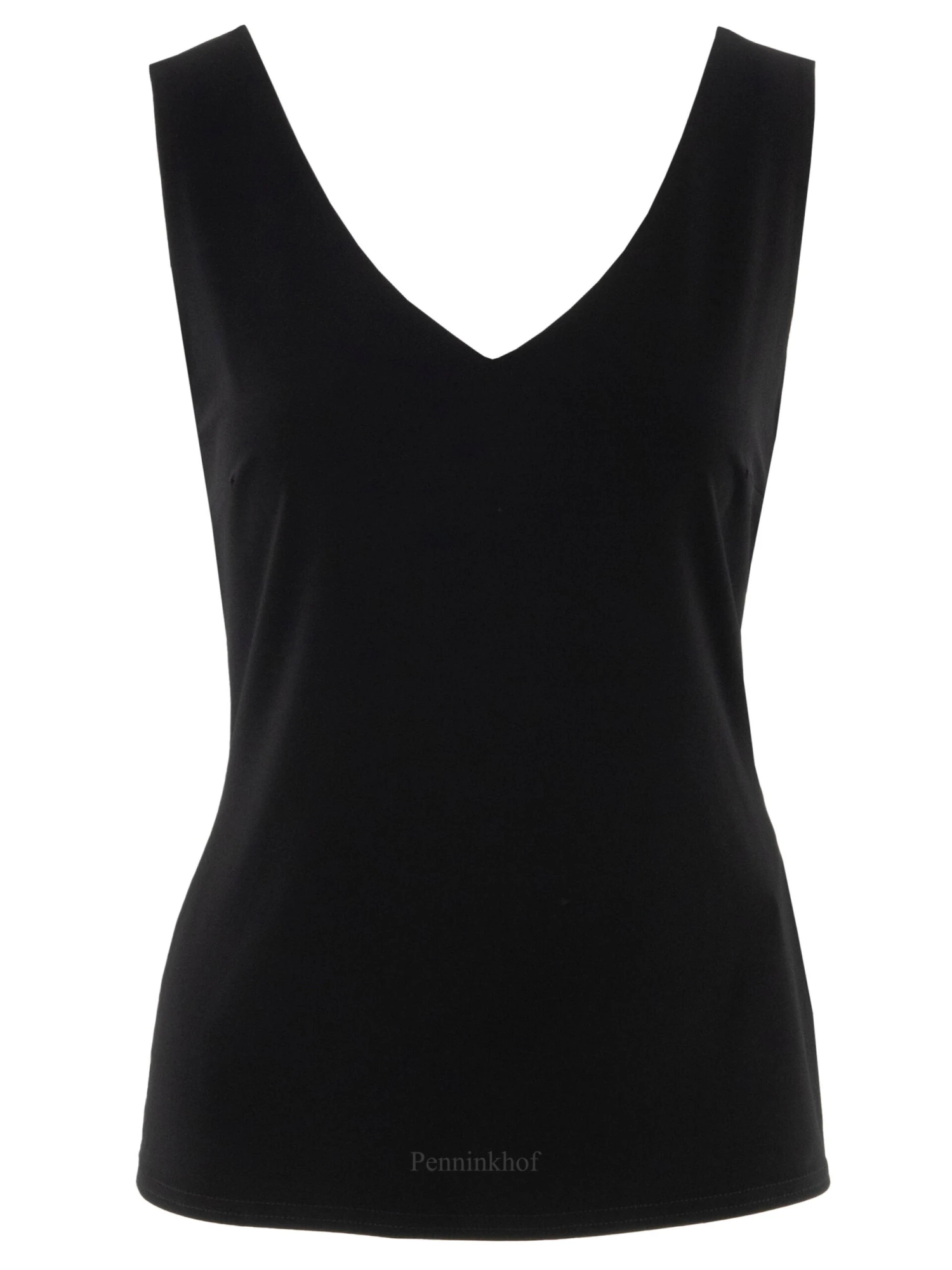 Een basis top van Joseph Ribkoff in de kleur zwart. De top heeft aan de voor – en achterkant een V – Hals. De schouderbandjes zijn 5 cm breed. Deze top mag op de hand worden gewassen.