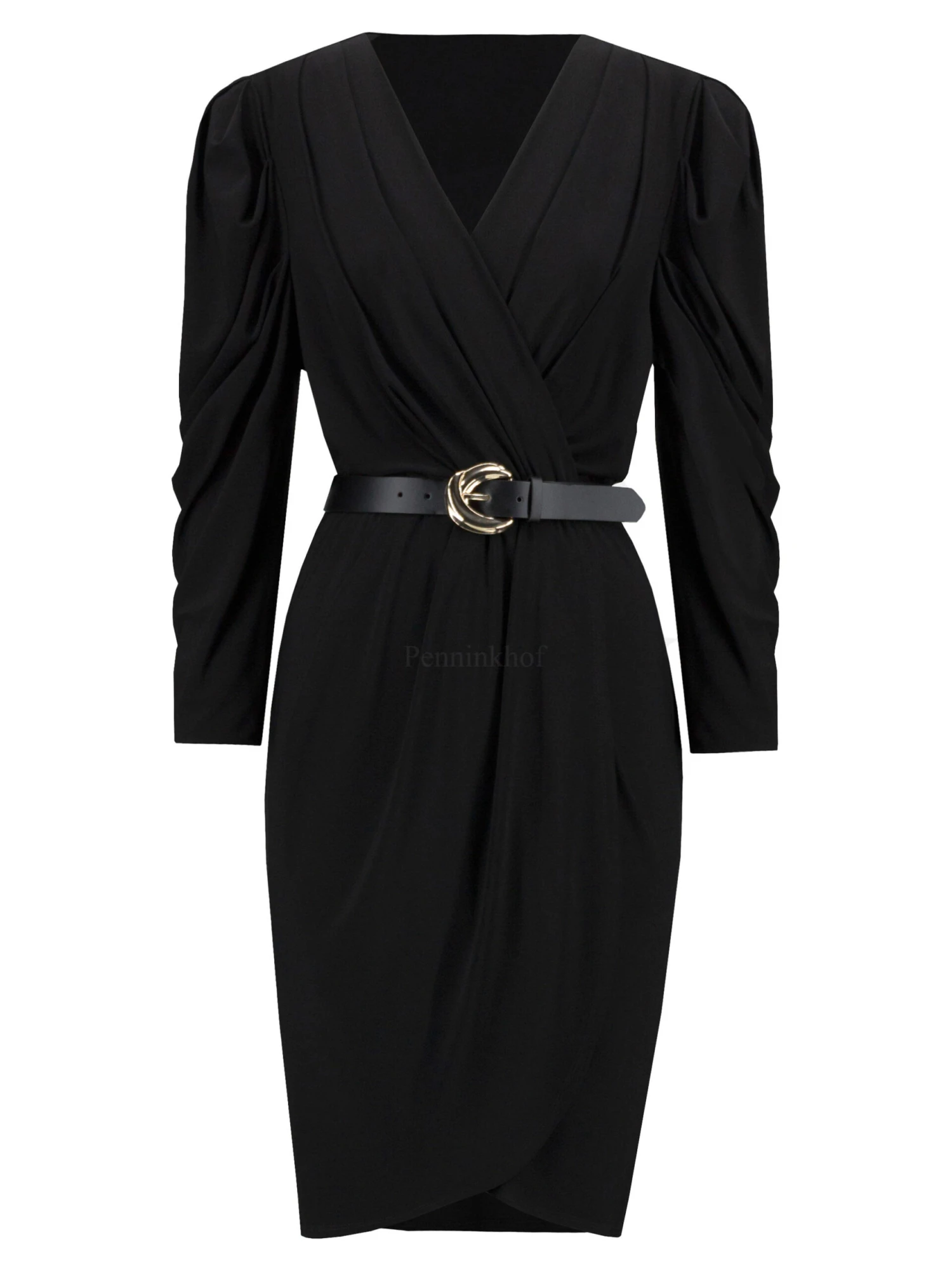 Een overslag jurk van Joseph Ribkoff in de kleur zwart. Bij de mouwinzet zijn meerdere plooien wat een drapeer effect geeft. In de taille is een zwarte ceintuur. Vanaf de taille heeft het onderste deel een overslag in de rok. Deze jurk mag op de hand worden gewassen.