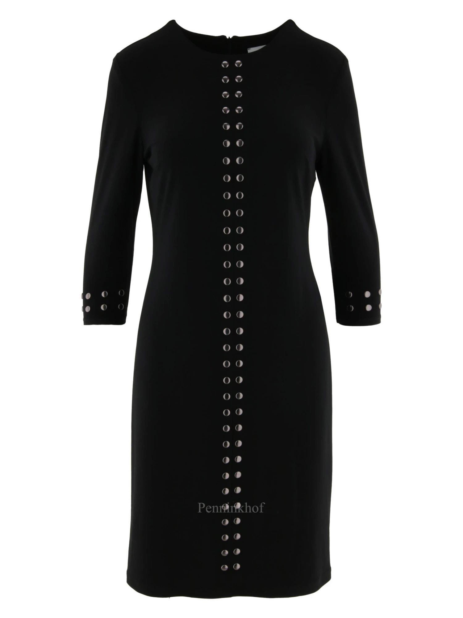 Een jurk van Joseph Ribkoff in de kleur zwart. Vanuit het midden van de ronde hals is een naad over de gehele lengte van de voorkant. Langs de naad zijn nikkel kleurige ronde studs. Aan het uiteinde van de halflange mouwen is een dubbele rij studs. Deze jurk mag op de hand worden gewassen.