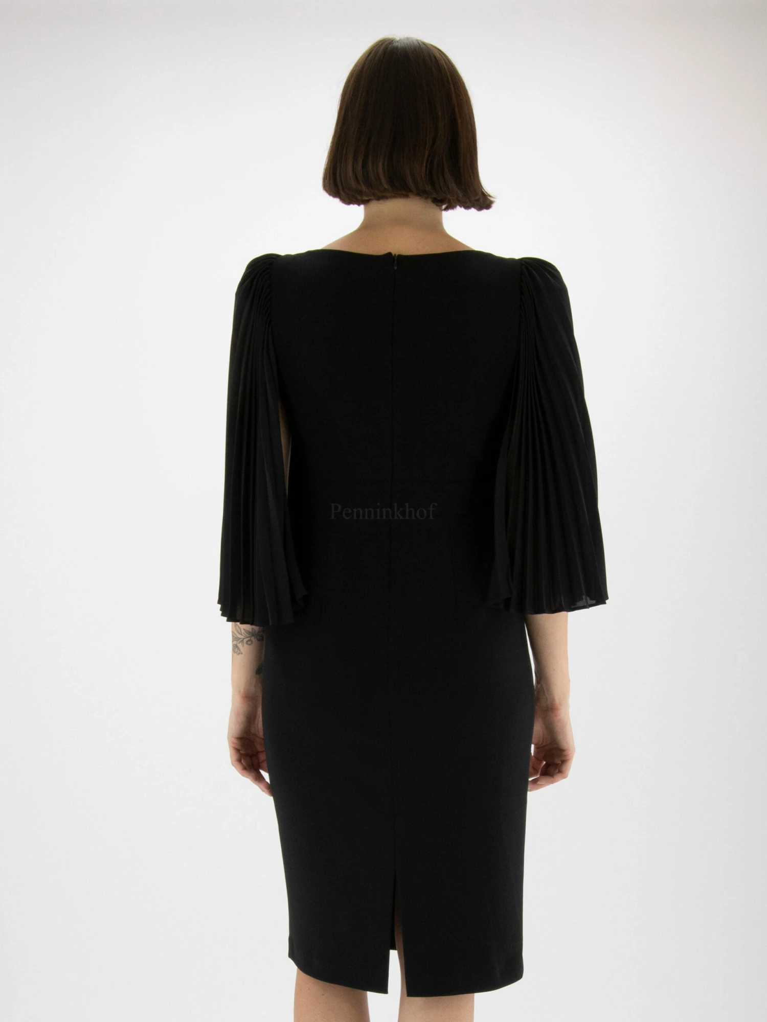 Een jurk van Joseph Ribkoff in de kleur zwart. De jurk heeft halflange geplisseerde vleermuismouwen die aan de onderkant open zijn. In de taille is een dubbele taillenaad. Deze jurk mag op de hand worden gewassen.