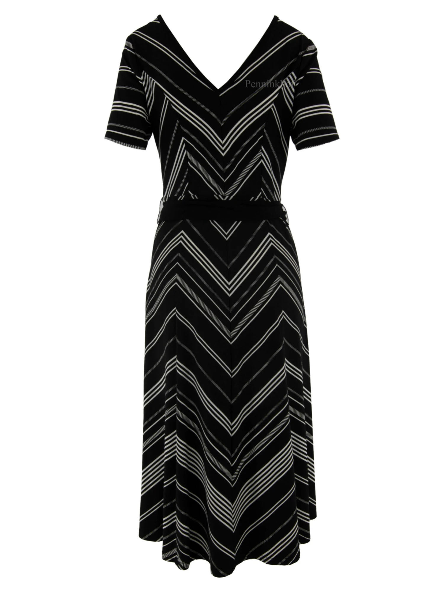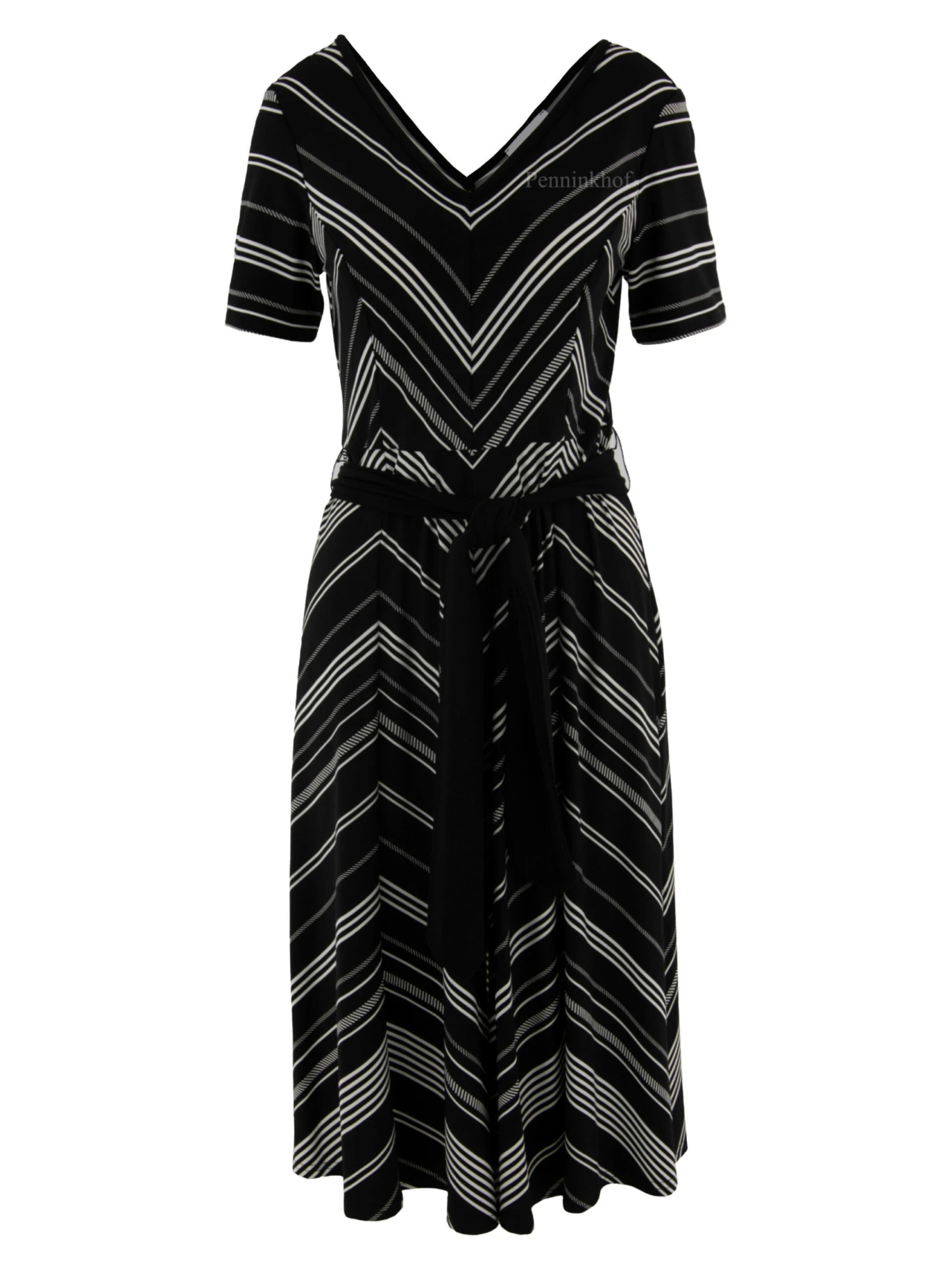 Een jurk van Joseph Ribkoff in een print van diagonale strepen met de kleuren zwart en wit. De jurk heeft aan de voor en achterkant een V – Hals. In de taille is een zwarte ceintuur van stof. Vanuit de taille heeft de jurk een A – Lijn en aan de onderkant zijn aan de zijkanten enkle splitten. Deze jurk mag op de hand worden gewassen.