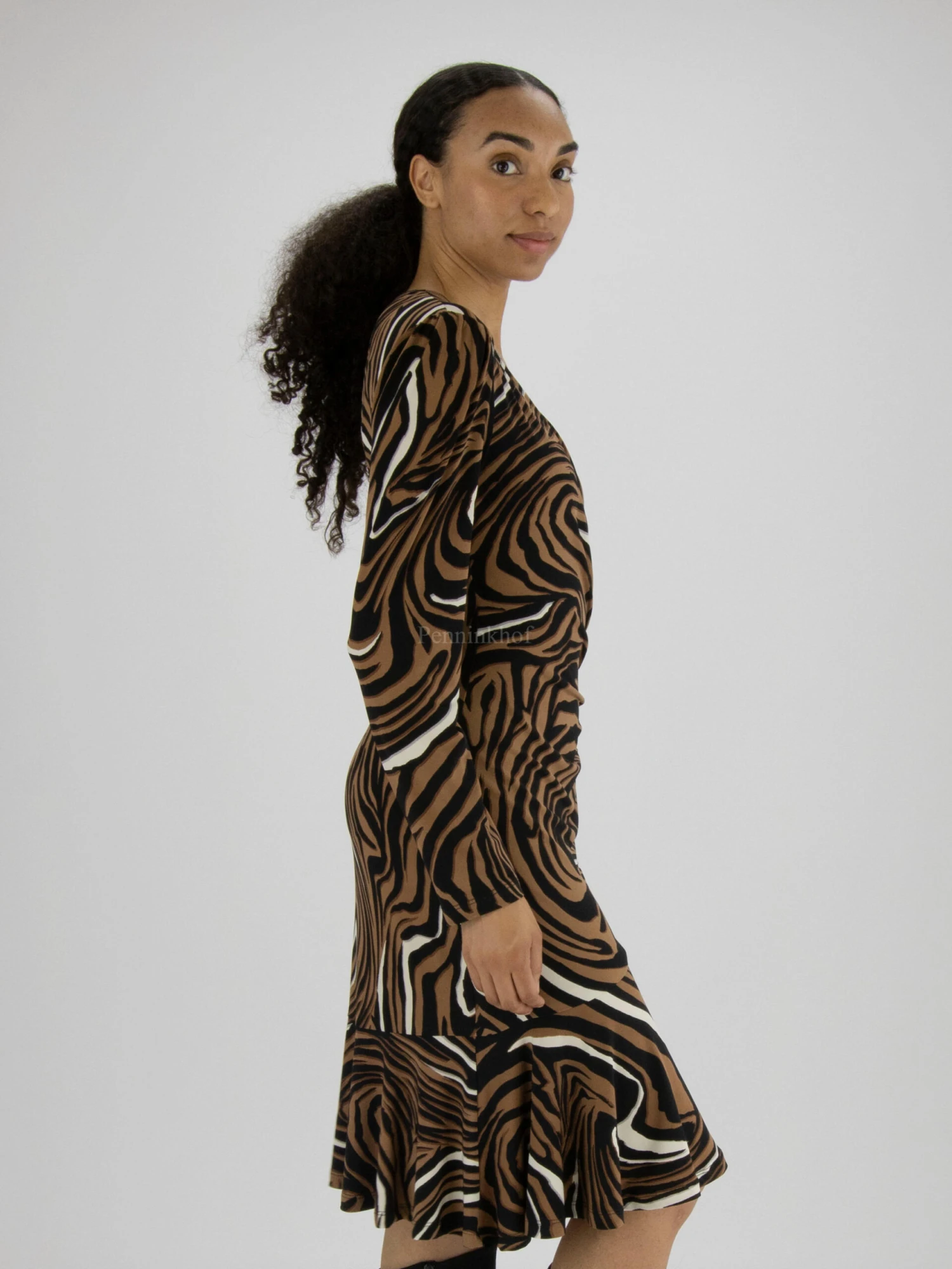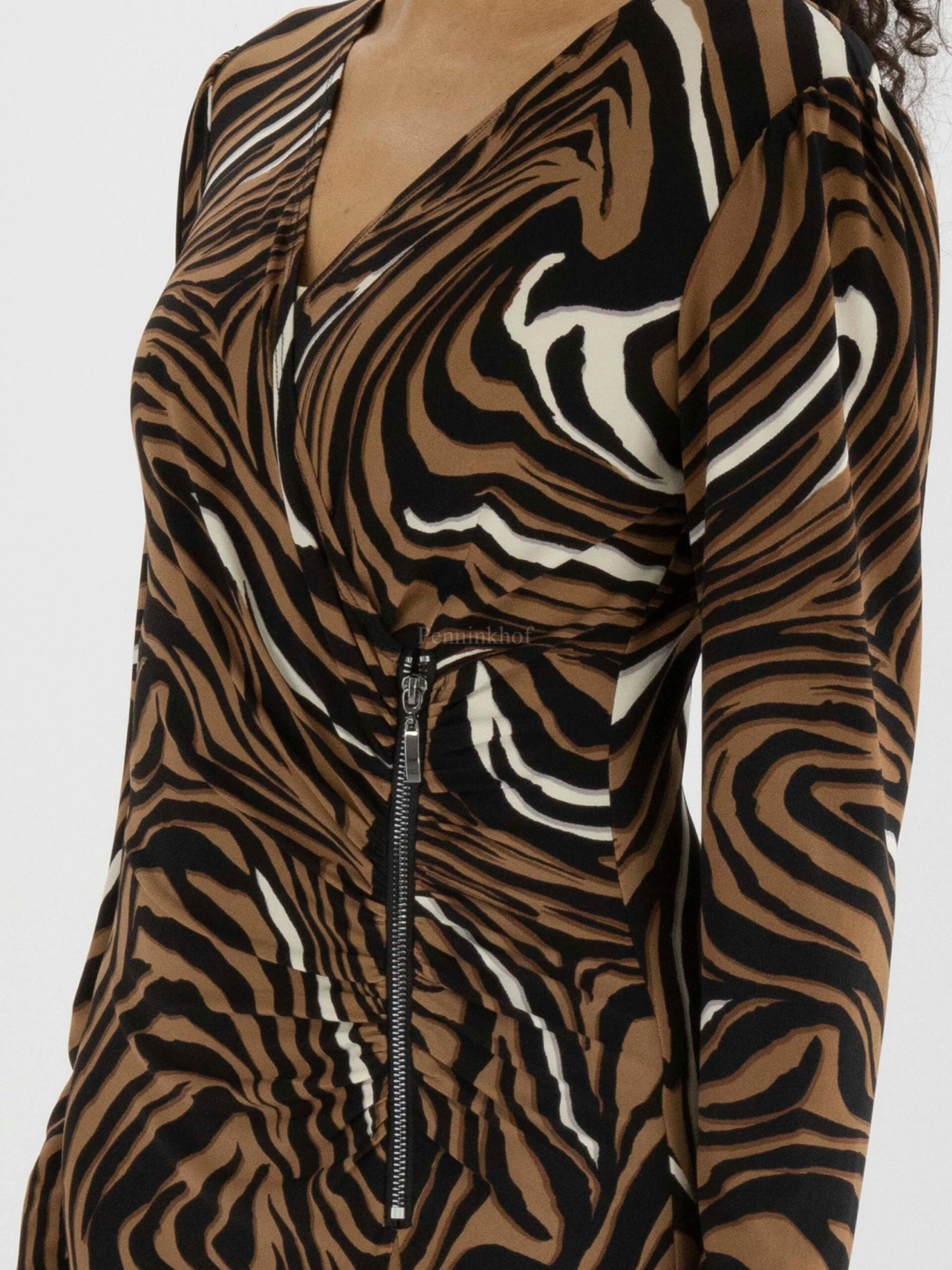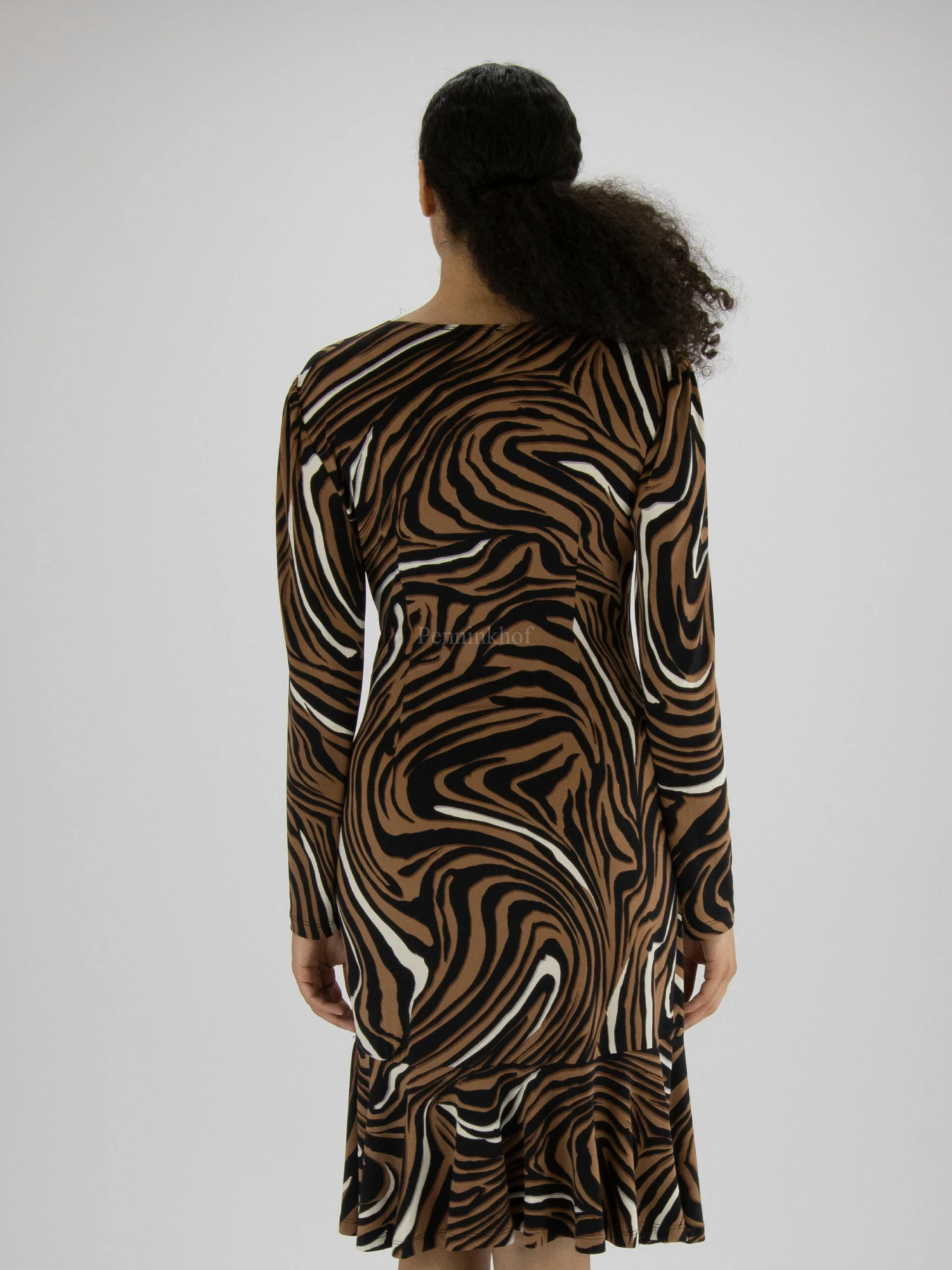 Een jurk van Joseph Ribkoff in een zebra print met meerdere tinten bruin, wit en zwart. De jurk heeft een V – Hals met een valse overslag. Vanuit de V – Hals is een korte rits waar aan beide kanten de stof fijn geplooid is wat een drapeer effect geeft. De jurk heeft een lichte A – Lijn vanuit de taille. Deze jurk mag op de hand worden gewassen.
