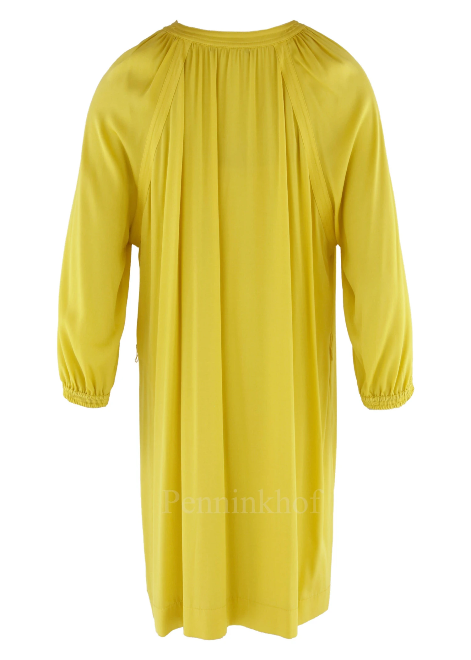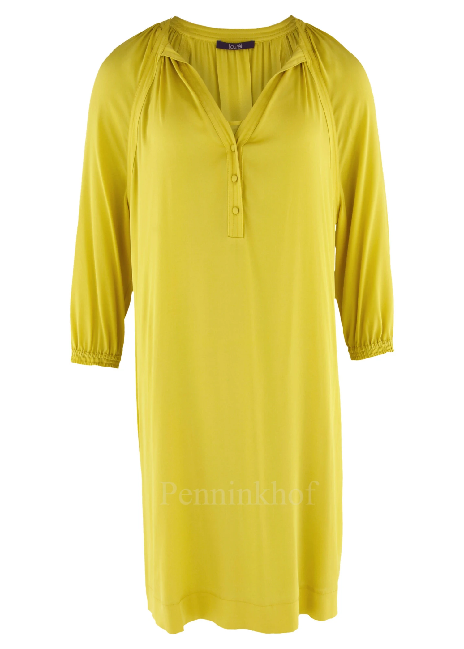 Een jurk van Laurel in een citroengele kleur. De jurk heeft een V – Hals met enkele knoopjes. Vanuit de rand van de hals aan de achterkant zijn fijne plooien. Aan het uiteinde van de halflange mouwen is een elastische bies. De jurk is gevoerd en mag niet worden gewassen.