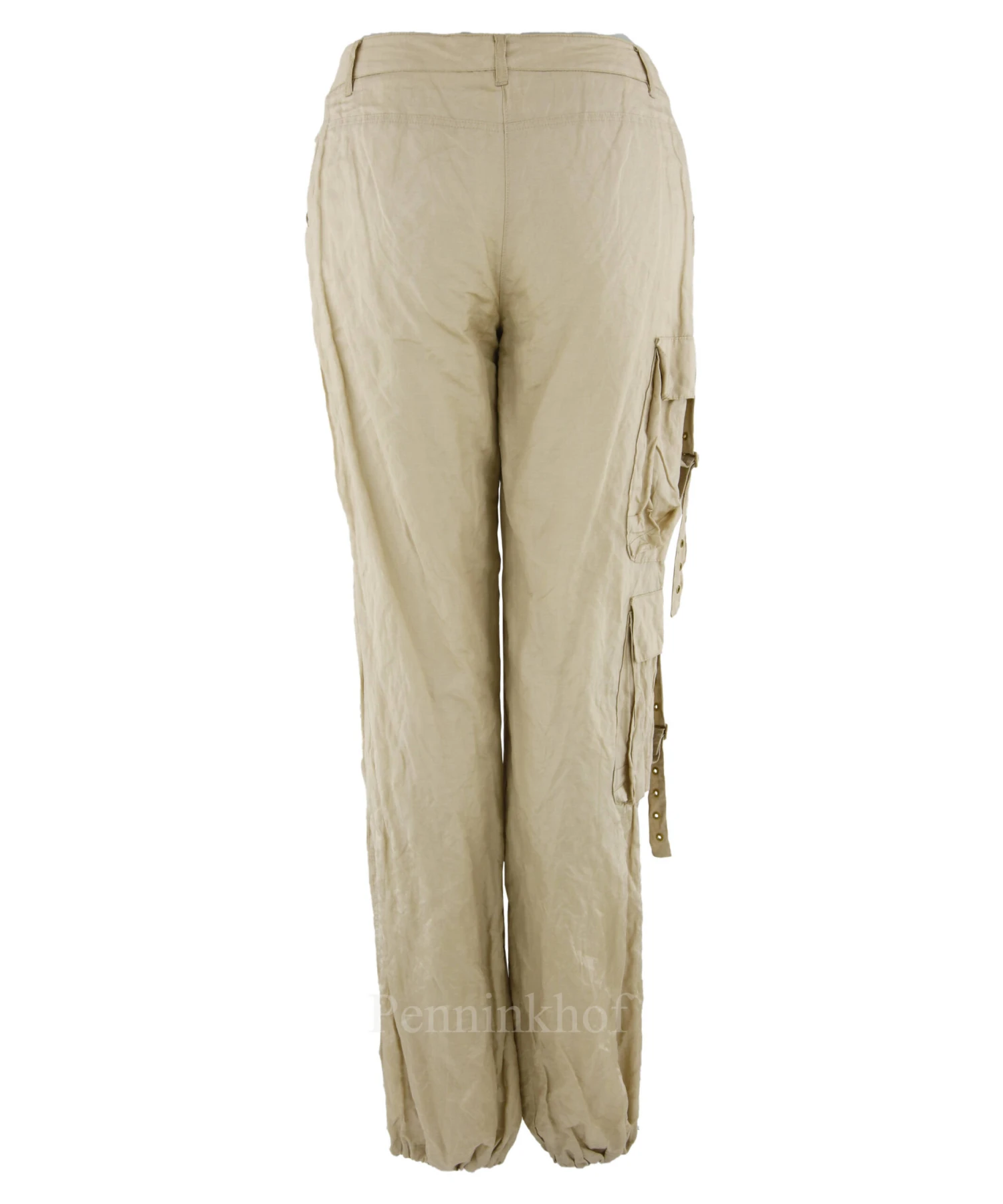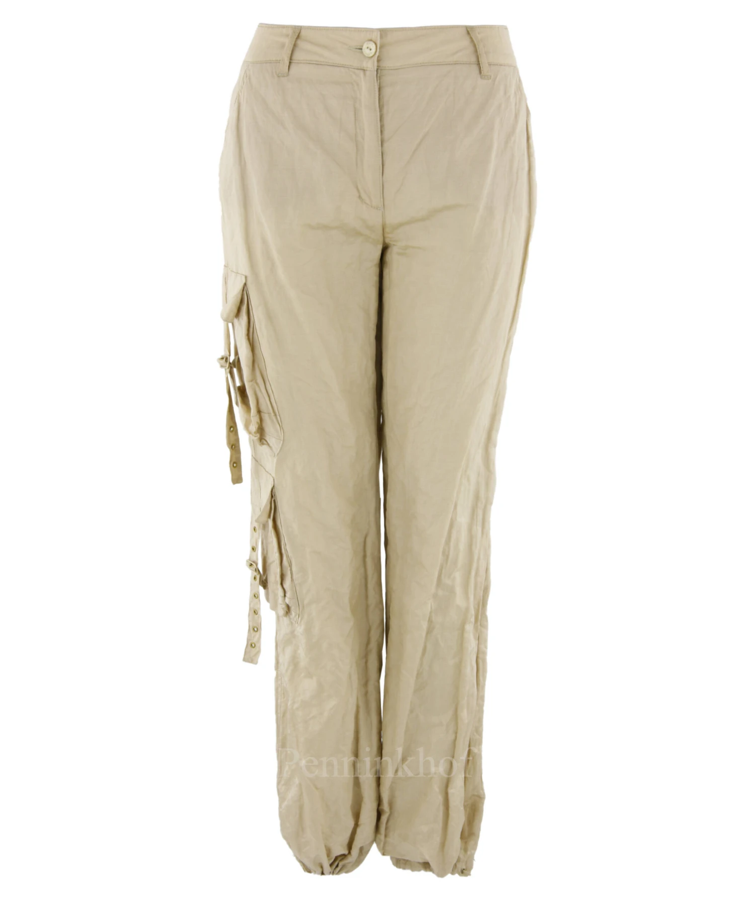 Een broek van Luisa Cerano in een glanzende zandkleur. de stof is gekreukt en op de rechter pijp is zijn boven en onder de knie 2 decoratieve zakken met een gesp. De broek heeft steekzakken en mag op de hand worden gewassen.