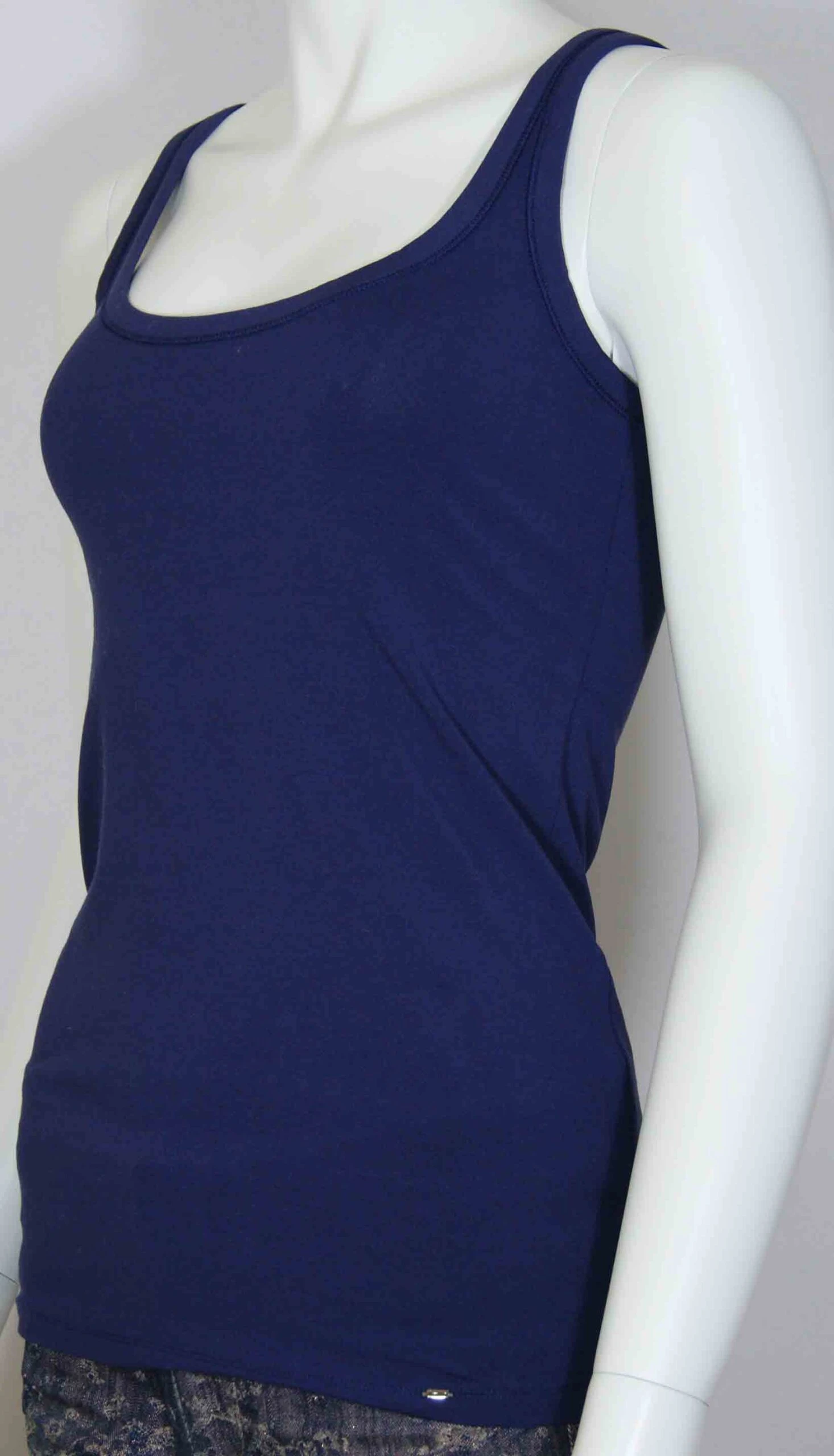 Een uni top van Marc Cain in een indigo blauwe kleur. De hals heeft een bies in dezelfde kleur en materiaal als de top. De top mag op 30 Graden worden gewassen.