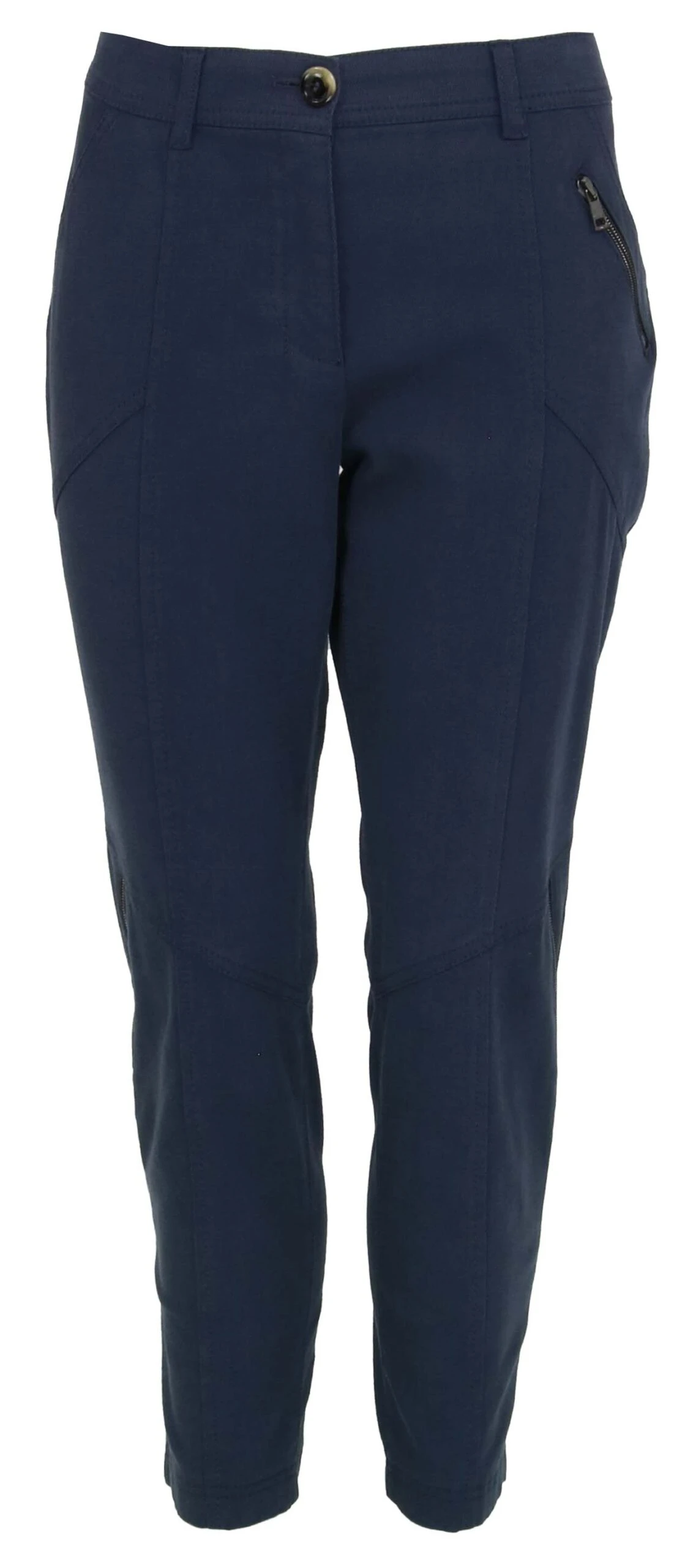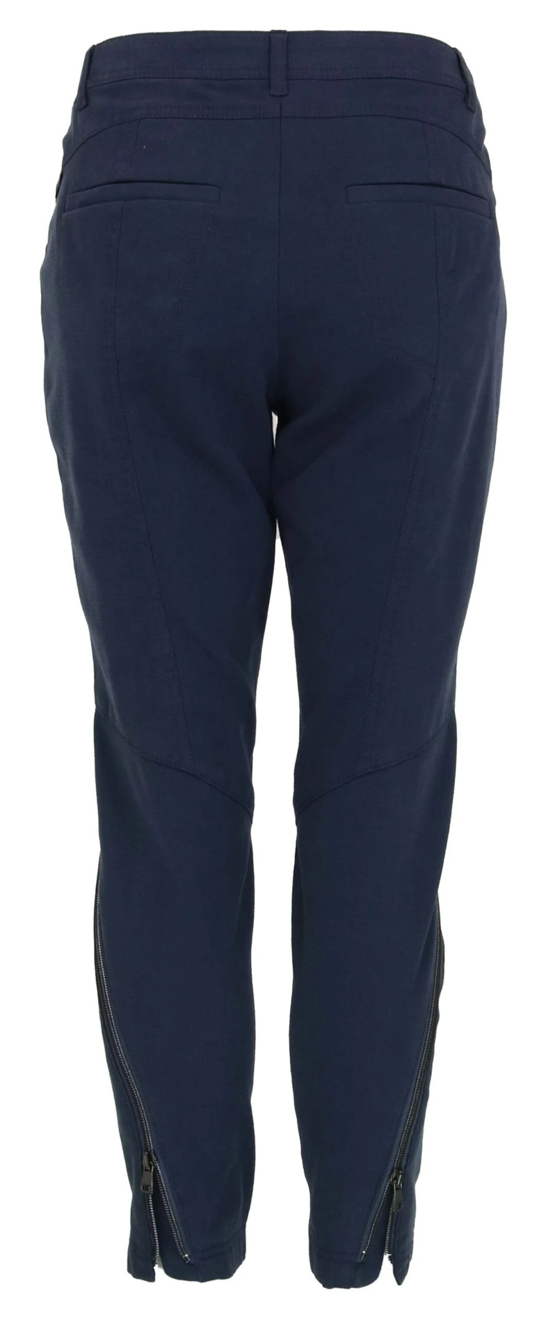 Een broek van Marc Cain in een blauwe kleur. De broek heeft één ritsje op de linker steekzak. Onder de knie zijn diagonaal ritsen ingezet die naar het achterpand weglopen. De broek mag op 30 graden worden gewassen.