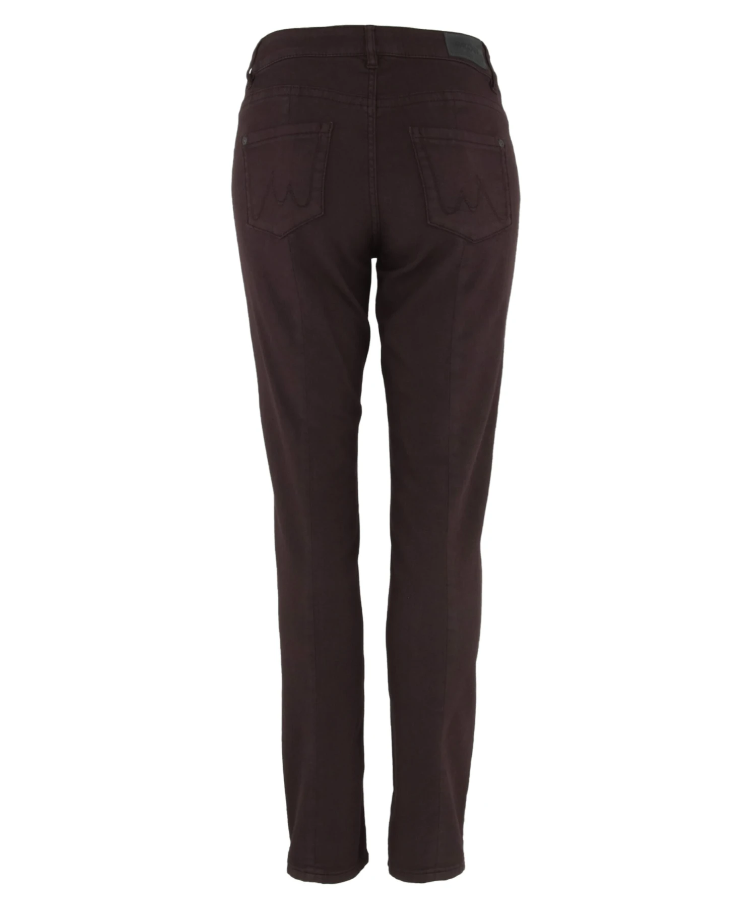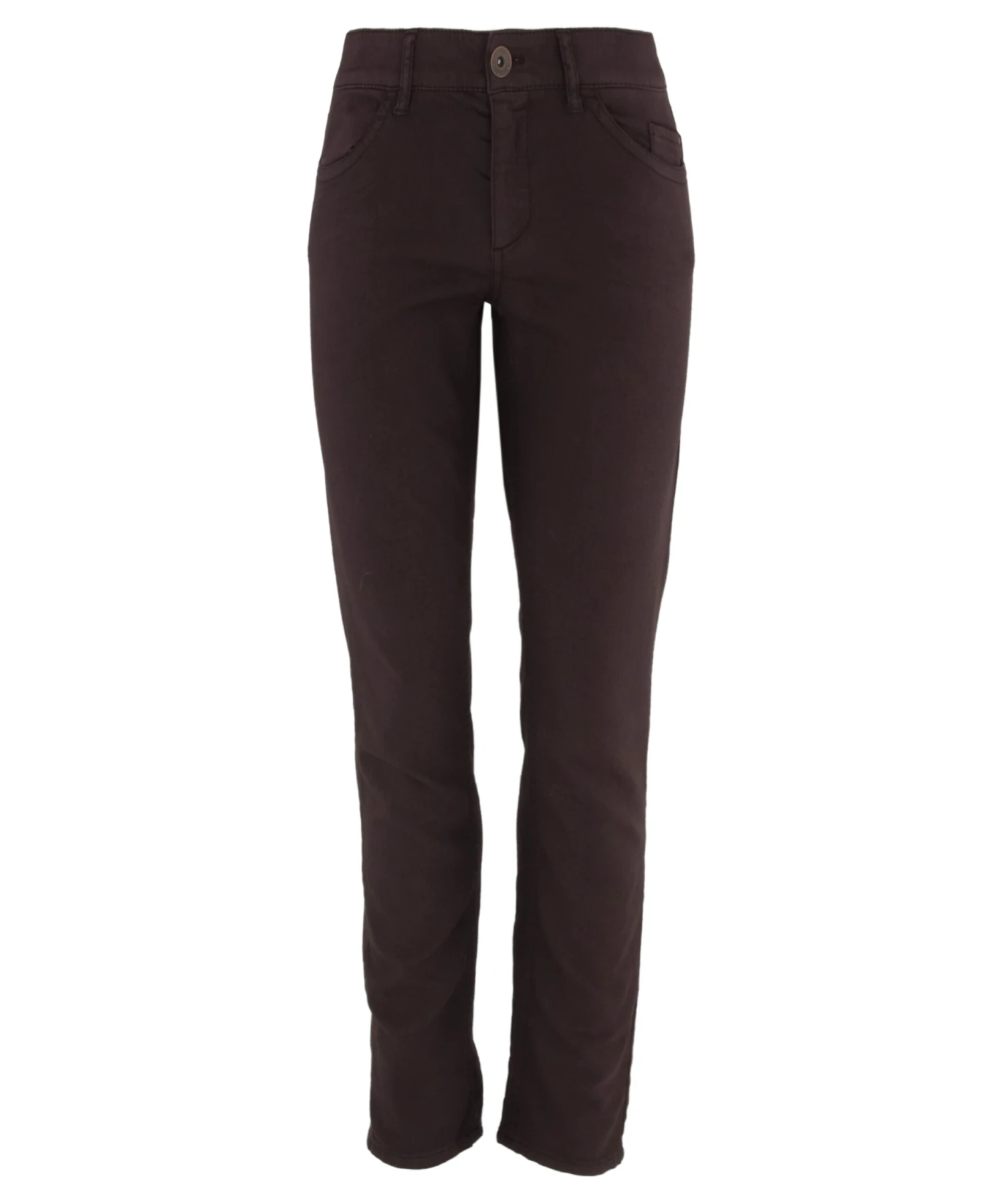 Een jeans van het merk Marc Cain in de kleur aubergine. De jeans is een 5 pocket model en heeft een slank toelopende pijp. Deze jeans mag op 30 graden worden gewassen.