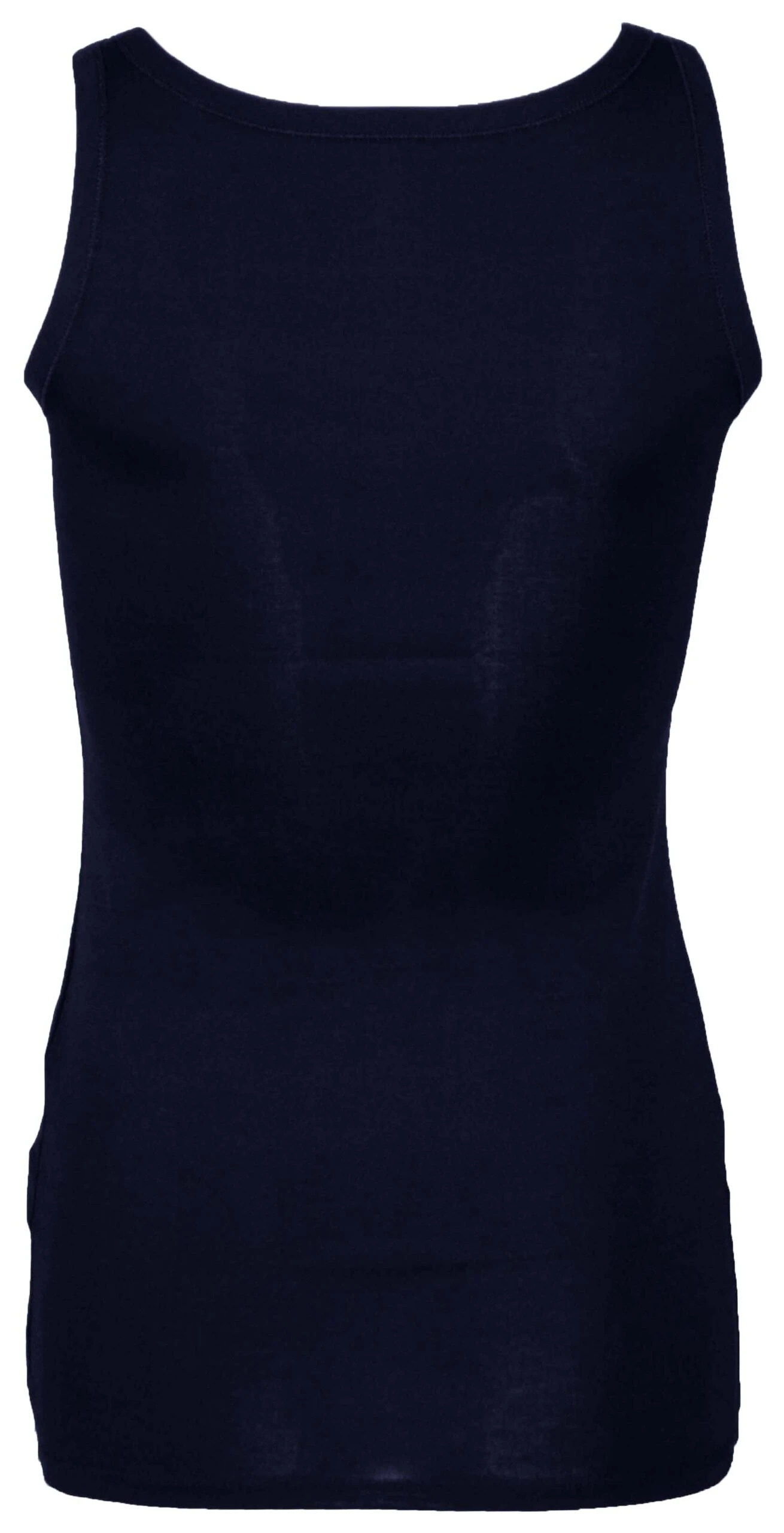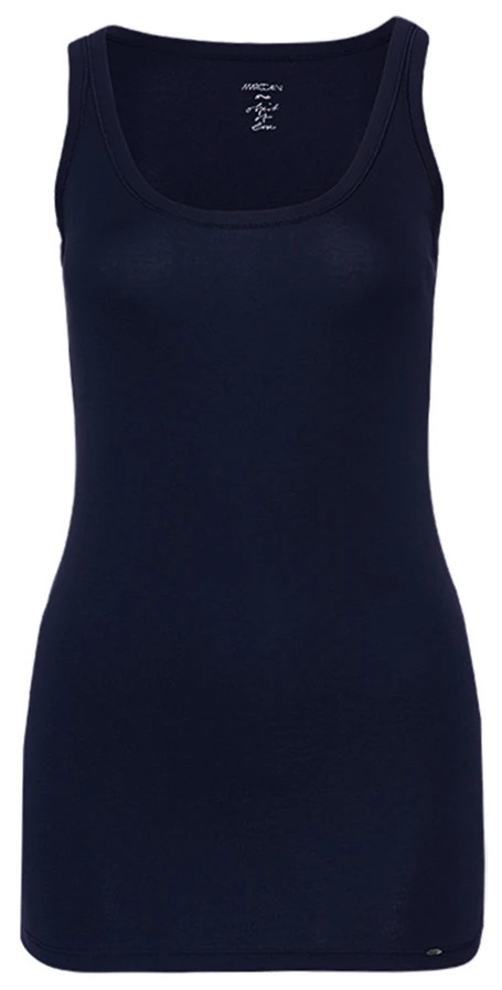 Een top van het merk Marc Cain uit de essentiels collectie in de kleur marine blauw. De top heeft een ronde hals en een schouderband van 3 cm breed. Deze top mag op 30 graden worden gewassen.
