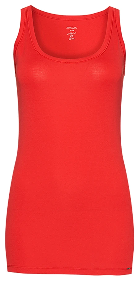 Een top van het merk Marc Cain uit de essentiels collectie in de kleur rood. De top heeft een ronde hals en een schouderband van 3 cm breed. Deze top mag op 30 graden worden gewassen.