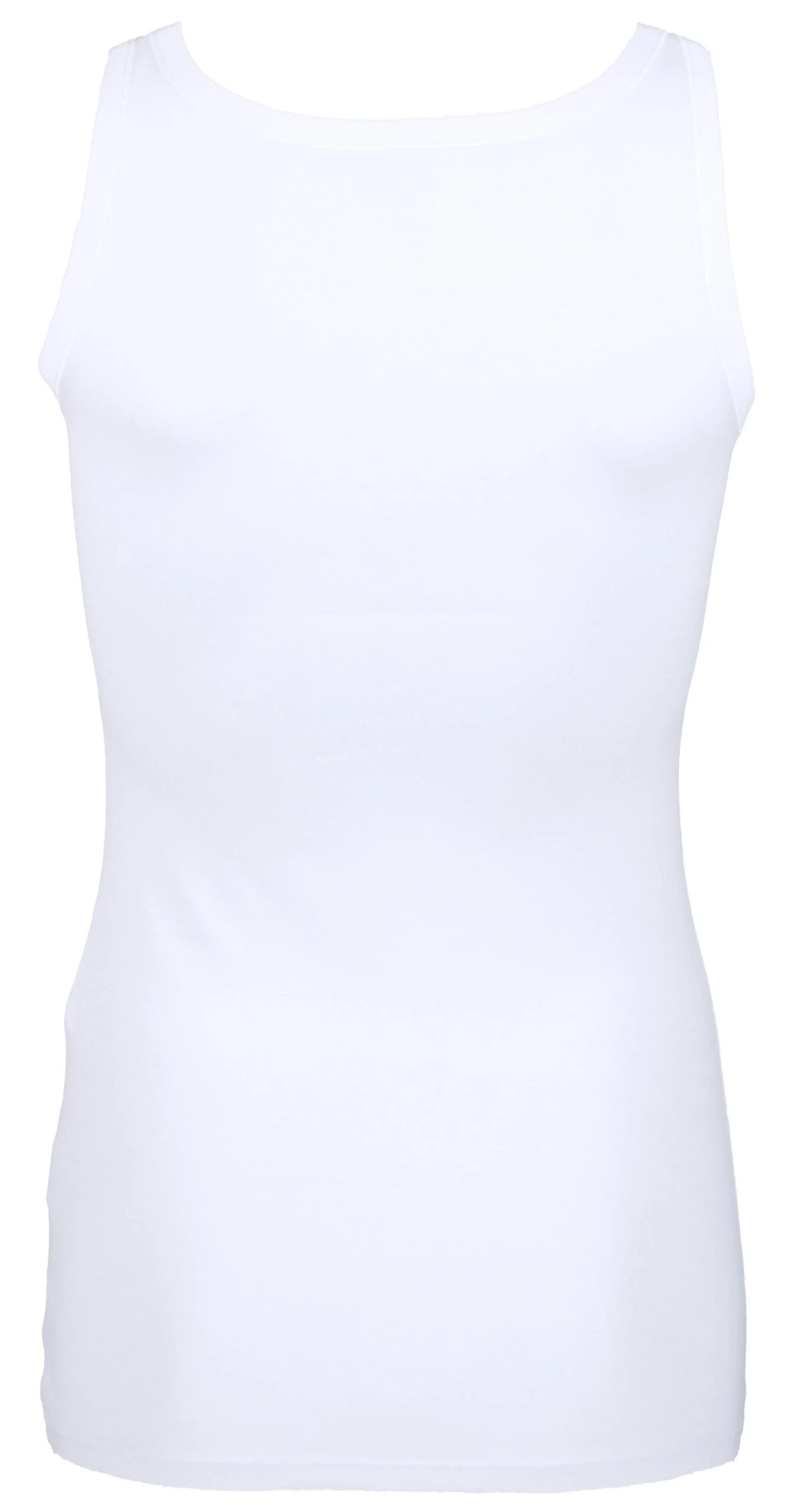 Een top van het merk Marc Cain uit de essentiels collectie in de kleur wit. De top heeft een ronde hals en een schouderband van 3 cm breed. Deze top mag op 30 graden worden gewassen.