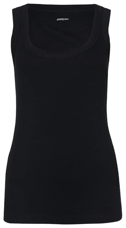 Een basis top van het merk Marc Cain essentiels in de kleur zwart. De top heeft een ronde hals en is licht getailleerd. De schouderbandjes zijn 3 cm breed. Deze top mag op 30 graden worden gewassen.