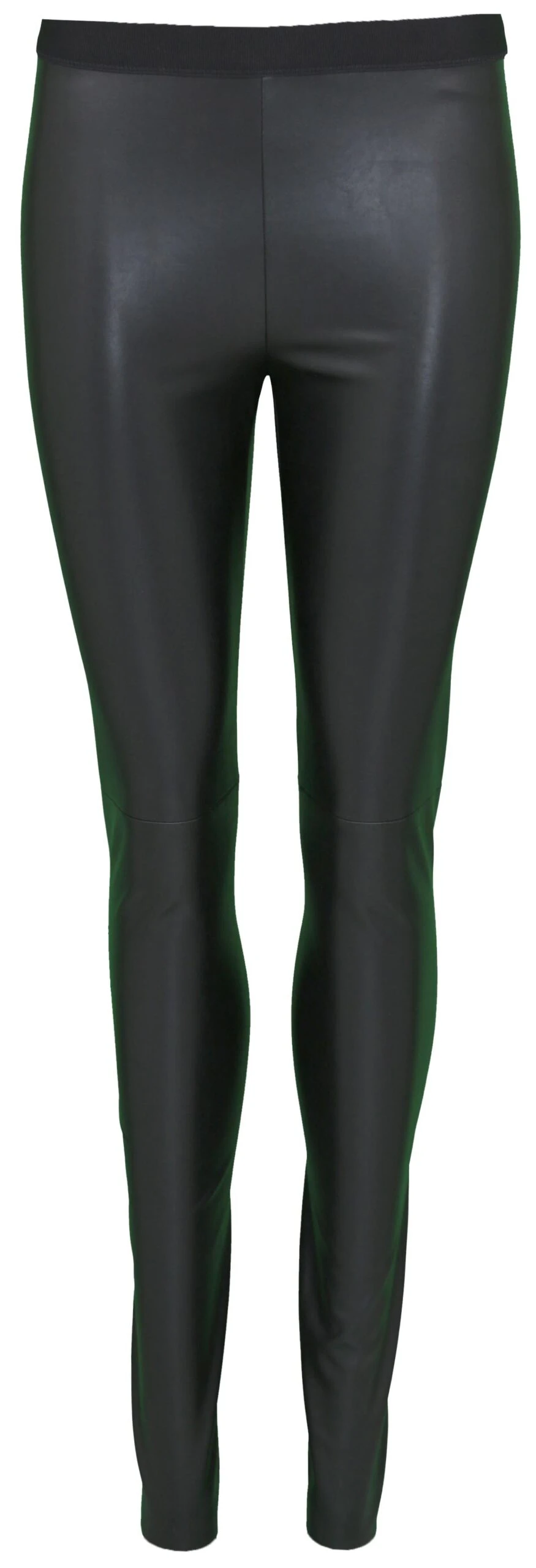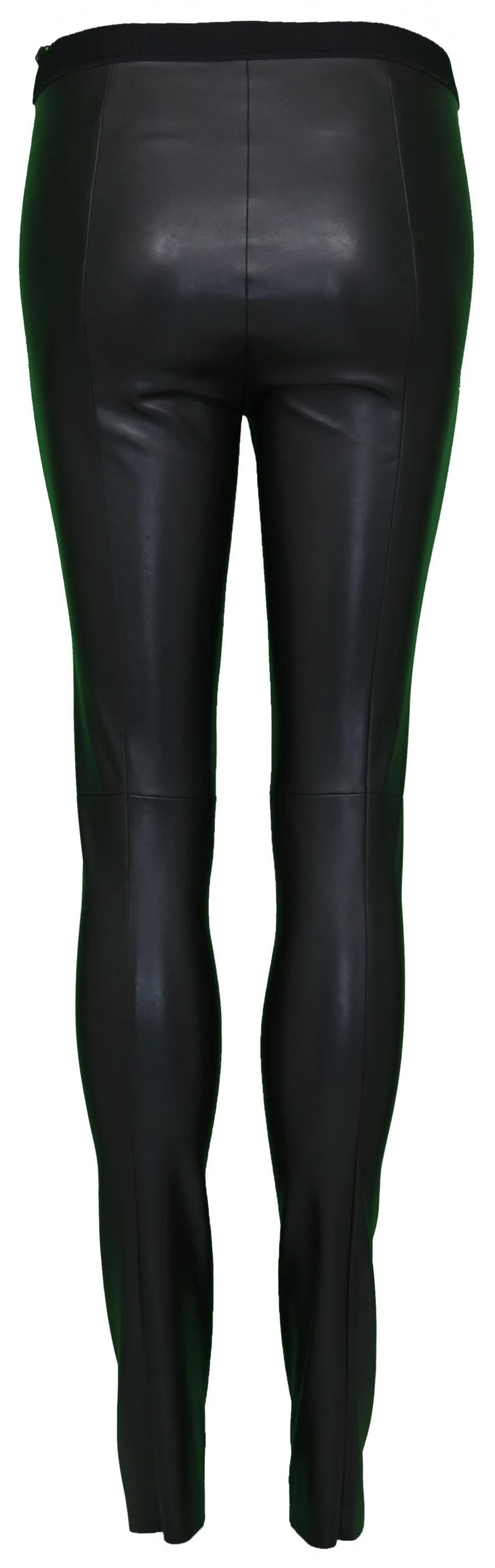 Een broek van het merk Marc Cain essentiels in een imitatie lederen stof in de kleur zwart. De stof is elastisch. In de taille is een elastieken band van 3 cm breed. Deze broek mag op 30 graden worden gewassen.