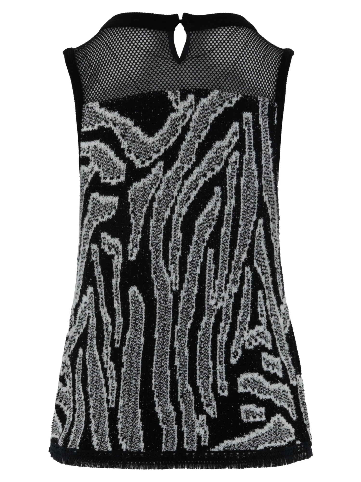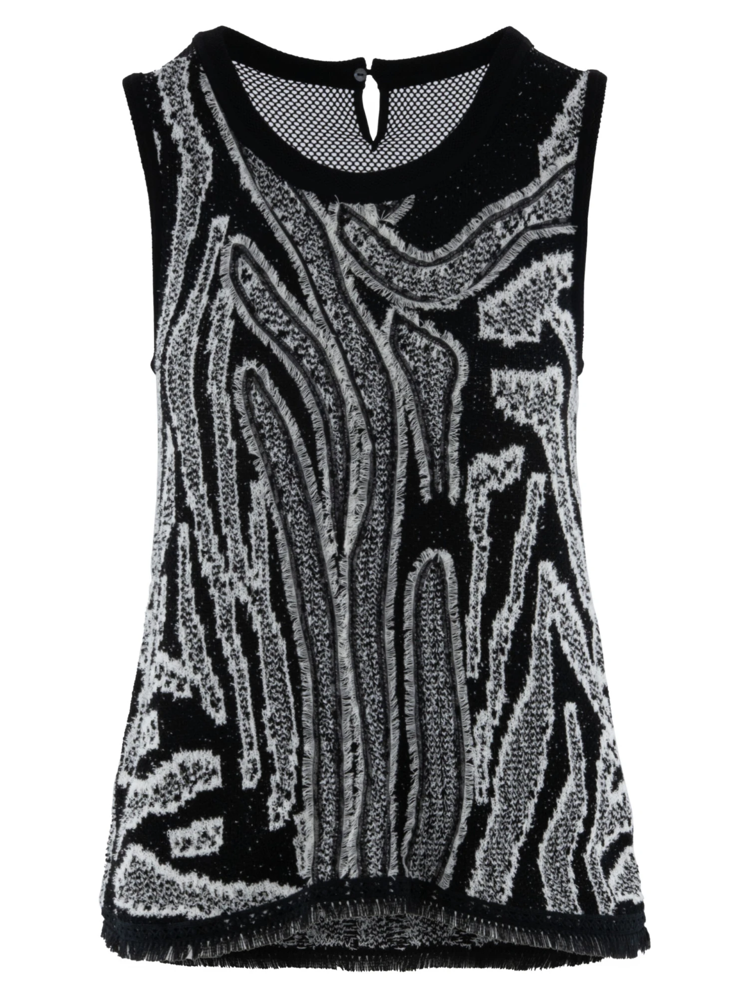 Een top van het merk Marc Cain in een print met de kleuren zwart en wit. In de print zijn fijne rafeltjes verwerkt. Vanuit de schouderbandjes naar achteren is een deel van de top in een net structuur gemaakt. Deze top mag op 30 graden worden gewassen.
