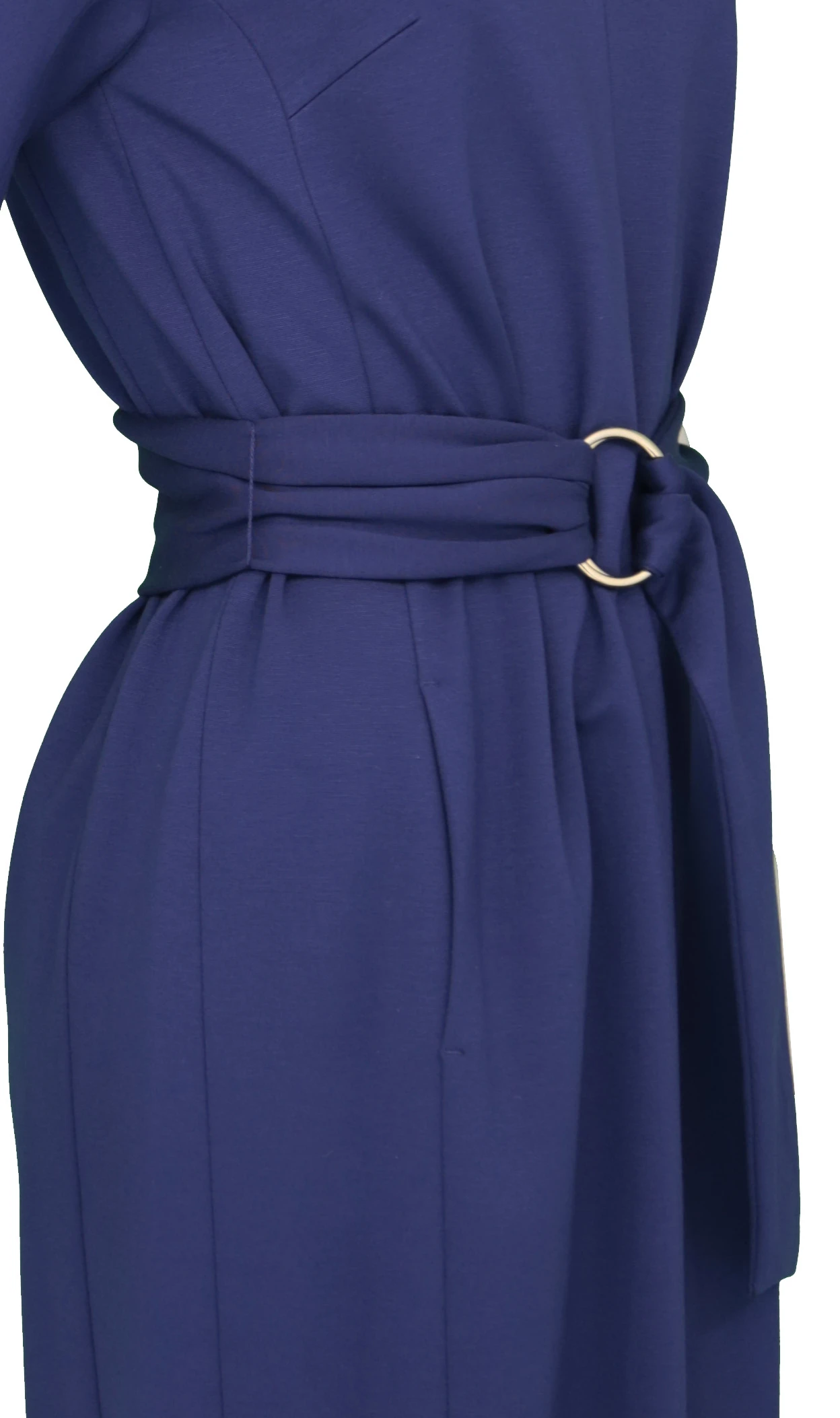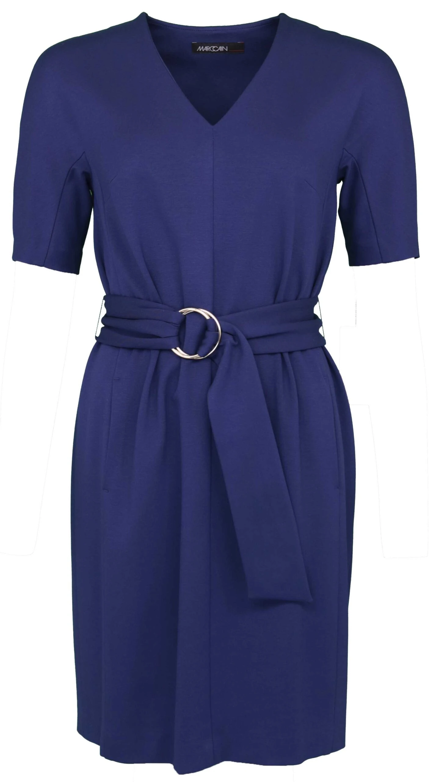Een jurk van het merk Marc Cain in een indigo blauwe kleur. In de taille is vanuit de achterzijde een band naar voren welke met een knoop en 2 ronde messing ringen is bevestigd. De jurk heeft korte mouwen, een ronde hals en heeft een losse binnenvoering. Deze jurk mag op 30 graden worden gewassen.rn